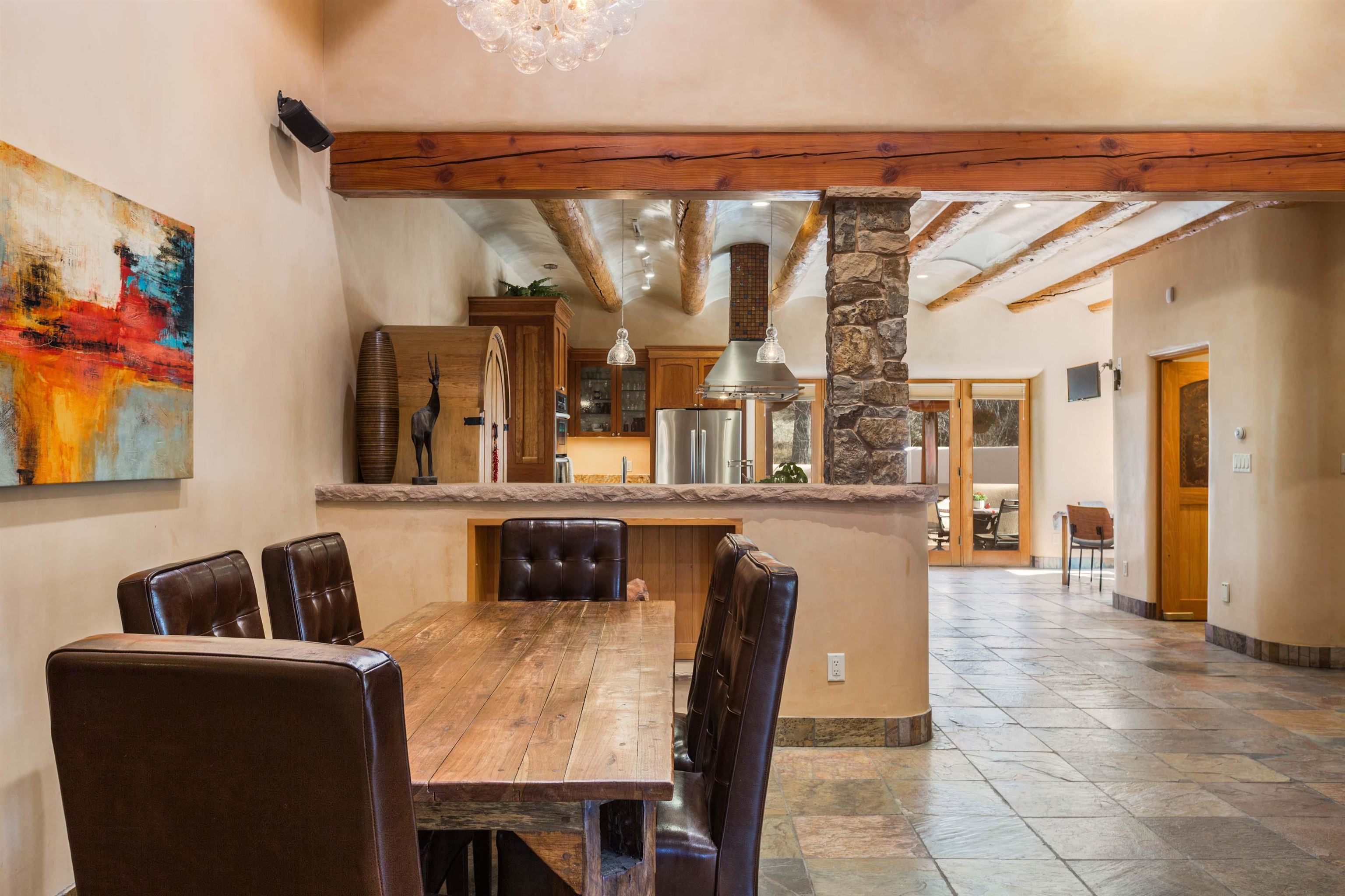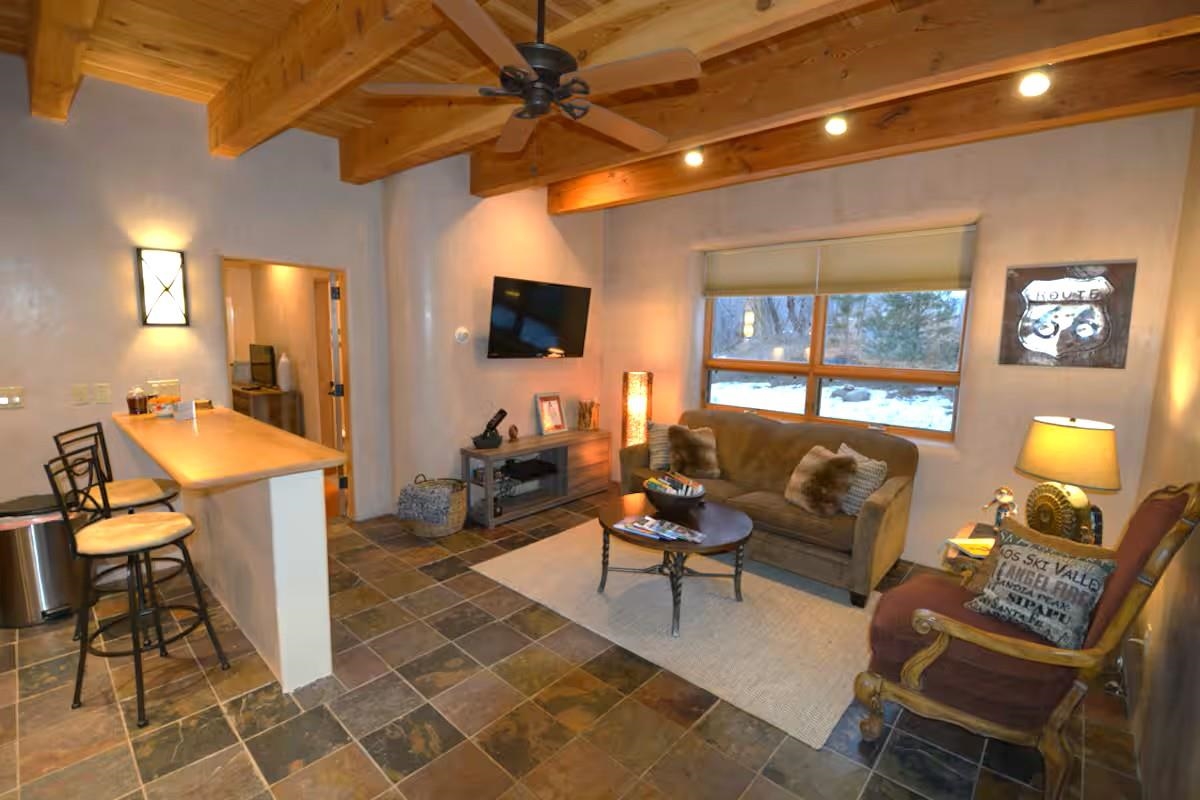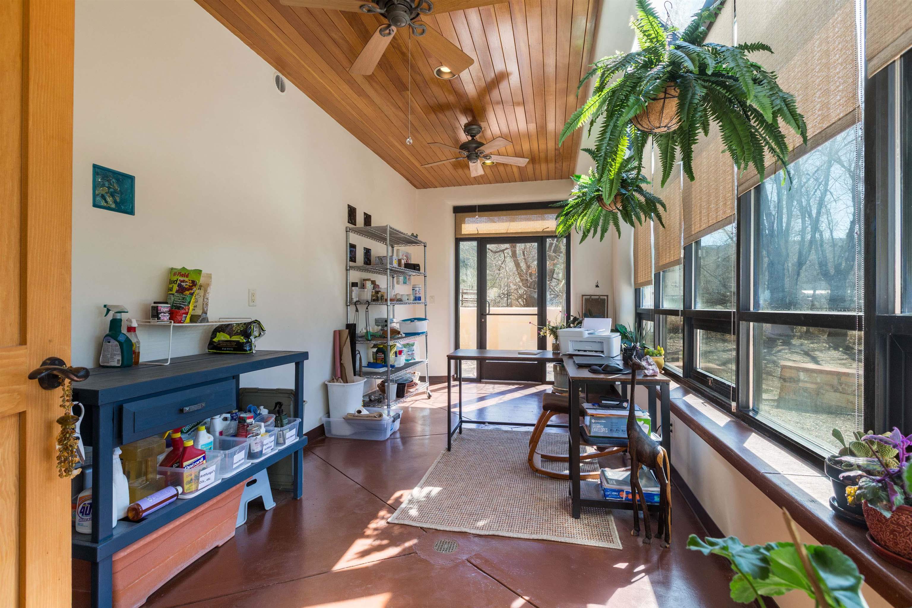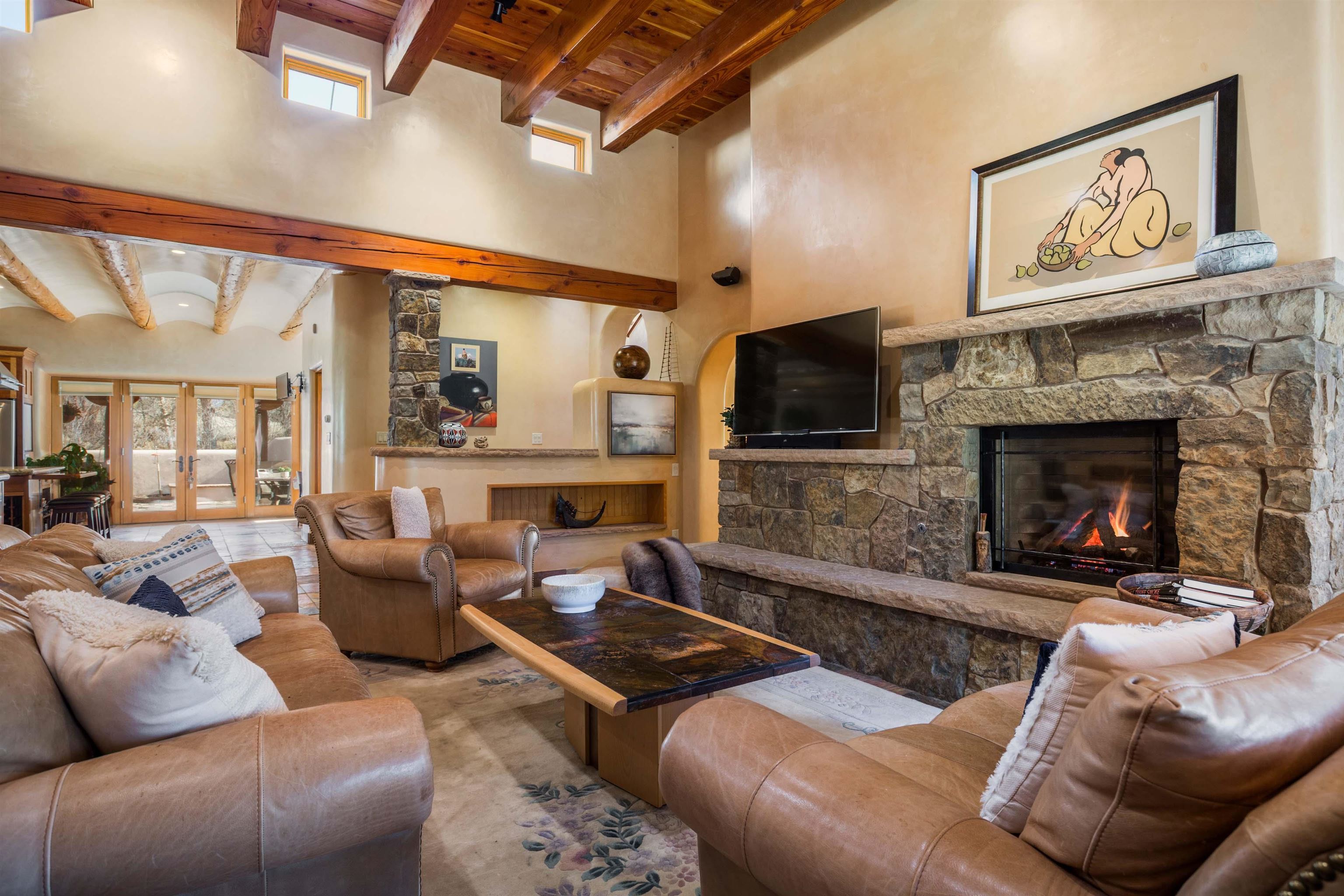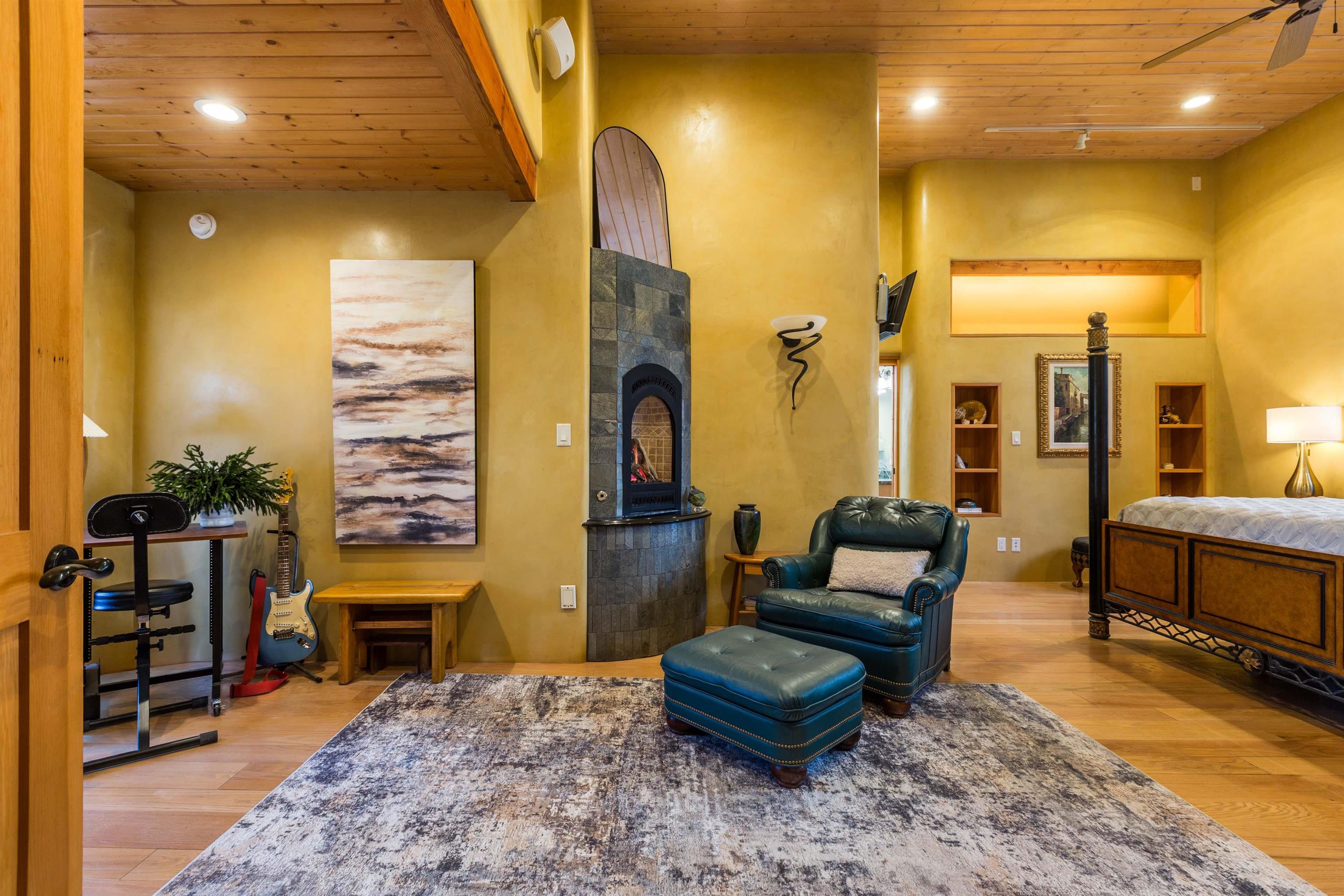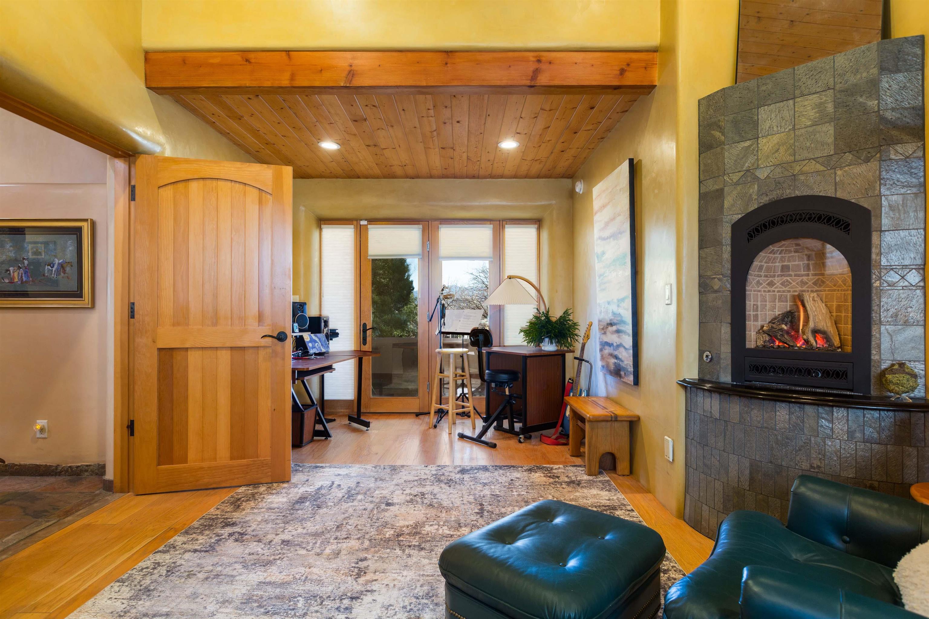 Welcome to your Oasis!! Set within the breathtaking high desert landscape of Taos and minutes from the Plaza. This extraordinary first time on the market, private estate offers a rare blend of timeless Northern New Mexico architecture, artisanal craftsmanship, and self-sustaining luxury. Built by Paul Rotman with substantial 18-inch thick Rastra Block walls, the residence embodies the enduring character of traditional adobe-style design while incorporating refined modern comfort. From the moment you enter through the handcrafted adobe entryway constructed with approximately 100-year-old bricks, the home reveals a level of artistry rarely found in traditional builds. Fourteen-foot ceilings, graceful coved ceilings in the kitchen, and diamond-finish plaster walls tinted with natural mineral pigments create a warm, sculptural interior that reflects the region's rich architectural heritage. The chef's kitchen is both bold and elegant, featuring granite countertops with full bullnose edges, custom cherry cabinetry, double ovens, and an intimate breakfast nook. Living spaces are anchored by gas fireplaces and custom stonework by renowned artisan Bob Loveless, complemented by natural stone tile flooring and expansive light-filled gathering areas including a tranquil sunroom. The primary suite offers a luxurious retreat with distinctive green marble accents in the bath, while upstairs cherry wood flooring adds warmth and refinement. Comfort throughout the home is provided by radiant floor heating, supplemental wall heaters, and a Navien high-efficiency boiler installed in February 2026. A charming casita with tongue-and-groove ceilings crafted from 400-year-old reclaimed wood provides exceptional guest accommodations or private retreat space. Beyond the residence, the property unfolds into an extraordinary multi-use compound. A heated three-car garage, artist studio, heated woodworking shop with professional dust collection system, and fitness room with full bath and laundry hookups create unmatched flexibility for creative pursuits, wellness, or home-based enterprises. The grounds themselves form a true Taos sanctuary. With 7+ acres of mature gardens and landscaping surround a productive orchard of apple, pear, apricot, cherry, peach, and plum trees, alongside flowering perennials and majestic Austrian pine, Colorado blue spruce, and bristlecone pines. Additional agricultural features include a tree nursery, chicken coop, bee house, hoop house, and irrigation access off the mother ditch. Designed for both sustainability and independence, the estate includes two wells (one solar powered), two cisterns, a five-zone in-ground irrigation system, RV hookups with water and 30-amp service, and a back porch pre-wired for a hot tub--perfect for enjoying the quiet beauty and star-filled skies of northern New Mexico. This exceptional offering represents a rare opportunity to own a private high-desert compound where craftsmanship, land stewardship, and luxury living come together in one remarkable Taos property.