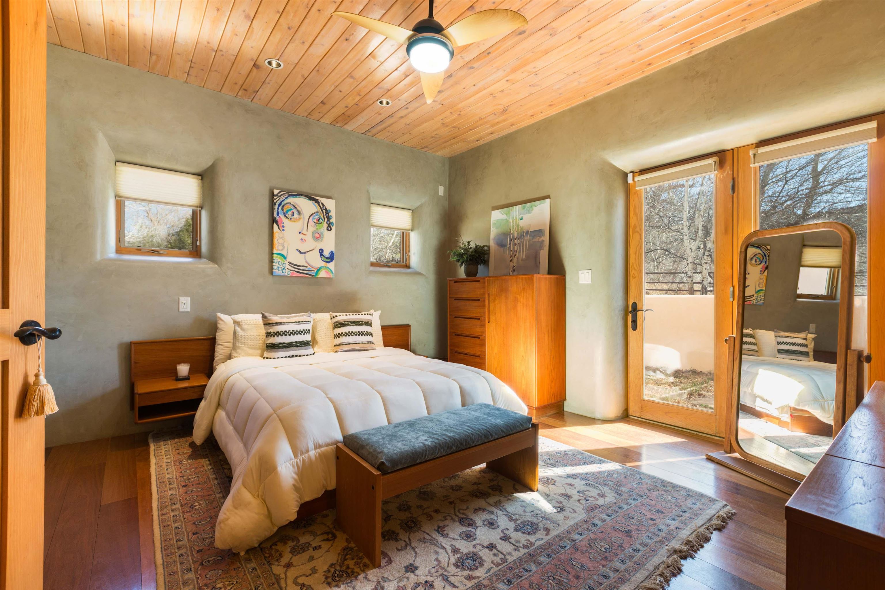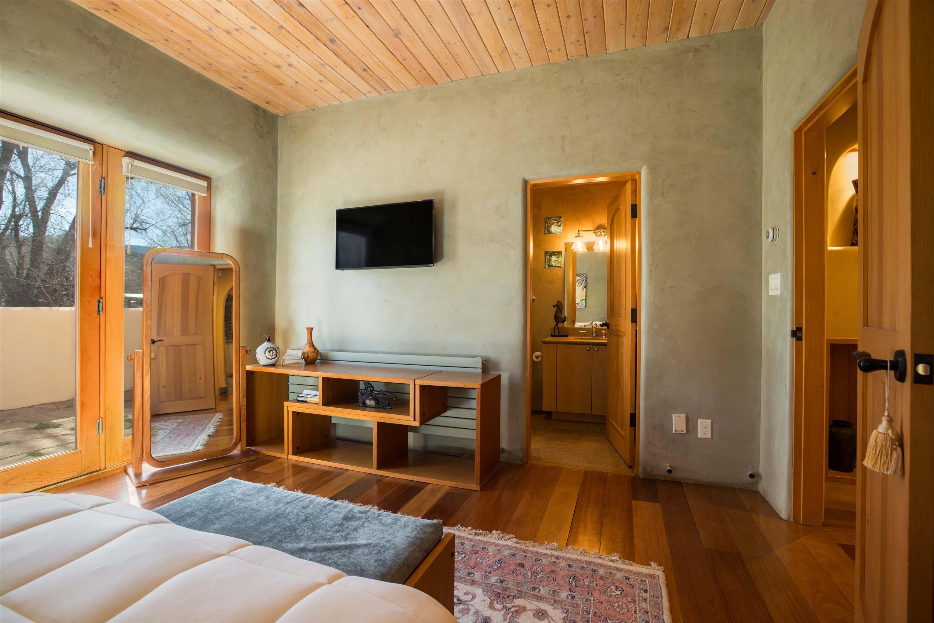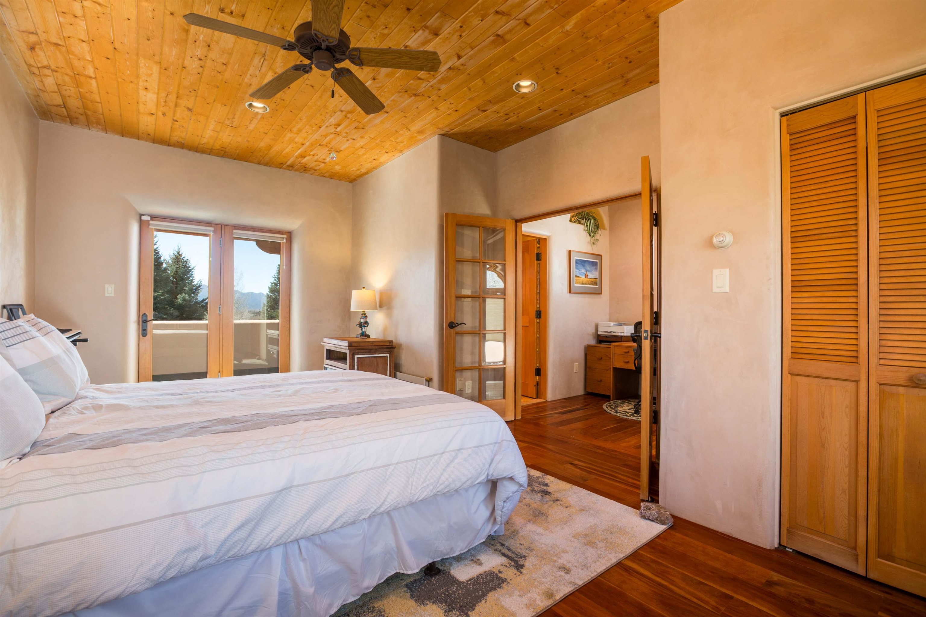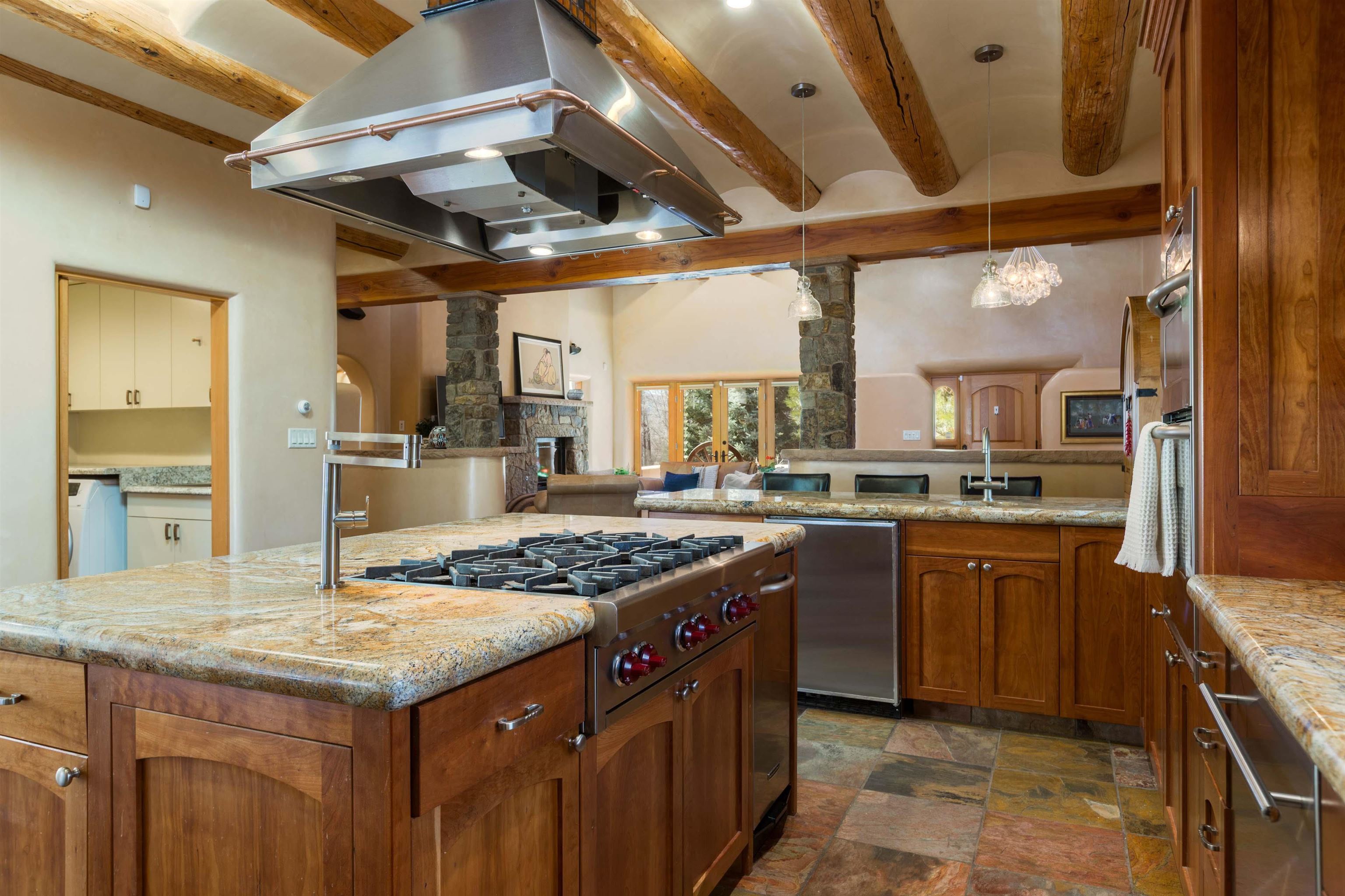 Welcome to your Oasis!! Set within the breathtaking high desert landscape of Taos and minutes from the Plaza. This extraordinary first time on the market, private estate offers a rare blend of timeless Northern New Mexico architecture, artisanal craftsmanship, and self-sustaining luxury. Built by Paul Rotman with substantial 18-inch thick Rastra Block walls, the residence embodies the enduring character of traditional adobe-style design while incorporating refined modern comfort. From the moment you enter through the handcrafted adobe entryway constructed with approximately 100-year-old bricks, the home reveals a level of artistry rarely found in traditional builds. Fourteen-foot ceilings, graceful coved ceilings in the kitchen, and diamond-finish plaster walls tinted with natural mineral pigments create a warm, sculptural interior that reflects the region's rich architectural heritage. The chef's kitchen is both bold and elegant, featuring granite countertops with full bullnose edges, custom cherry cabinetry, double ovens, and an intimate breakfast nook. Living spaces are anchored by gas fireplaces and custom stonework by renowned artisan Bob Loveless, complemented by natural stone tile flooring and expansive light-filled gathering areas including a tranquil sunroom. The primary suite offers a luxurious retreat with distinctive green marble accents in the bath, while upstairs cherry wood flooring adds warmth and refinement. Comfort throughout the home is provided by radiant floor heating, supplemental wall heaters, and a Navien high-efficiency boiler installed in February 2026. A charming casita with tongue-and-groove ceilings crafted from 400-year-old reclaimed wood provides exceptional guest accommodations or private retreat space. Beyond the residence, the property unfolds into an extraordinary multi-use compound. A heated three-car garage, artist studio, heated woodworking shop with professional dust collection system, and fitness room with full bath and laundry hookups create unmatched flexibility for creative pursuits, wellness, or home-based enterprises. The grounds themselves form a true Taos sanctuary. With 7+ acres of mature gardens and landscaping surround a productive orchard of apple, pear, apricot, cherry, peach, and plum trees, alongside flowering perennials and majestic Austrian pine, Colorado blue spruce, and bristlecone pines. Additional agricultural features include a tree nursery, chicken coop, bee house, hoop house, and irrigation access off the mother ditch. Designed for both sustainability and independence, the estate includes two wells (one solar powered), two cisterns, a five-zone in-ground irrigation system, RV hookups with water and 30-amp service, and a back porch pre-wired for a hot tub--perfect for enjoying the quiet beauty and star-filled skies of northern New Mexico. This exceptional offering represents a rare opportunity to own a private high-desert compound where craftsmanship, land stewardship, and luxury living come together in one remarkable Taos property.