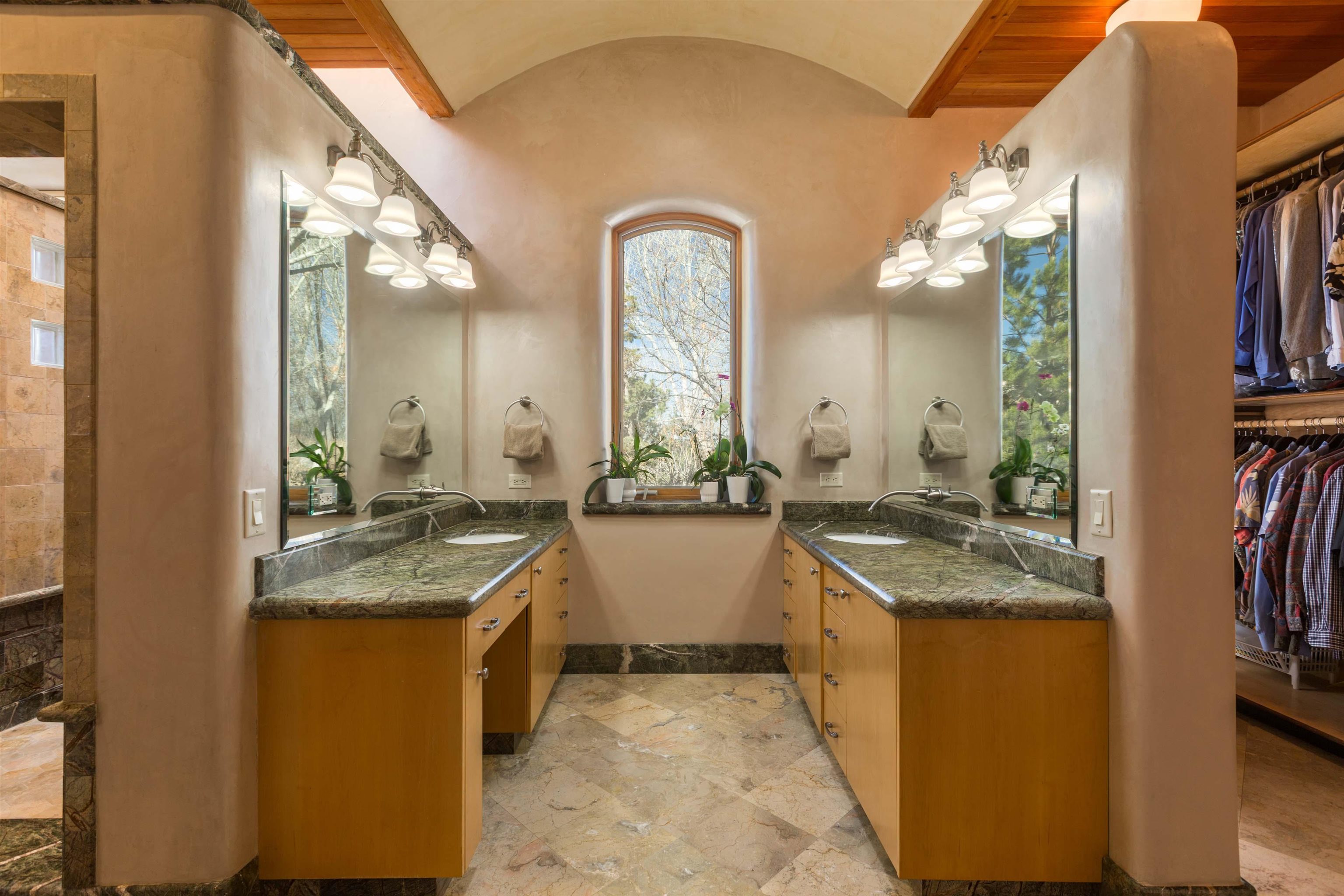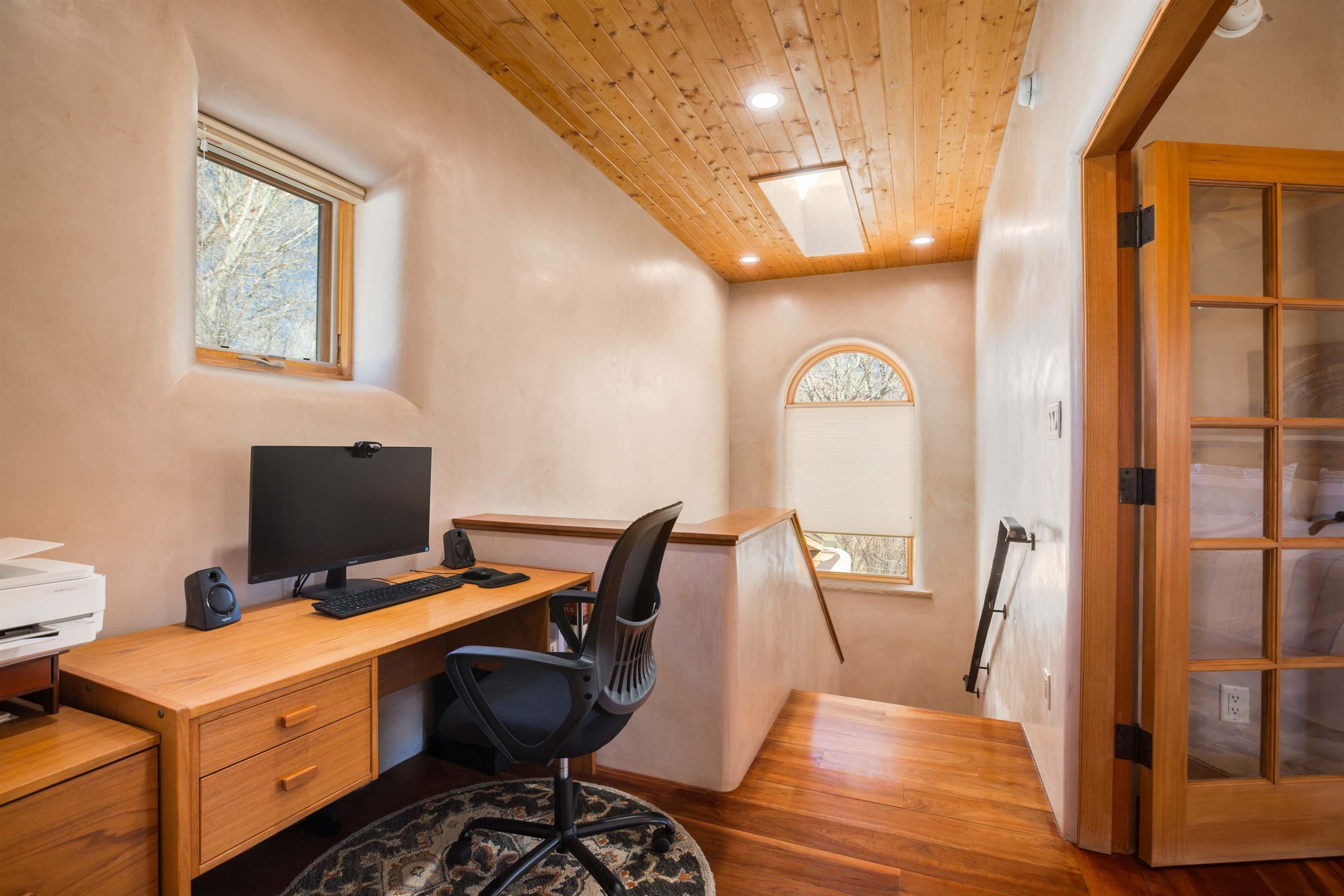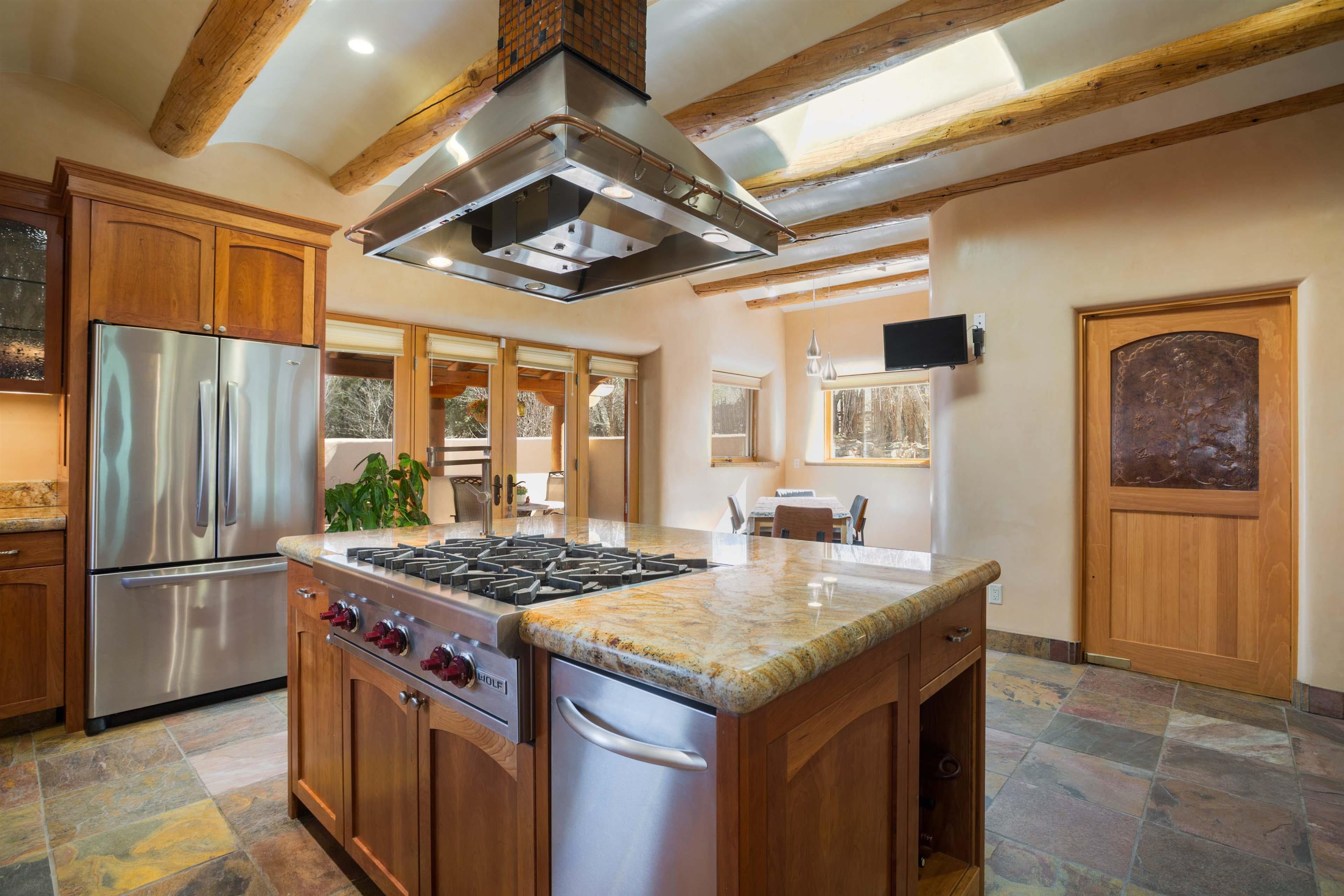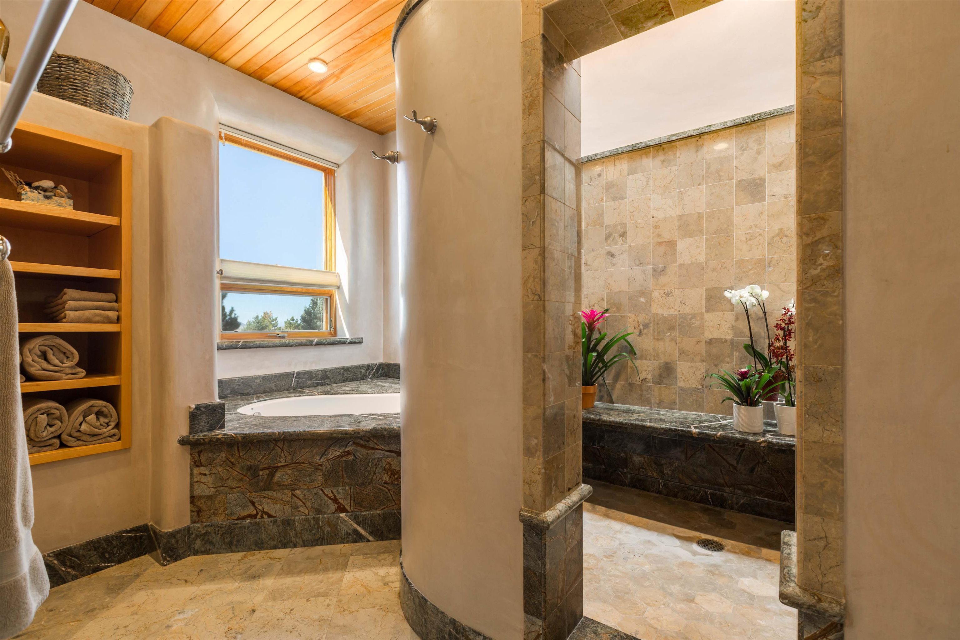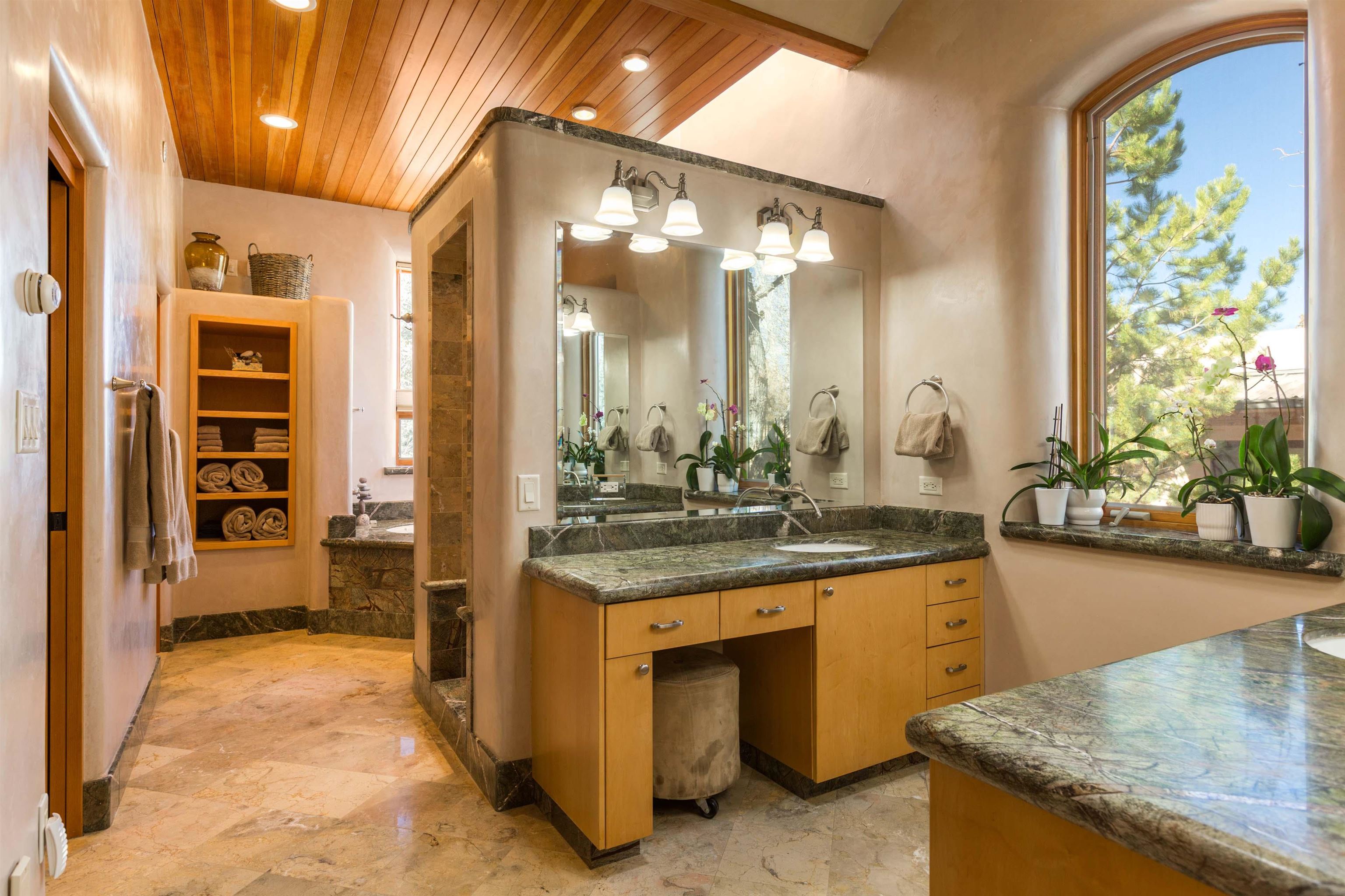Welcome to your Oasis!! Set within the breathtaking high desert landscape of Taos and minutes from the Plaza. This extraordinary first time on the market, private estate offers a rare blend of timeless Northern New Mexico architecture, artisanal craftsmanship, and self-sustaining luxury. Built by Paul Rotman with substantial 18-inch thick Rastra Block walls, the residence embodies the enduring character of traditional adobe-style design while incorporating refined modern comfort. From the moment you enter through the handcrafted adobe entryway constructed with approximately 100-year-old bricks, the home reveals a level of artistry rarely found in traditional builds. Fourteen-foot ceilings, graceful coved ceilings in the kitchen, and diamond-finish plaster walls tinted with natural mineral pigments create a warm, sculptural interior that reflects the region's rich architectural heritage. The chef's kitchen is both bold and elegant, featuring granite countertops with full bullnose edges, custom cherry cabinetry, double ovens, and an intimate breakfast nook. Living spaces are anchored by gas fireplaces and custom stonework by renowned artisan Bob Loveless, complemented by natural stone tile flooring and expansive light-filled gathering areas including a tranquil sunroom. The primary suite offers a luxurious retreat with distinctive green marble accents in the bath, while upstairs cherry wood flooring adds warmth and refinement. Comfort throughout the home is provided by radiant floor heating, supplemental wall heaters, and a Navien high-efficiency boiler installed in February 2026. A charming casita with tongue-and-groove ceilings crafted from 400-year-old reclaimed wood provides exceptional guest accommodations or private retreat space. Beyond the residence, the property unfolds into an extraordinary multi-use compound. A heated three-car garage, artist studio, heated woodworking shop with professional dust collection system, and fitness room with full bath and laundry hookups create unmatched flexibility for creative pursuits, wellness, or home-based enterprises. The grounds themselves form a true Taos sanctuary. With 7+ acres of mature gardens and landscaping surround a productive orchard of apple, pear, apricot, cherry, peach, and plum trees, alongside flowering perennials and majestic Austrian pine, Colorado blue spruce, and bristlecone pines. Additional agricultural features include a tree nursery, chicken coop, bee house, hoop house, and irrigation access off the mother ditch. Designed for both sustainability and independence, the estate includes two wells (one solar powered), two cisterns, a five-zone in-ground irrigation system, RV hookups with water and 30-amp service, and a back porch pre-wired for a hot tub--perfect for enjoying the quiet beauty and star-filled skies of northern New Mexico. This exceptional offering represents a rare opportunity to own a private high-desert compound where craftsmanship, land stewardship, and luxury living come together in one remarkable Taos property.