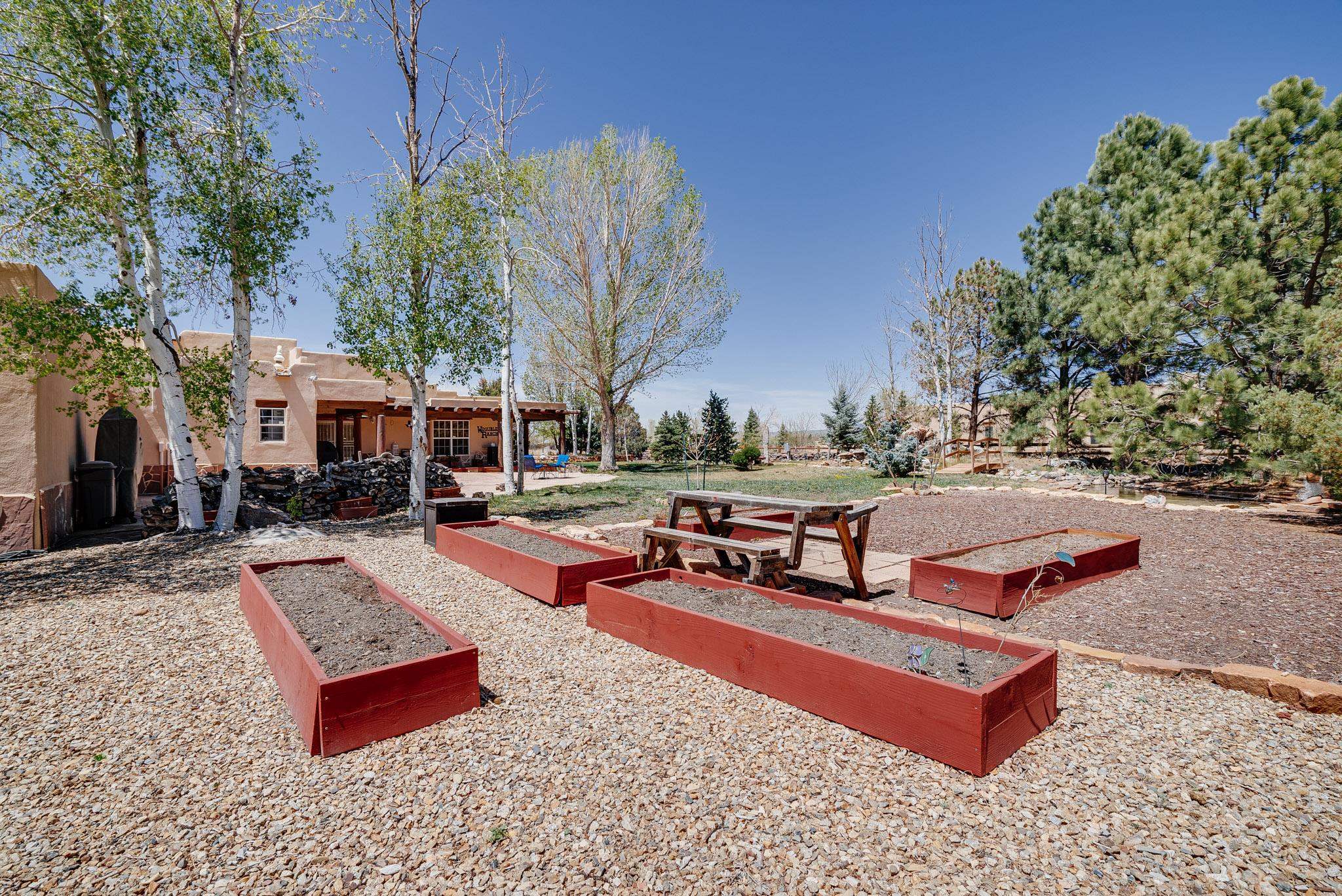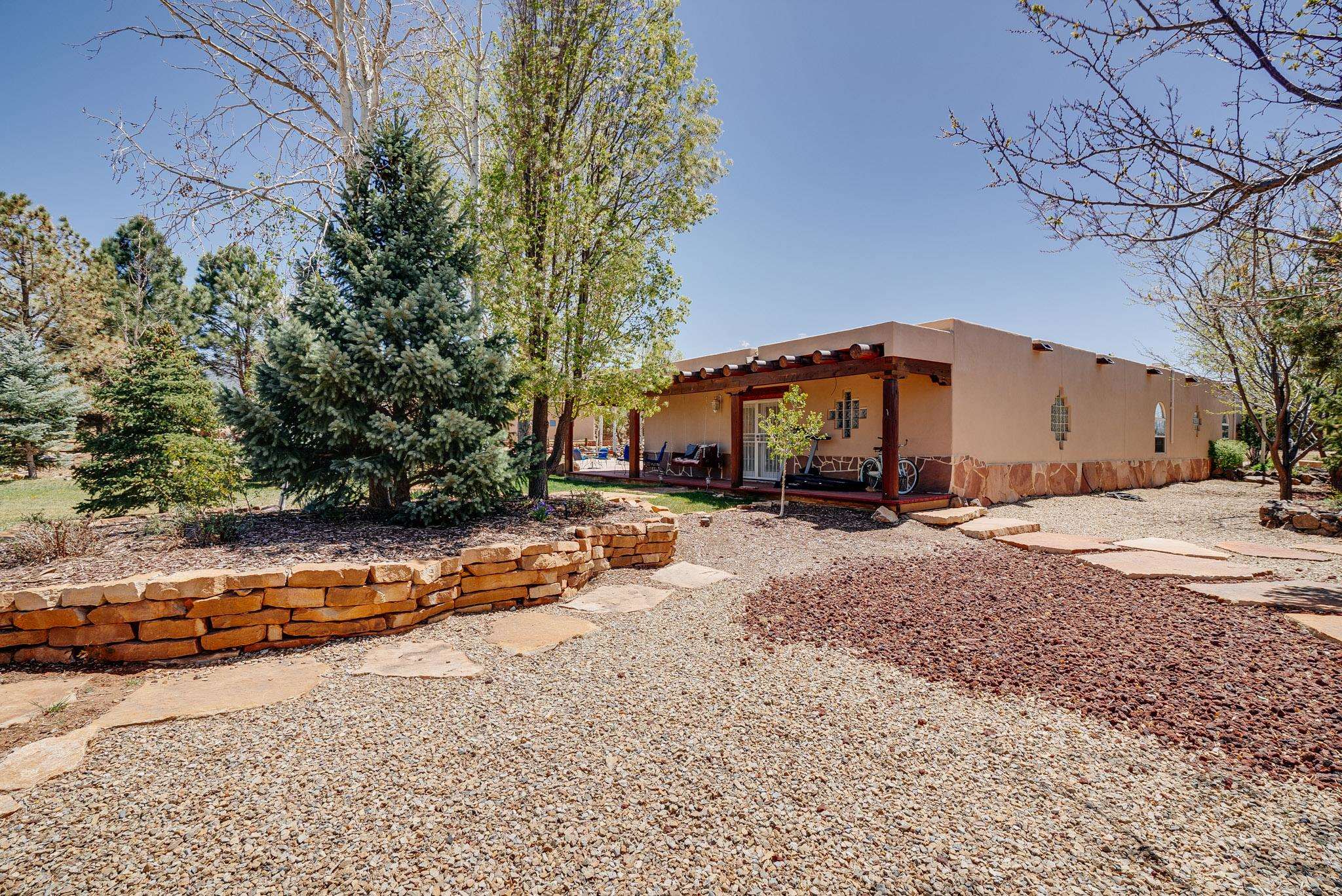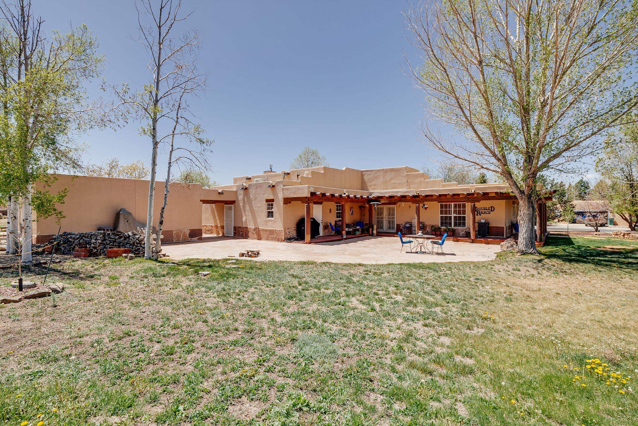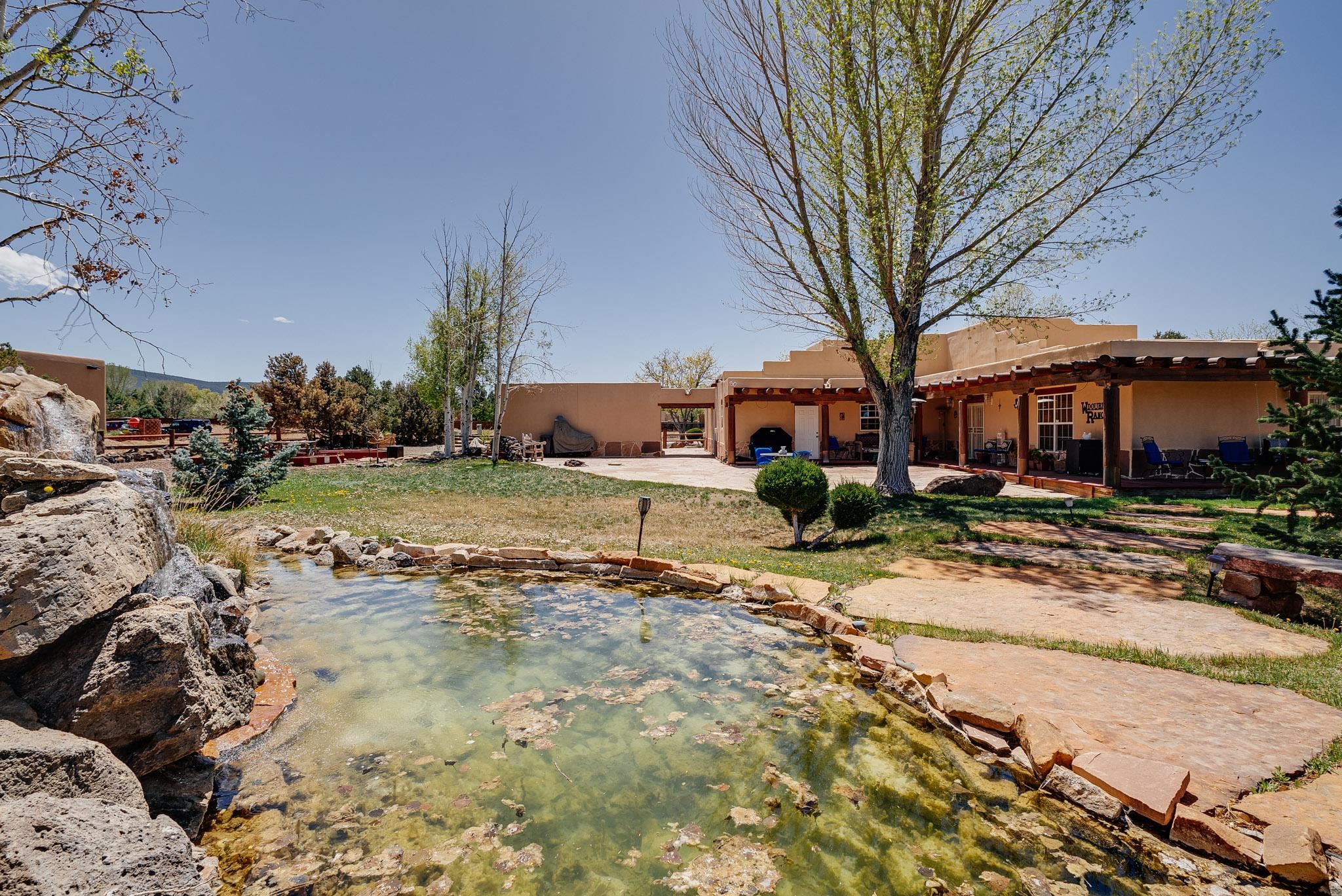 Welcome to this spacious 4-bedroom, 3-bathroom home offering approximately 3,400 square feet of comfort, character, and Southwestern charm in the Vegas De Taos subdivision. Set on a peaceful .68-acre lot, this in-town property combines convenience with a sense of privacy, complete with paved roads, sidewalks, and a welcoming community atmosphere. The beautifully curated grounds feature multiple water features, lush lawn areas, raised garden beds, and a diverse collection of mature trees, including conifers, deciduous varieties, and fruit trees. Enjoy mountain views, big open skies, and a thoughtful blend of low-maintenance xeriscaping in the front with a vibrant backyard retreat. Rock walls and wood fencing create a variety of inviting outdoor spaces, perfect for relaxing or entertaining. Inside, the grand great room impresses with 14-foot vaulted ceilings, custom woodwork, and radiant floor heating, complemented by efficient split units for year-round comfort. French doors off the dining area open to a generous covered veranda, ideal for indoor-outdoor living. The kitchen is designed for both function and gathering, featuring stainless steel appliances, a double oven, a smooth-surface cooktop on the island, a 3-basin sink, and a large island with seating for up to eight. A formal dining room offers additional space for hosting. The west wing includes two guest bedrooms, a spacious full bathroom, and a private primary suite with hickory Pergo flooring, a sitting area or office nook, a whirlpool tub, a separate shower, and an oversized walk-in closet. The east wing offers an additional bedroom, a guest bath, a large pantry, hall storage, and a laundry room with access to the covered breezeway and detached two-car garage. Located just minutes from downtown Taos, the hospital, and local amenities, this property offers a rare combination of space, comfort, and a true in-town homestead feel.