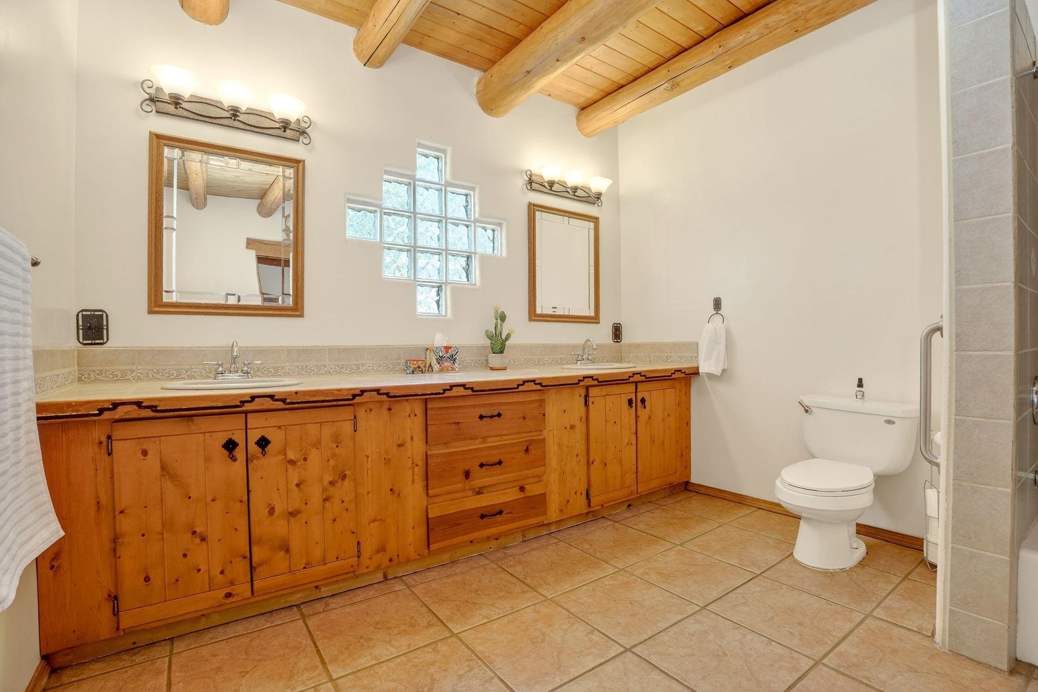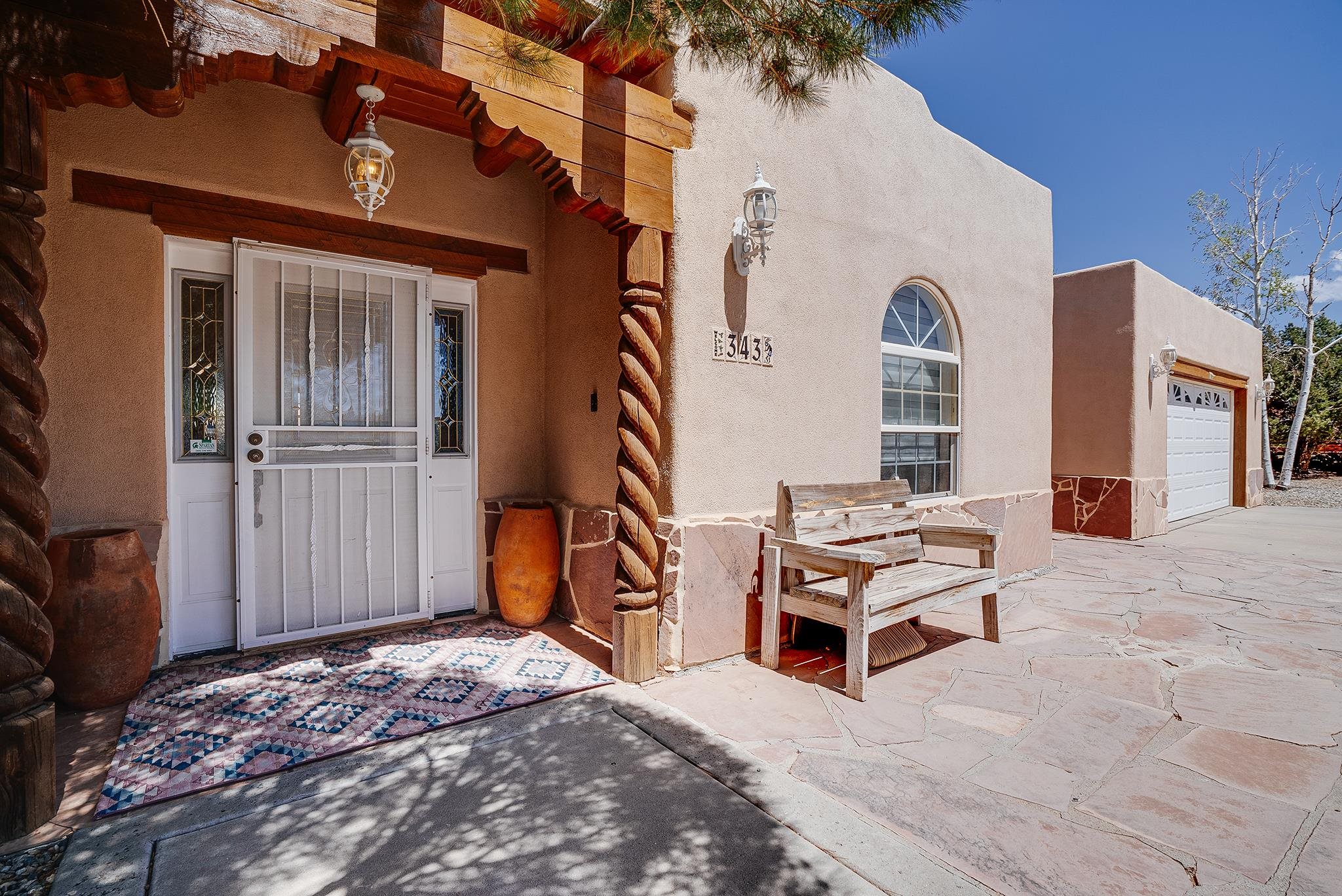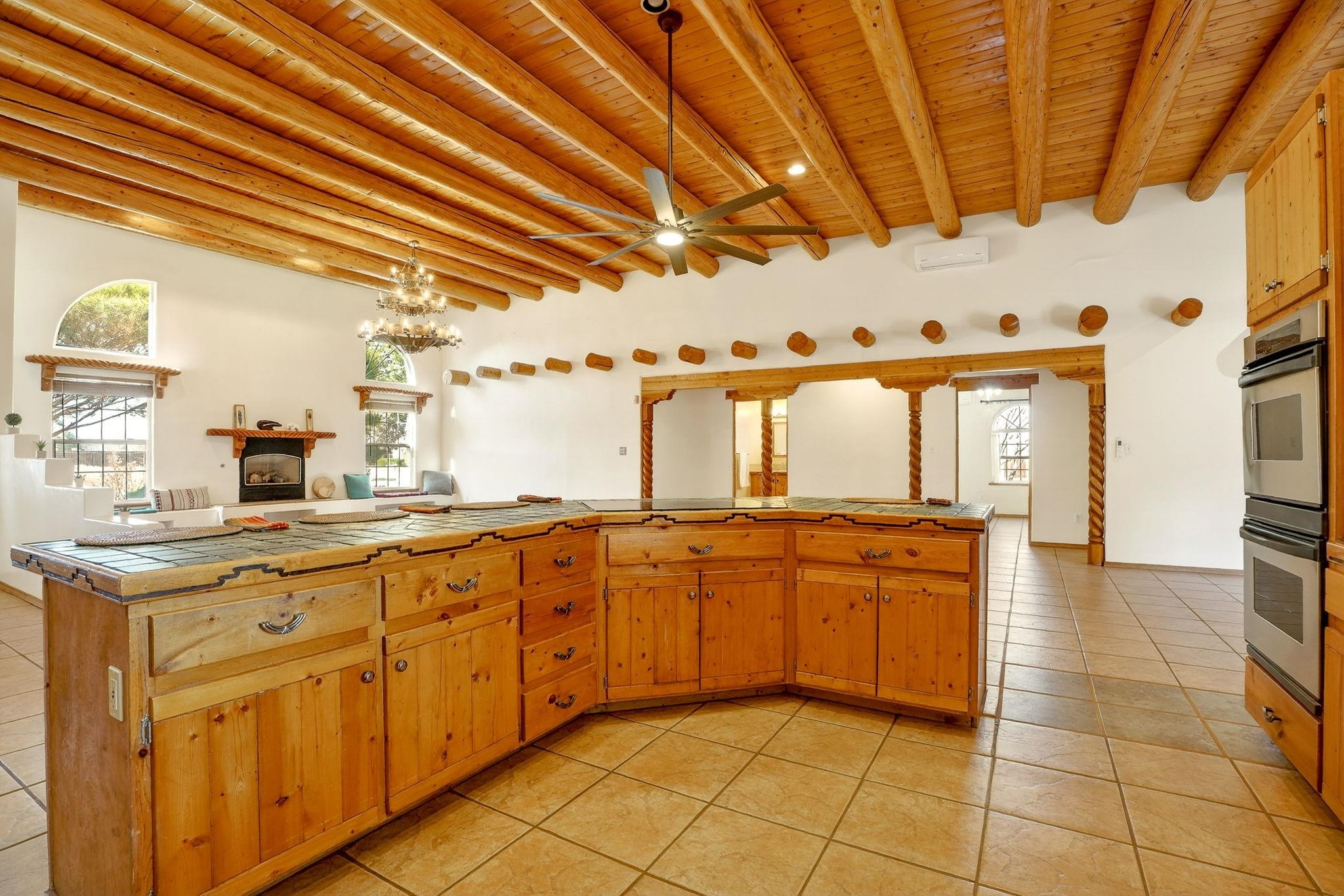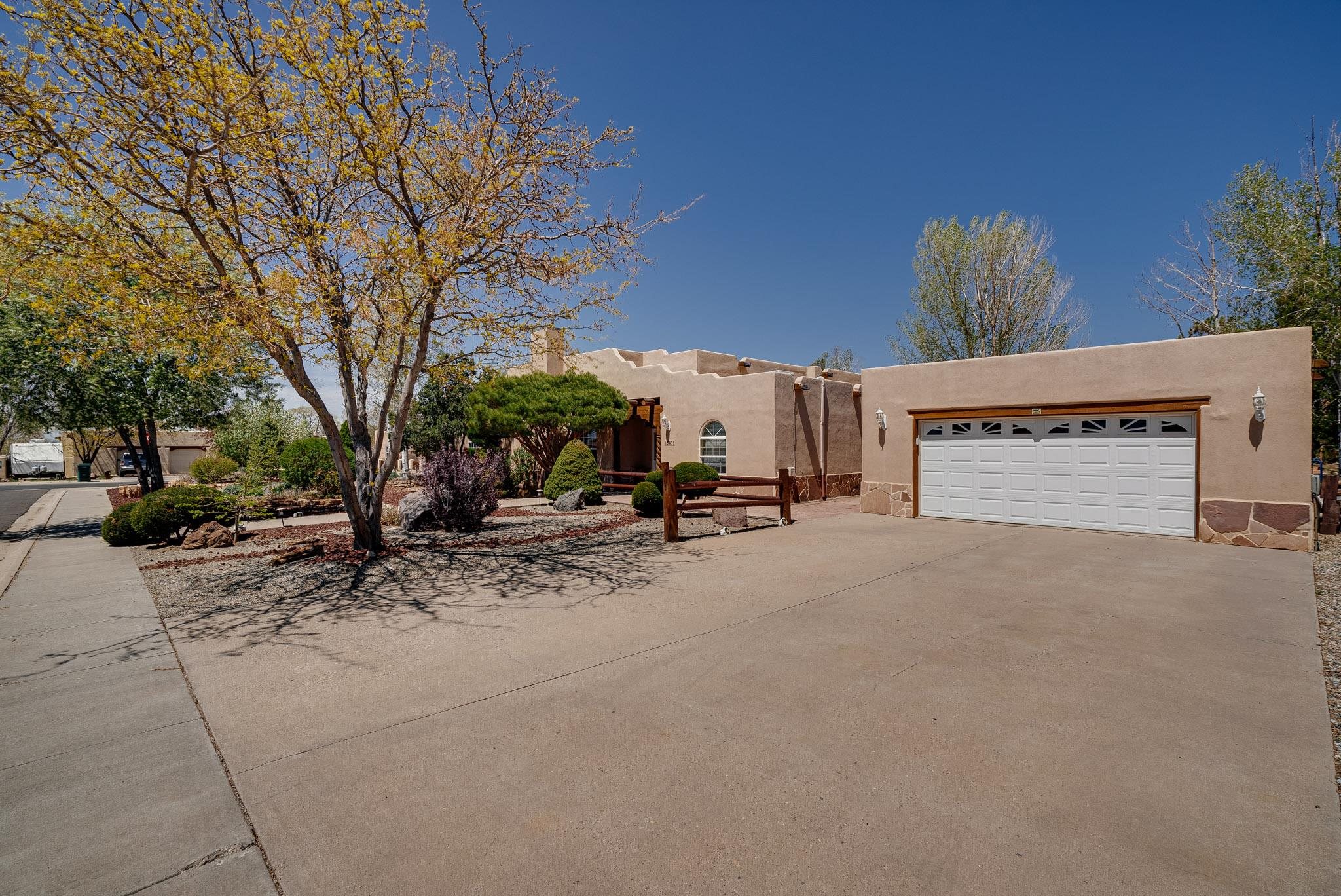 Welcome to this spacious 4-bedroom, 3-bathroom home offering approximately 3,400 square feet of comfort, character, and Southwestern charm in the Vegas De Taos subdivision. Set on a peaceful .68-acre lot, this in-town property combines convenience with a sense of privacy, complete with paved roads, sidewalks, and a welcoming community atmosphere. The beautifully curated grounds feature multiple water features, lush lawn areas, raised garden beds, and a diverse collection of mature trees, including conifers, deciduous varieties, and fruit trees. Enjoy mountain views, big open skies, and a thoughtful blend of low-maintenance xeriscaping in the front with a vibrant backyard retreat. Rock walls and wood fencing create a variety of inviting outdoor spaces, perfect for relaxing or entertaining. Inside, the grand great room impresses with 14-foot vaulted ceilings, custom woodwork, and radiant floor heating, complemented by efficient split units for year-round comfort. French doors off the dining area open to a generous covered veranda, ideal for indoor-outdoor living. The kitchen is designed for both function and gathering, featuring stainless steel appliances, a double oven, a smooth-surface cooktop on the island, a 3-basin sink, and a large island with seating for up to eight. A formal dining room offers additional space for hosting. The west wing includes two guest bedrooms, a spacious full bathroom, and a private primary suite with hickory Pergo flooring, a sitting area or office nook, a whirlpool tub, a separate shower, and an oversized walk-in closet. The east wing offers an additional bedroom, a guest bath, a large pantry, hall storage, and a laundry room with access to the covered breezeway and detached two-car garage. Located just minutes from downtown Taos, the hospital, and local amenities, this property offers a rare combination of space, comfort, and a true in-town homestead feel.