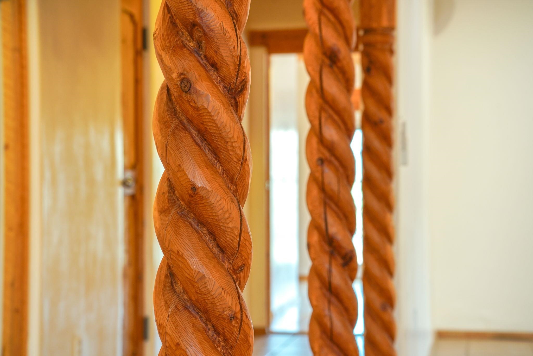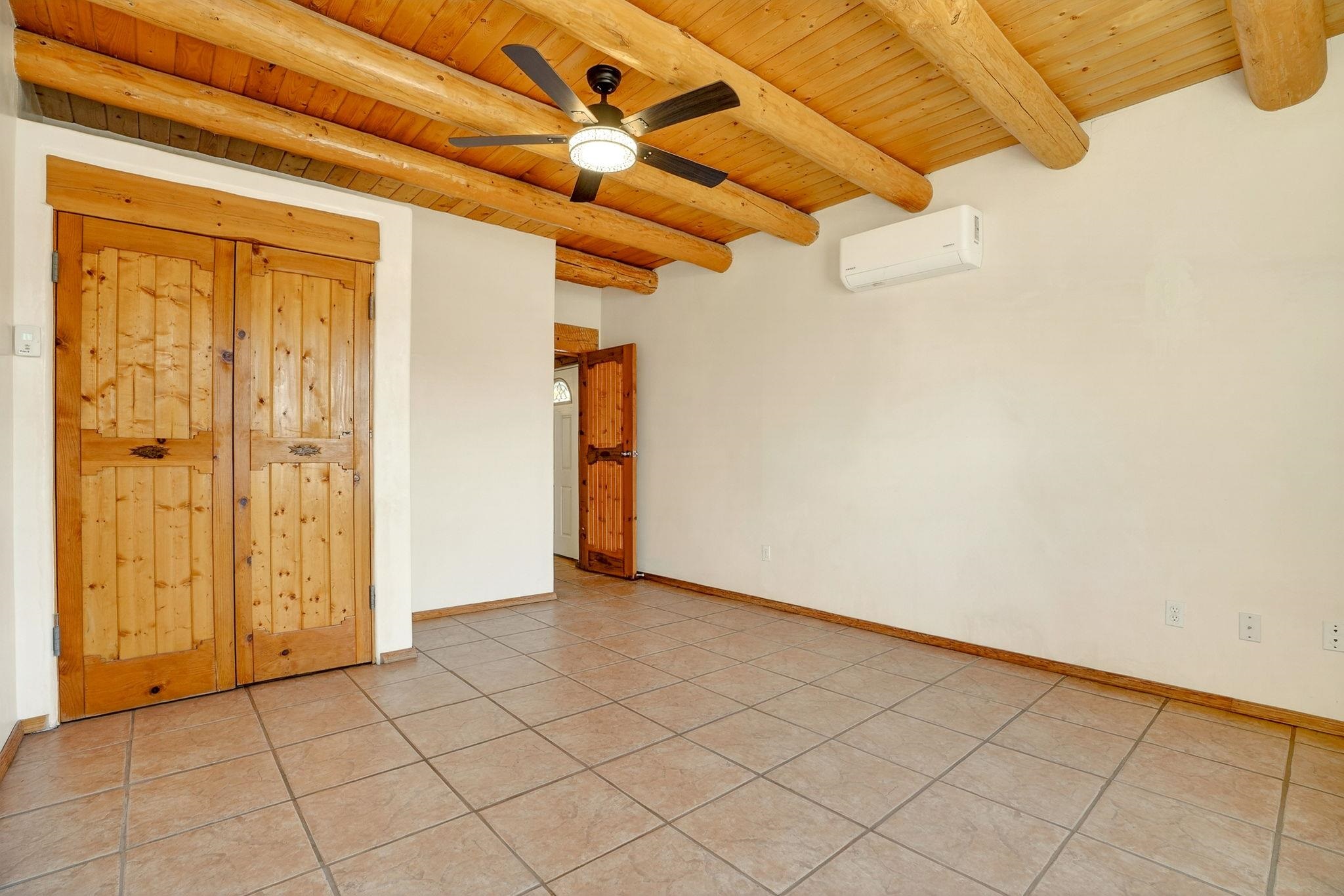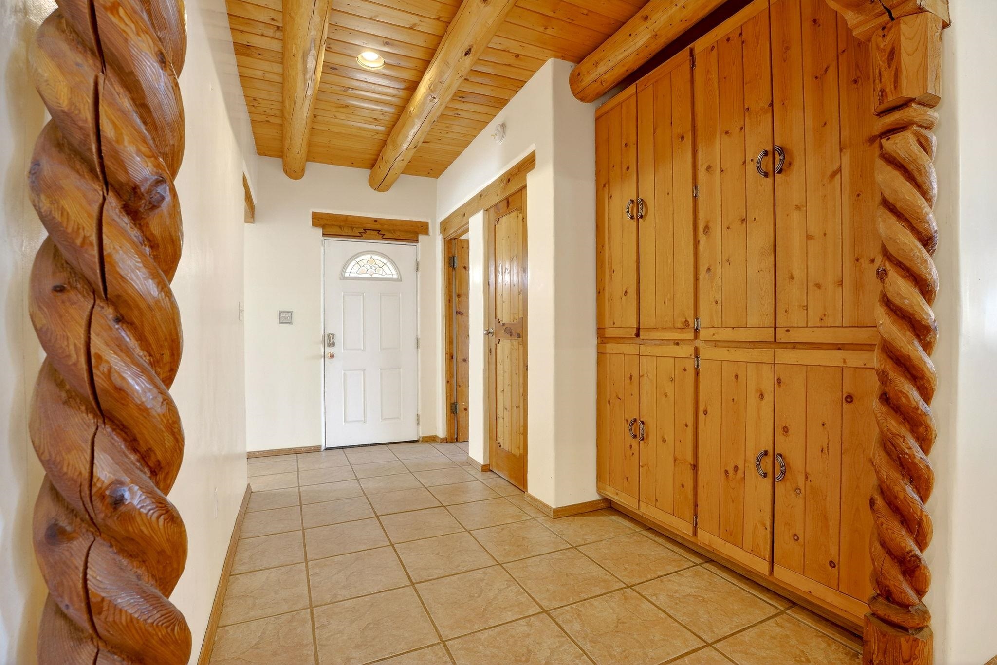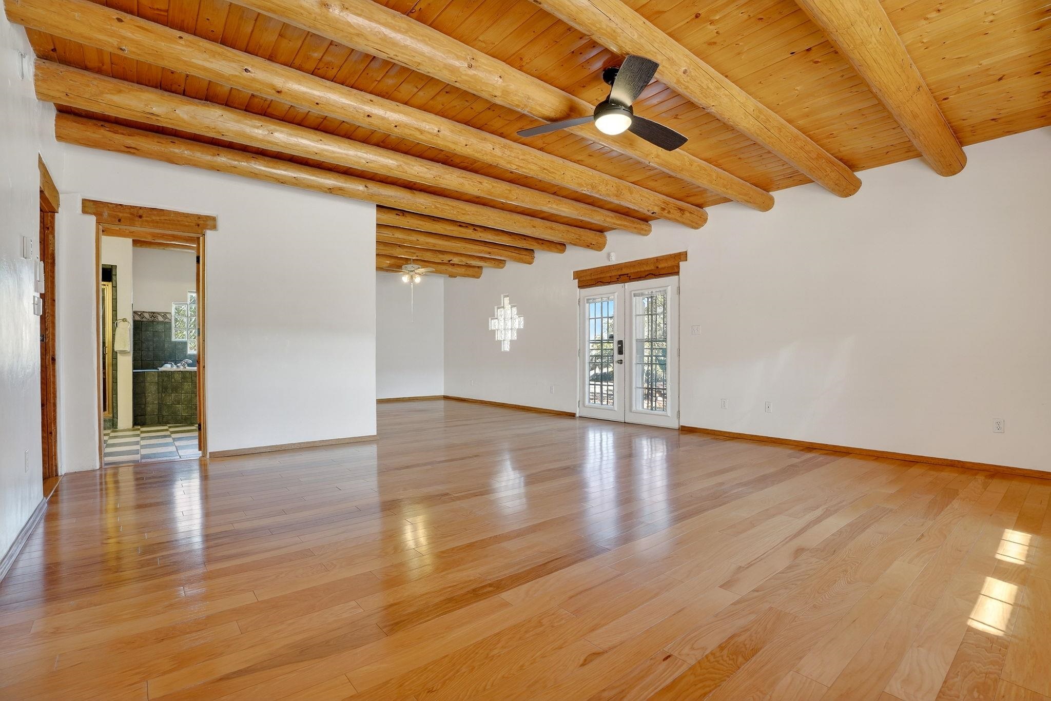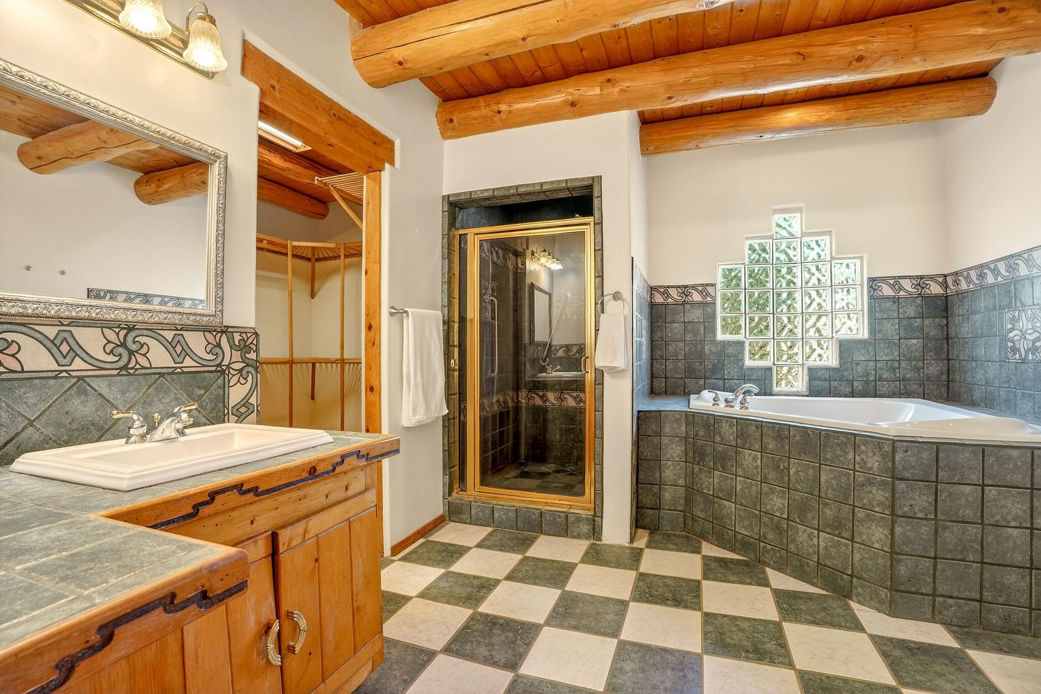 Welcome to this spacious 4-bedroom, 3-bathroom home offering approximately 3,400 square feet of comfort, character, and Southwestern charm in the Vegas De Taos subdivision. Set on a peaceful .68-acre lot, this in-town property combines convenience with a sense of privacy, complete with paved roads, sidewalks, and a welcoming community atmosphere. The beautifully curated grounds feature multiple water features, lush lawn areas, raised garden beds, and a diverse collection of mature trees, including conifers, deciduous varieties, and fruit trees. Enjoy mountain views, big open skies, and a thoughtful blend of low-maintenance xeriscaping in the front with a vibrant backyard retreat. Rock walls and wood fencing create a variety of inviting outdoor spaces, perfect for relaxing or entertaining. Inside, the grand great room impresses with 14-foot vaulted ceilings, custom woodwork, and radiant floor heating, complemented by efficient split units for year-round comfort. French doors off the dining area open to a generous covered veranda, ideal for indoor-outdoor living. The kitchen is designed for both function and gathering, featuring stainless steel appliances, a double oven, a smooth-surface cooktop on the island, a 3-basin sink, and a large island with seating for up to eight. A formal dining room offers additional space for hosting. The west wing includes two guest bedrooms, a spacious full bathroom, and a private primary suite with hickory Pergo flooring, a sitting area or office nook, a whirlpool tub, a separate shower, and an oversized walk-in closet. The east wing offers an additional bedroom, a guest bath, a large pantry, hall storage, and a laundry room with access to the covered breezeway and detached two-car garage. Located just minutes from downtown Taos, the hospital, and local amenities, this property offers a rare combination of space, comfort, and a true in-town homestead feel.