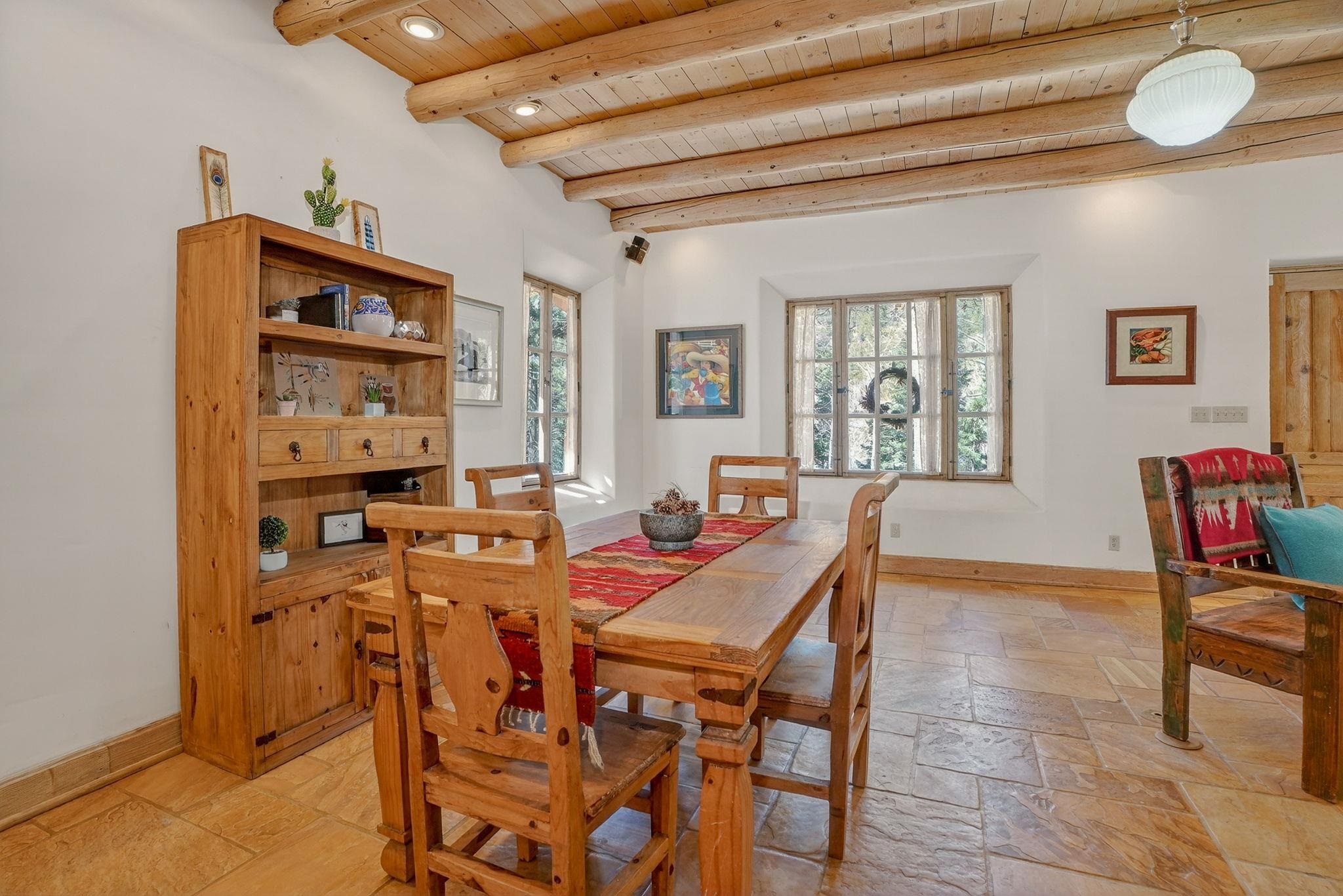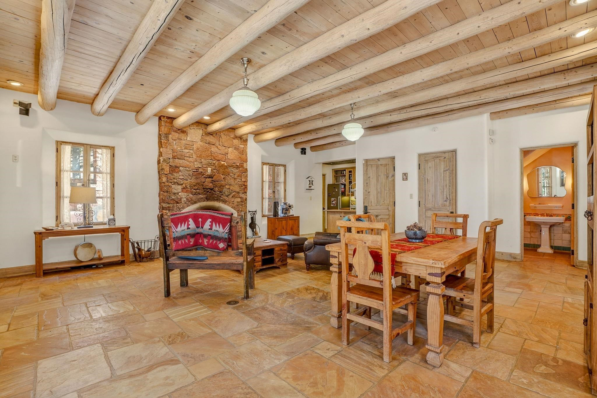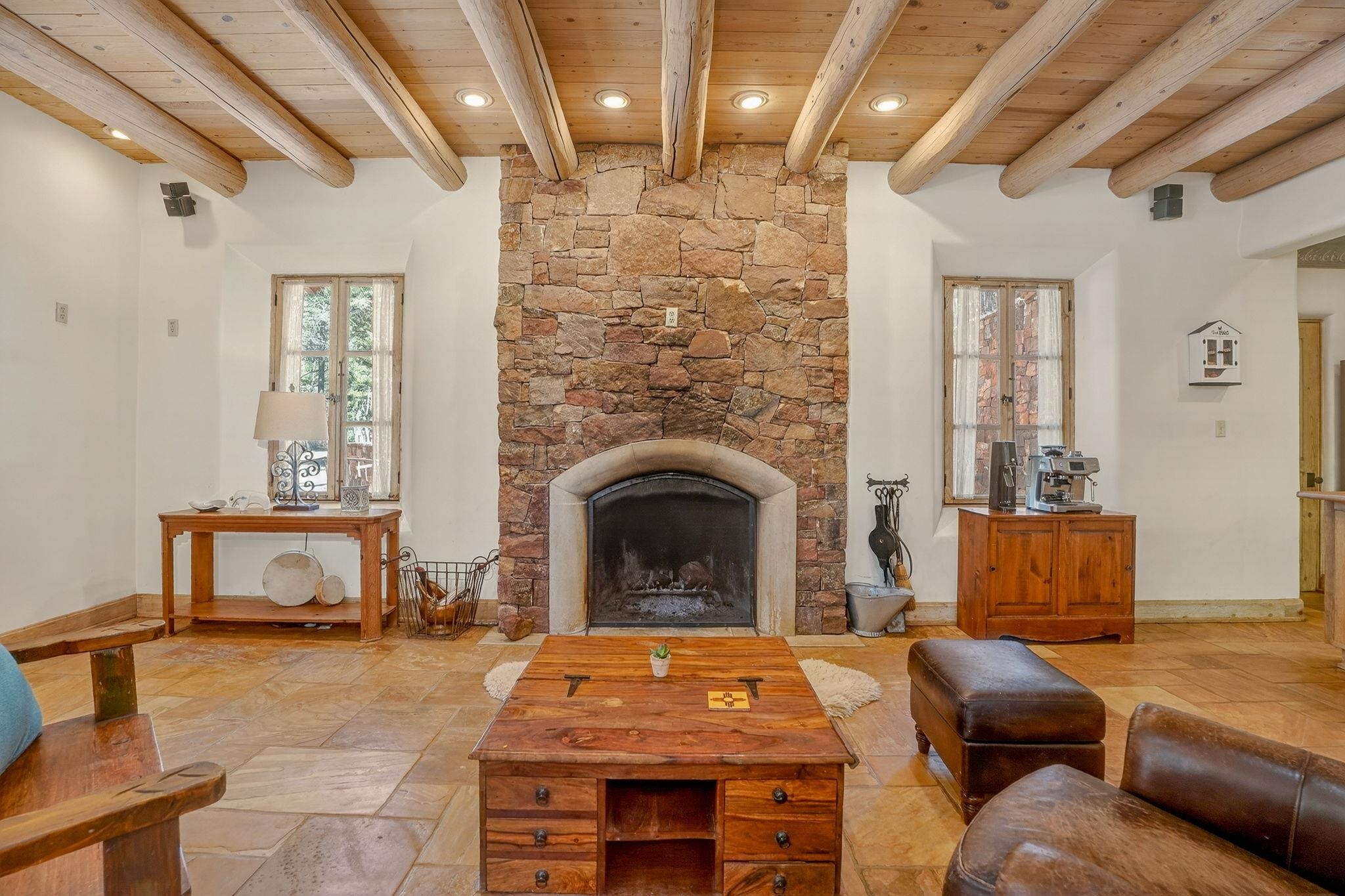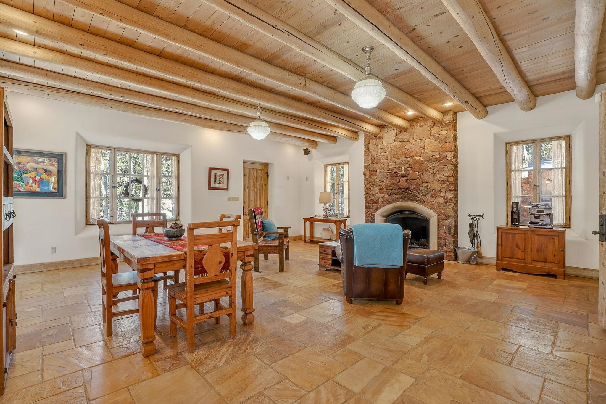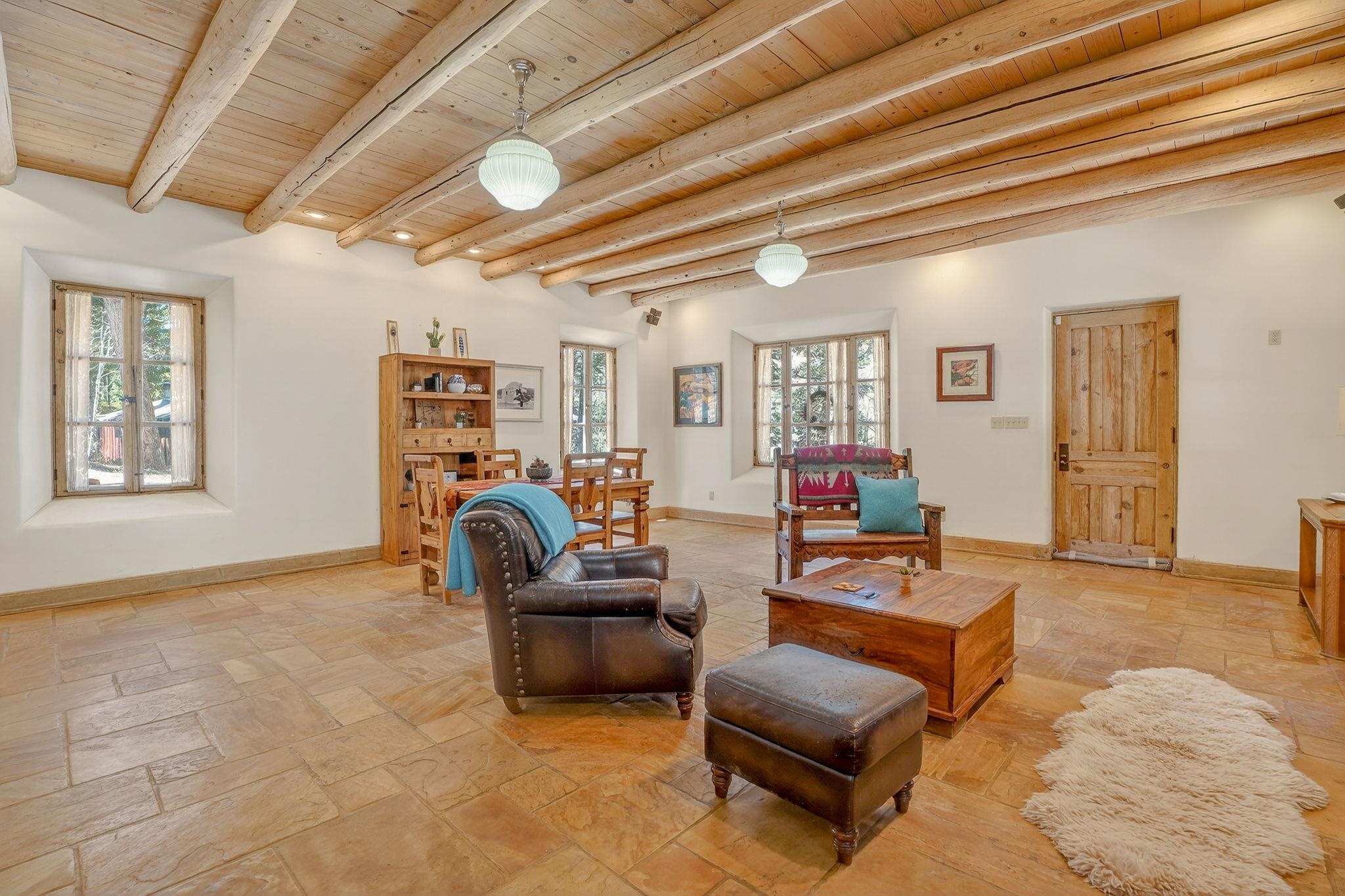 Set on 2.9 acres bordering the pristine Carson National Forest, this exceptional Taos property offers a rare opportunity to enjoy natural beauty and refined Southwestern living, with direct access to protected forest land. Ideally located just 8.3 miles from the Taos Plaza, approximately 40 minutes to Taos Ski Valley, and approximately 25 minutes to Angel Fire Resort, the home provides both convenience and a true sense of escape. This thoughtfully designed and custom-built 2 bedroom, 2.5 bath residence blends craftsmanship with comfort. Rich brick, stone tile, and wood flooring flow throughout, while wood ceilings and abundant skylights bathe the interiors in natural light, creating a warm and inviting atmosphere. The grounds are equally impressive, featuring a large barn and extensive paddocks, ideal for the resident llamas. Entertaining is effortless with an inviting fireplace patio and a separate fire pit, perfect for taking in Taos' star-filled skies. This is a truly special offering where access to nature and timeless Southwestern design come together in one remarkable setting.