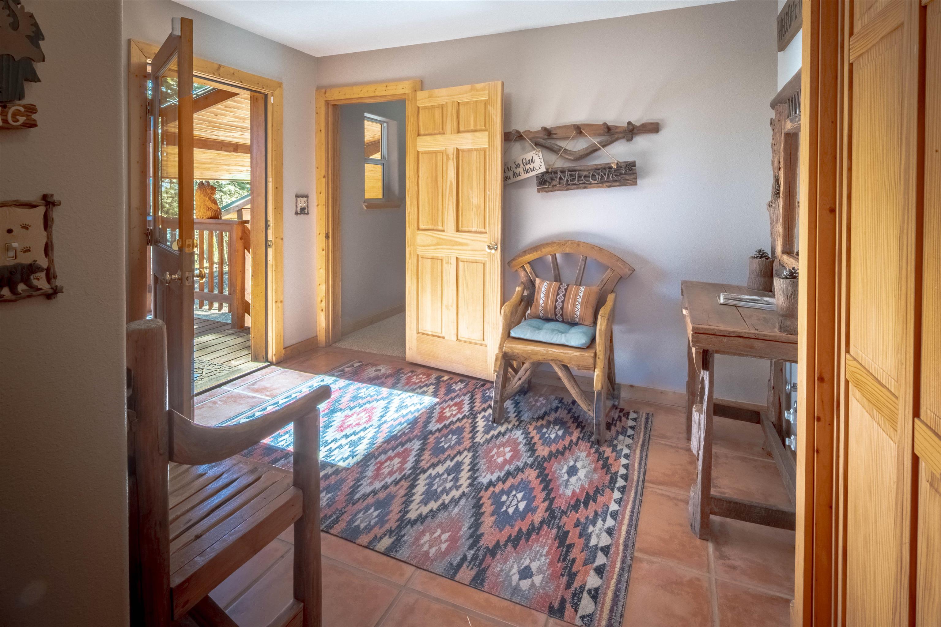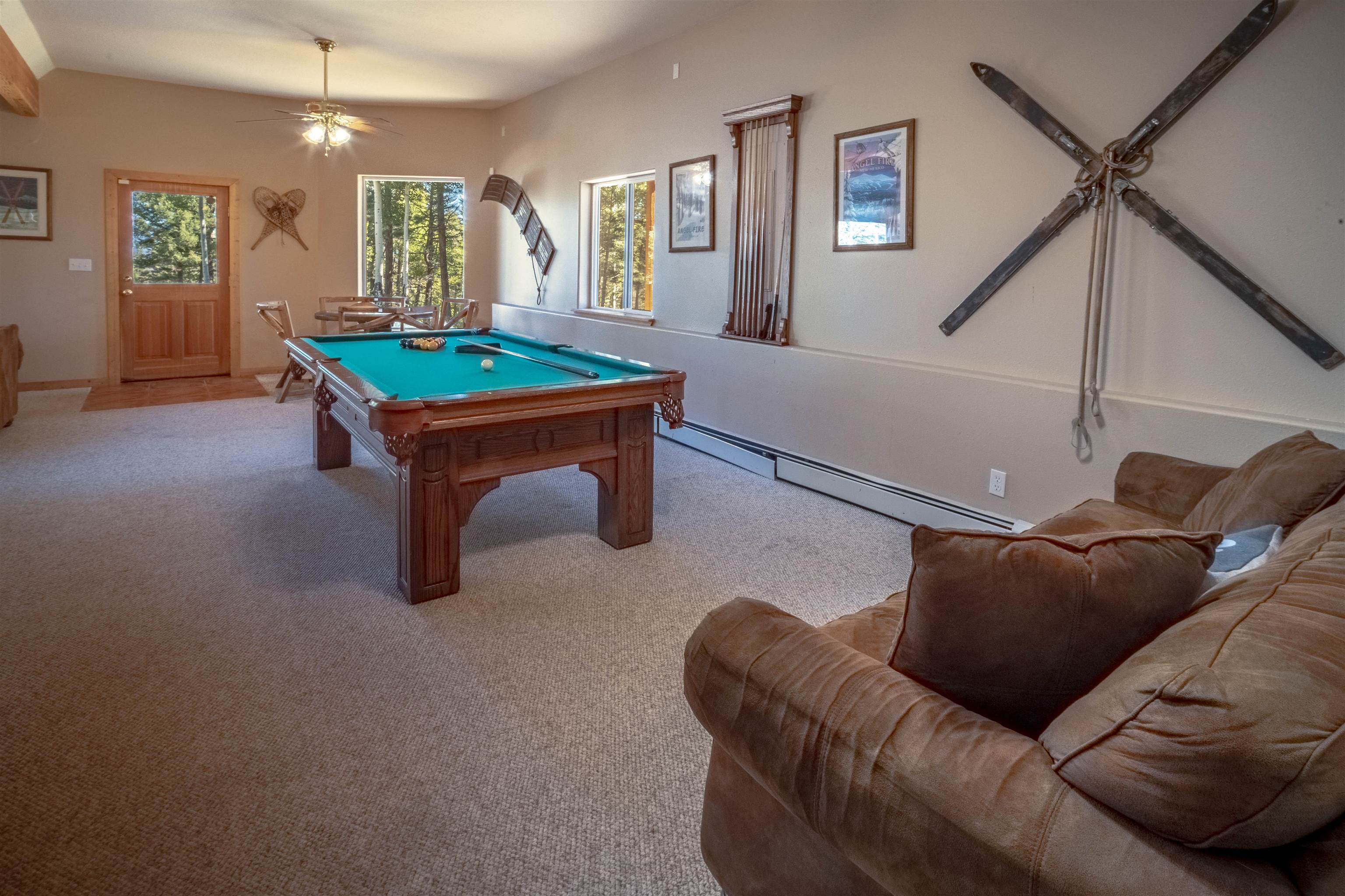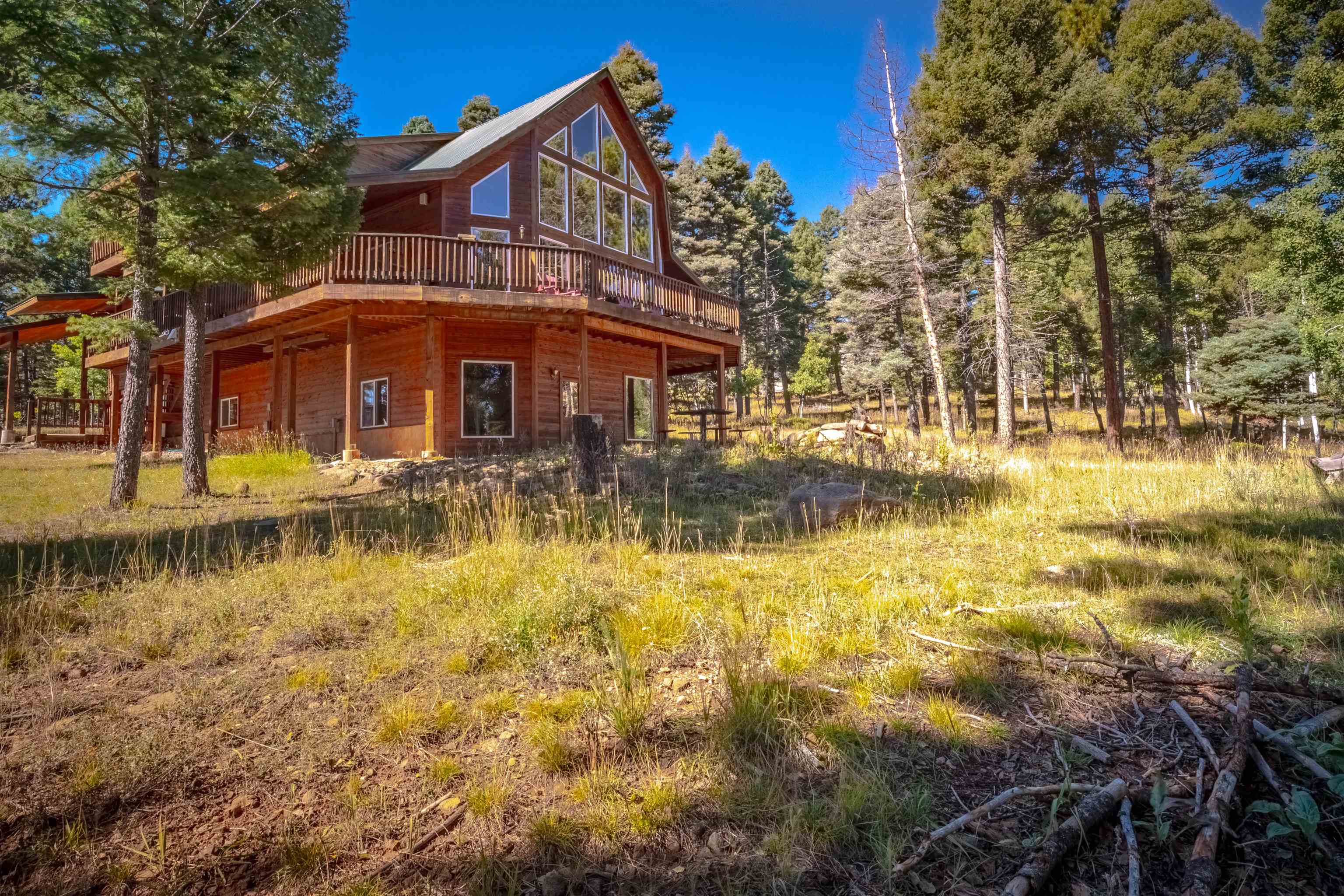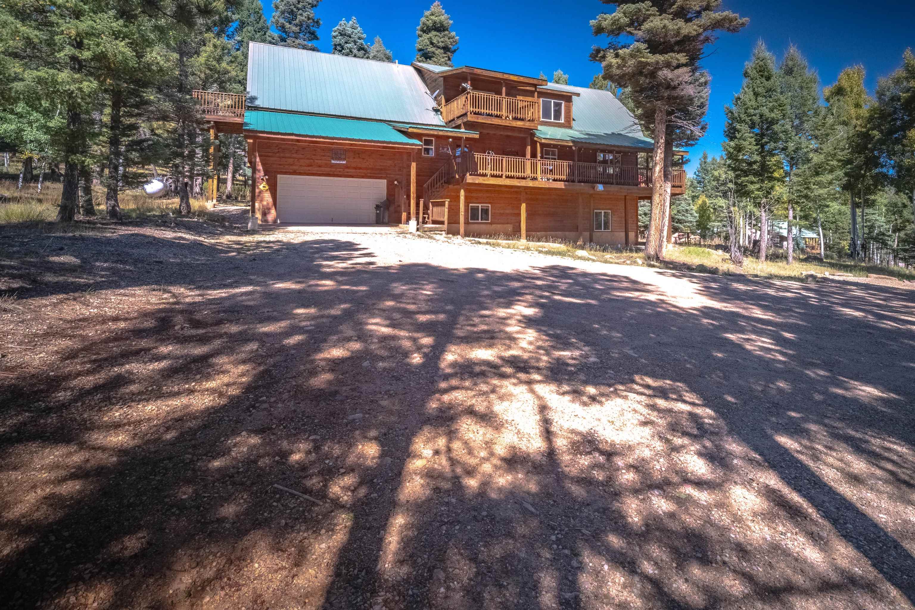 Welcome to your dream mountain getaway! Nestled on 2 private acres with breathtaking mountain views, this 5 bed 4 bath, 3-level chalet is the epitome of Rocky Mountain charm, comfort, and functionality. Featuring an open-concept kitchen, a living & dining area with soaring tongue & groove ceilings, massive logs and a striking rock fireplace. Also a chalet-style wall of windows that floods the interior with natural light and mountain vistas. The upper level contains 2 master suites, a private deck with panoramic views and a loft area ideal for a home office or cozy reading nook. The main-level includes an expansive kitchen with commercial-grade range and ample counter space, a guest bedroom and full bath, a utility room & mudroom for convenience after outdoor adventures. The lower level offers 2 bedrooms, a full bath, and a large family room with a wet bar plus walk-out access to a flagstone patio with fire pit and mountain views. There is a finished oversized 2-car garage with a second-story storage area that could be converted into an additional bonus room. Quiet and easily accessible year-round location. About 5 minutes to Angel Fire Village, Championship Golf Course, Country Club, Fitness Center, and Ski-Resort.
