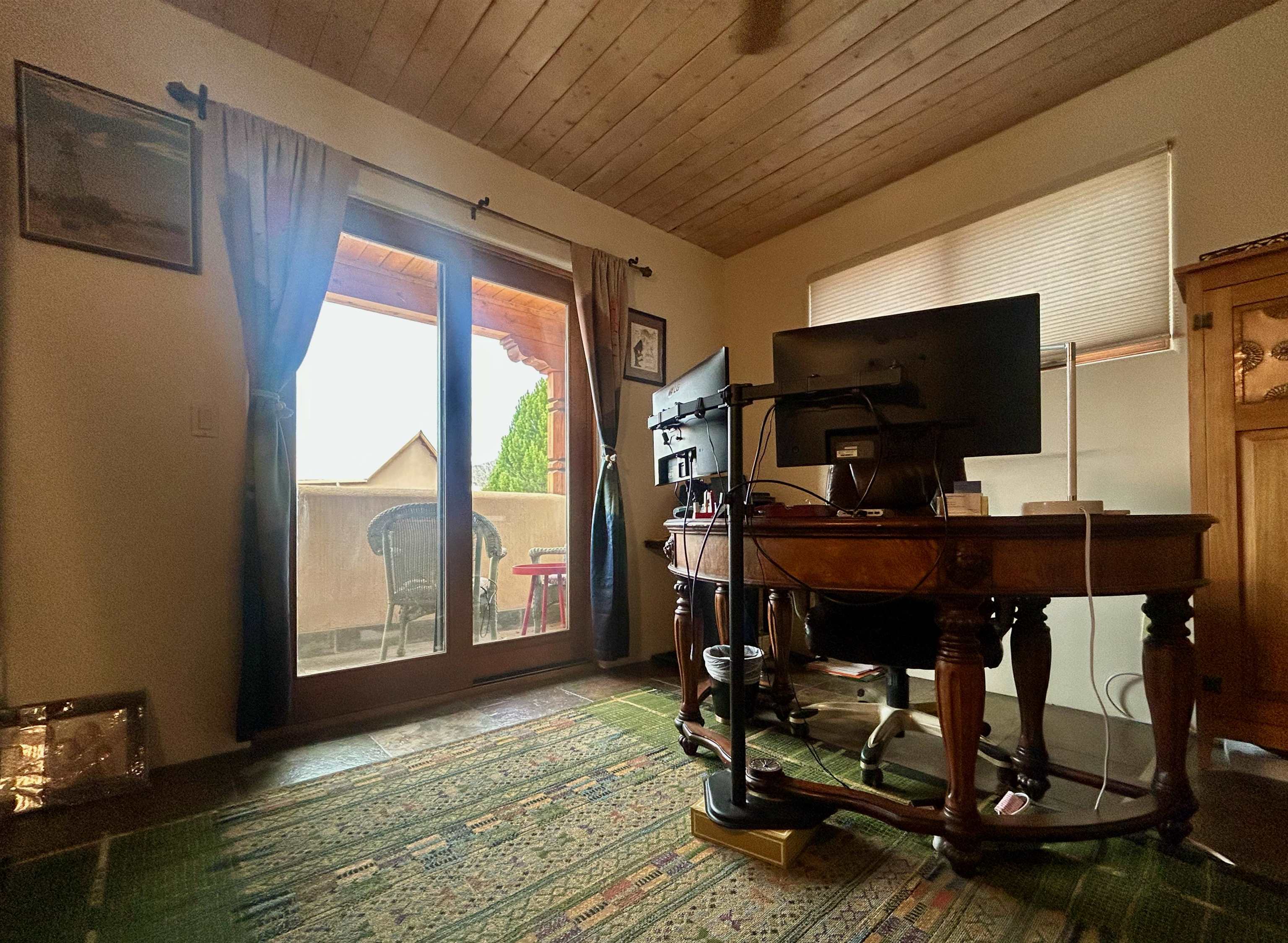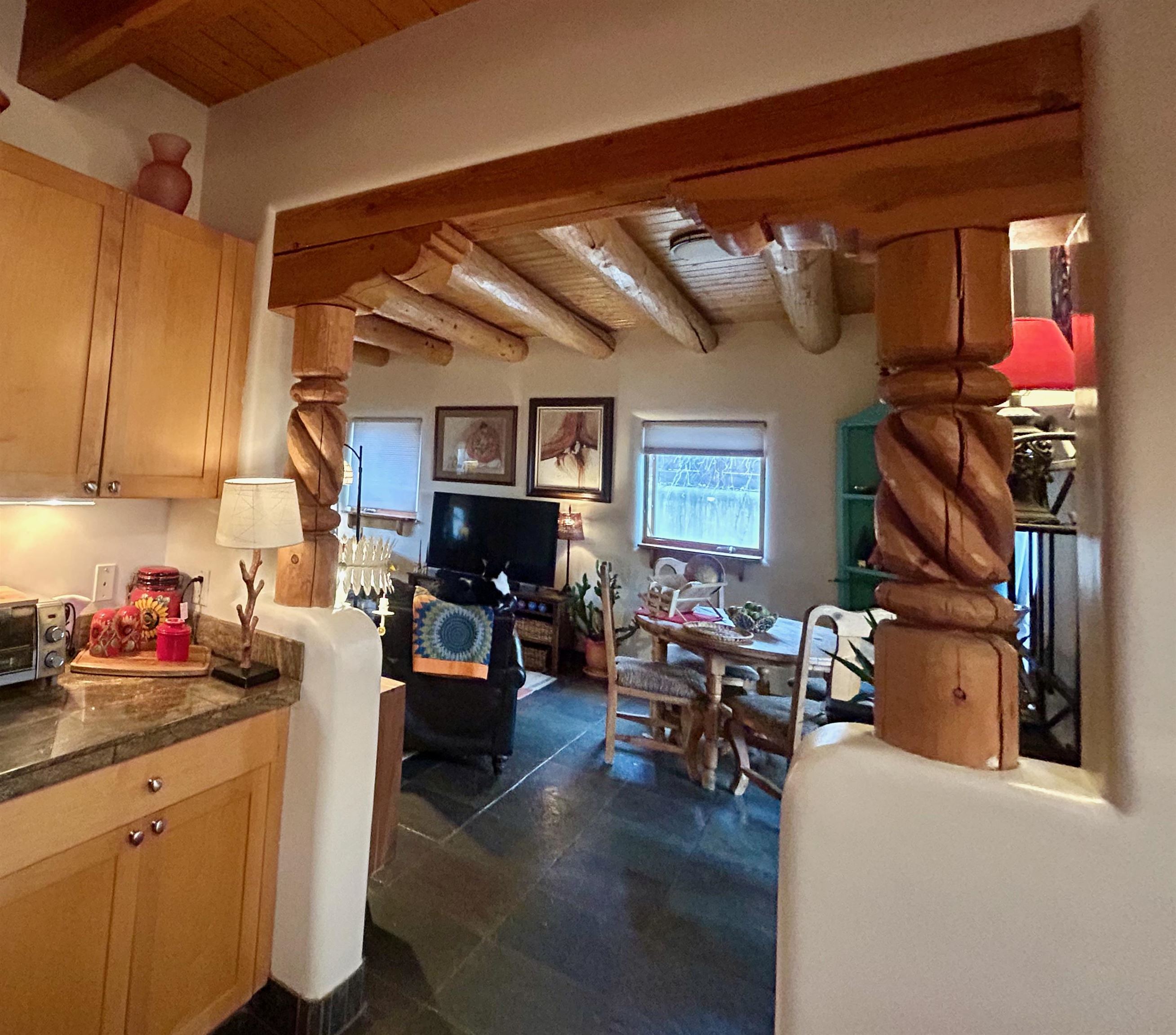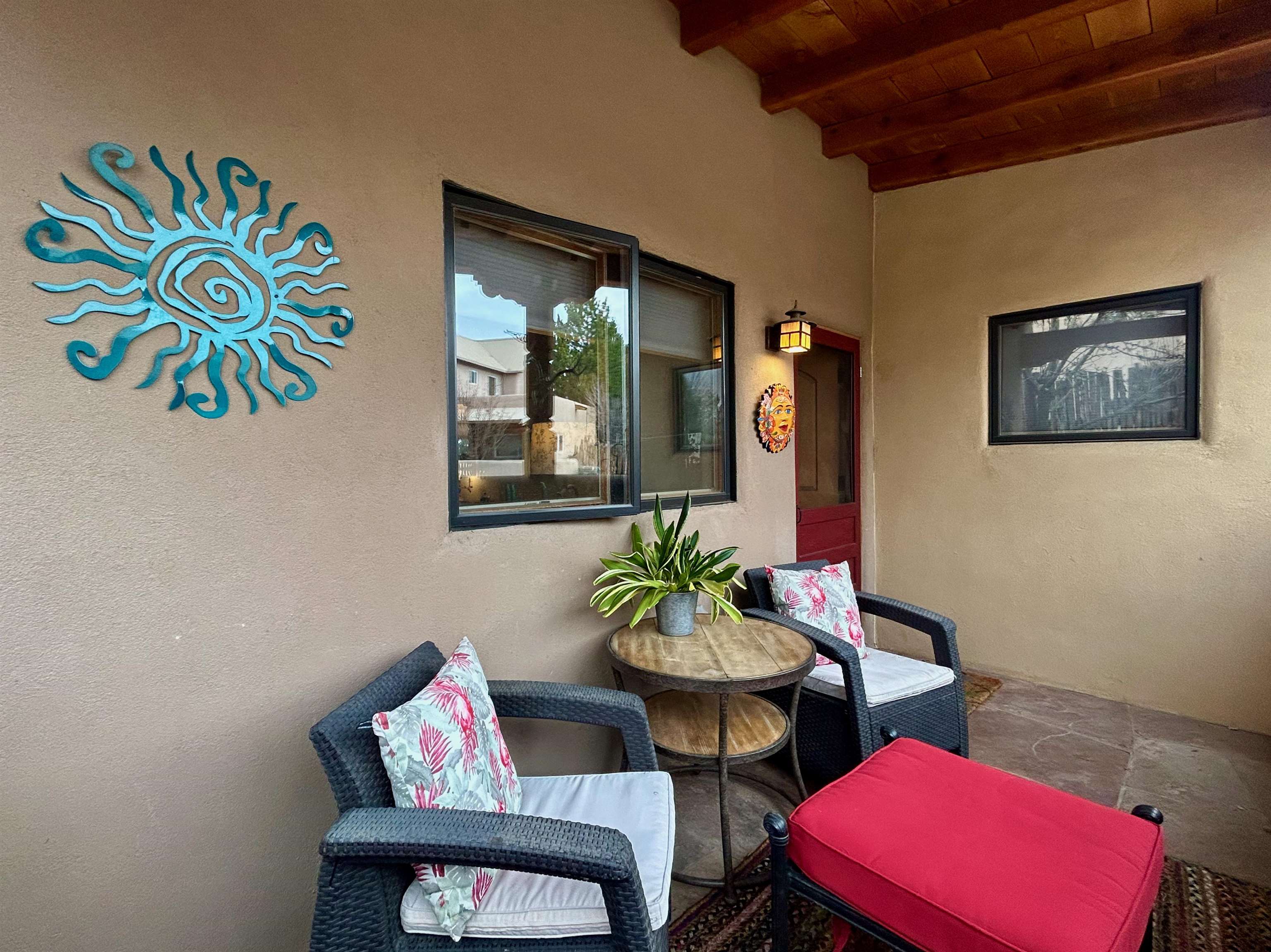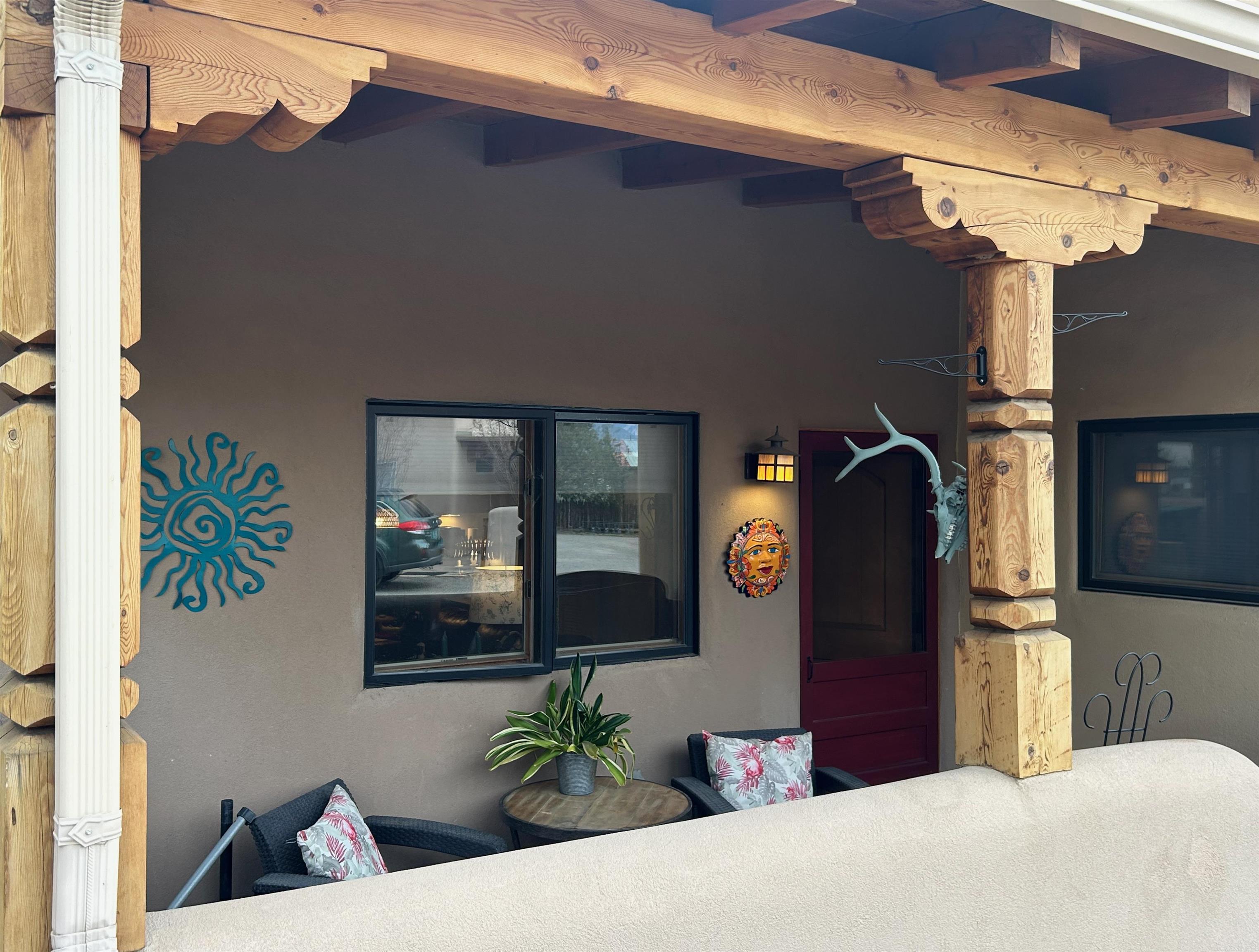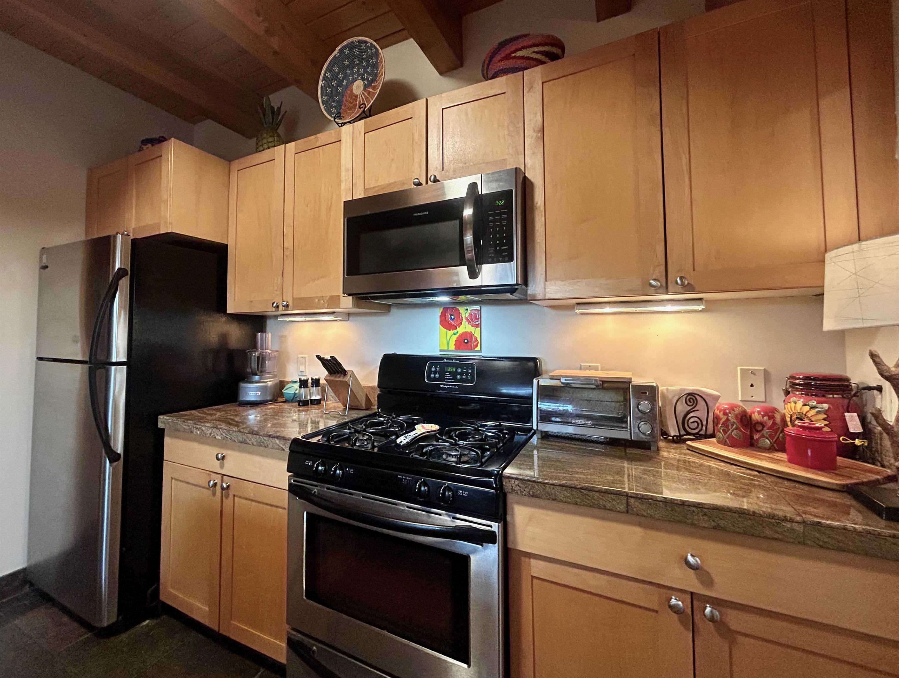 Charming, centrally located two-level townhouse, conveniently located to everything that Historic Taos has to offer. You'll find Toas mountain views from the bedrooms and balcony in this lovingly maintained 3B/3B, 1400+ sqft home, complete with beautiful southwest finishes, Vigas, Kiva gas fireplace, diamond plaster walls and slate tile floors throughout. The kitchen comes furnished with stainless steel appliances, custom cabinets and complimentary granite countertops. A Navien on-demand water heater installed 6 years ago and a new water softener installed last year. Radiant floor heating together with energy efficient Rastra construction which will keep you cool in the summer and warm in the winter. Welcoming patio entrance with flagstone portal and handsome exterior sconces along with expansion pavers to provide a second side-back patio area for watching sunsets. Quiet end unit with high walls for added privacy, offers the perfect combination of comfort and convenience. Located just minutes from everything, this condo offers a great commute for work, shopping, and dining. You'll be close enough to the iconic Taos Plaza, rich in history and cultural attractions and close to hiking, biking and exploring the stunning New Mexico wilderness. Taos Ski Valley is just a 30 minute drive. Convenient, Comfortable and Cozy Home!