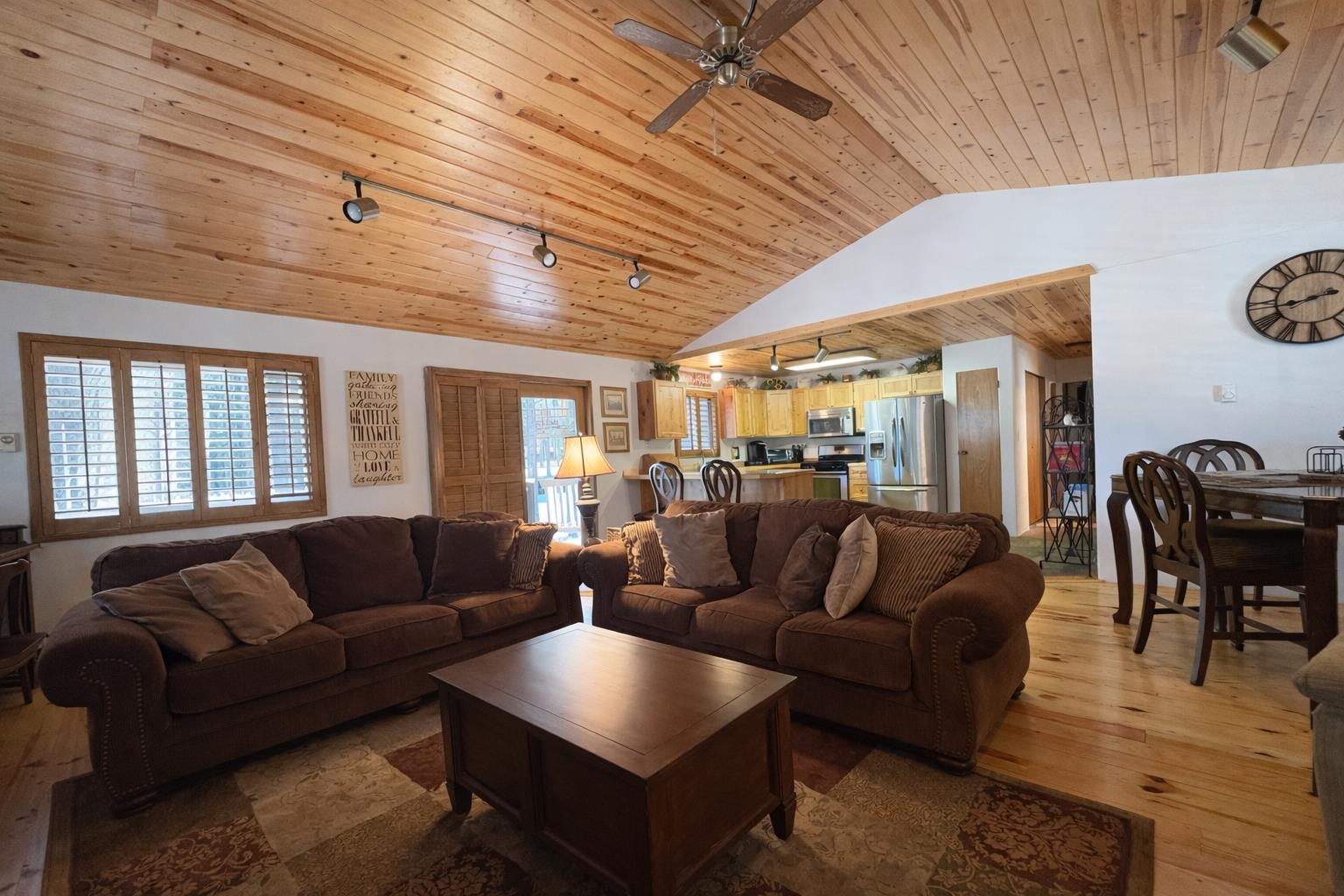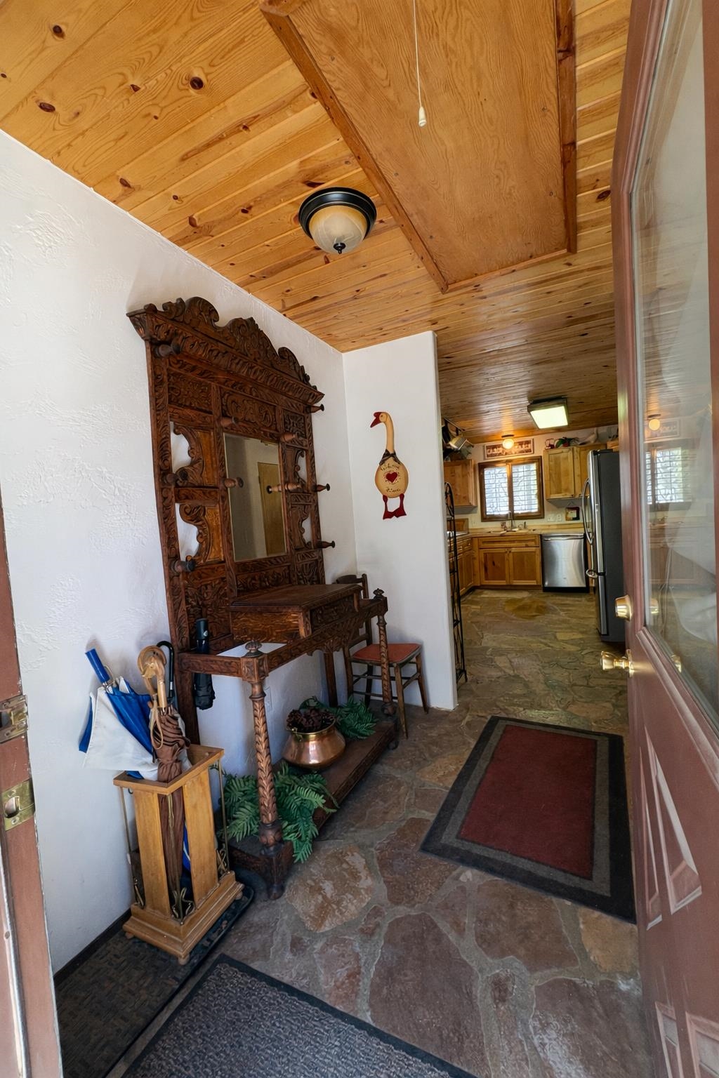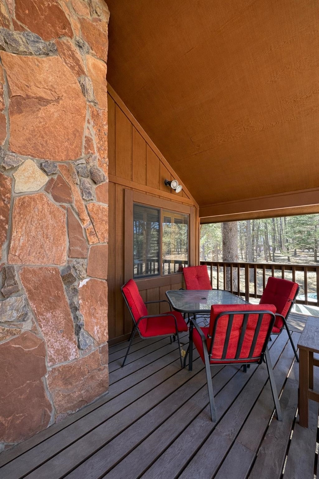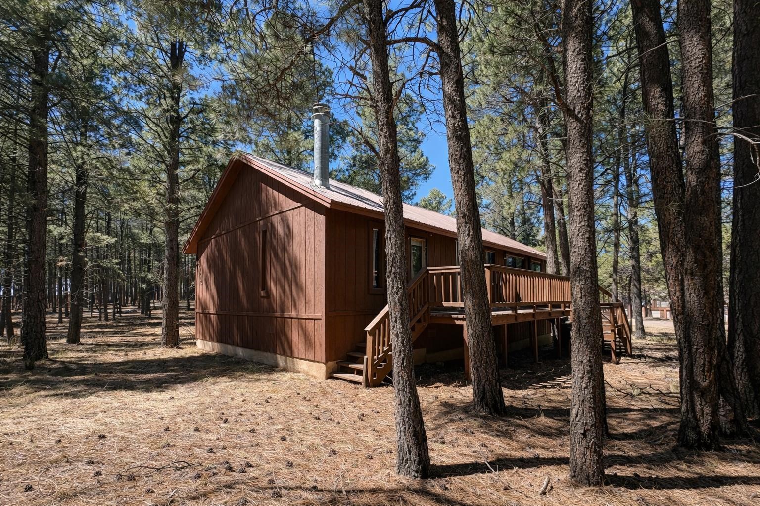 1 block from Monte Verde Lake! This adorable cabin is conveniently located, has 2 fireplaces, stone flooring, tongue & groove celings and great outdoor space! When you first walk in you are greeted by a great mud room area that leads into an open room where you'll find the kitchen, dining room and living room. The large stone fireplace is the highlight of this space! When you step outside onto the patio is a great covered porch and a sunny BBQ area. Further into the house, you follow the stone floor into a master bedroom with another stone fireplace! The property is a part of the Angel Fire Resort Membership, where you can enjoy a PGA golf course, down hill mountain biking park, ski resort, hiking trails, fishing and so much more!