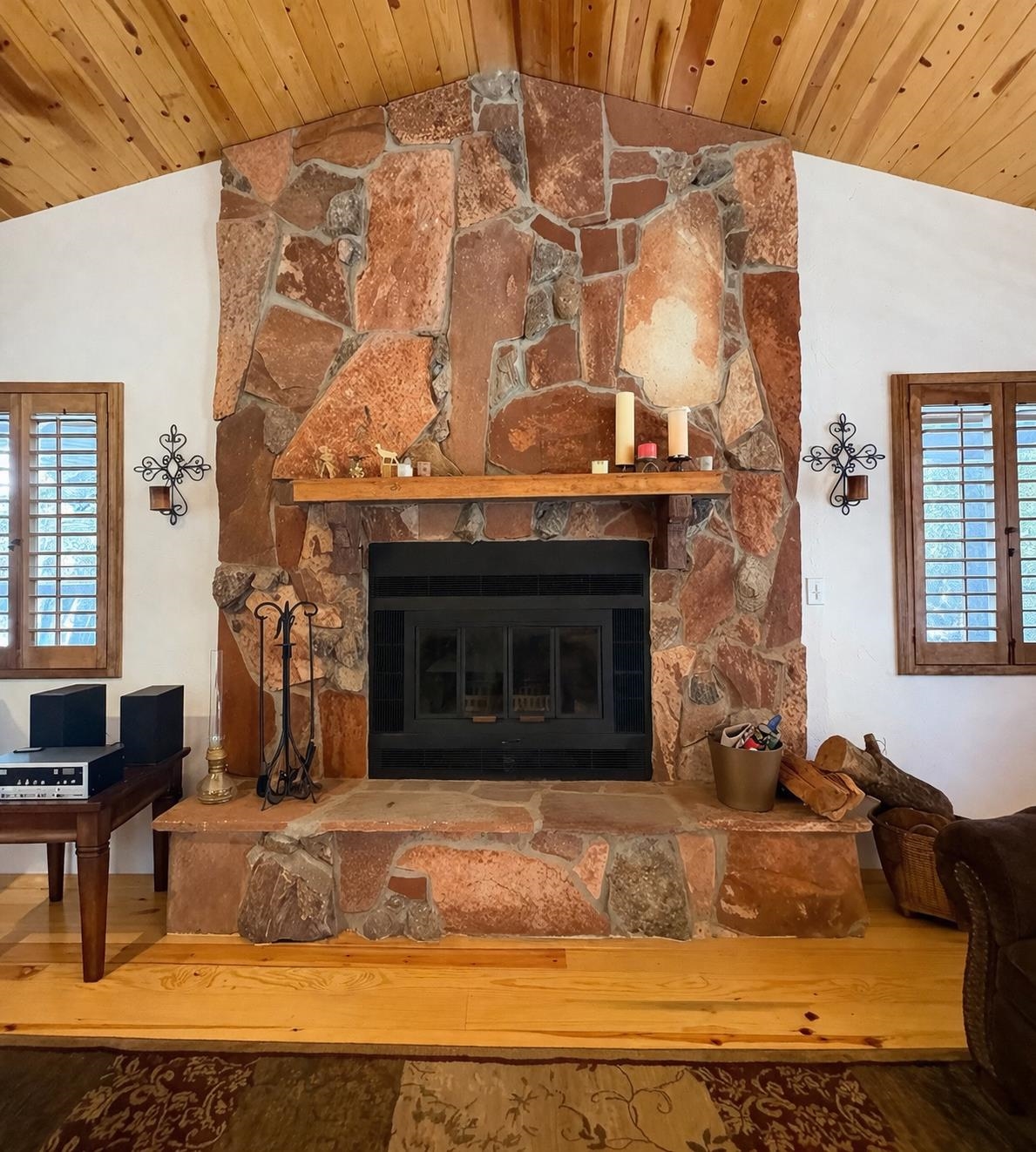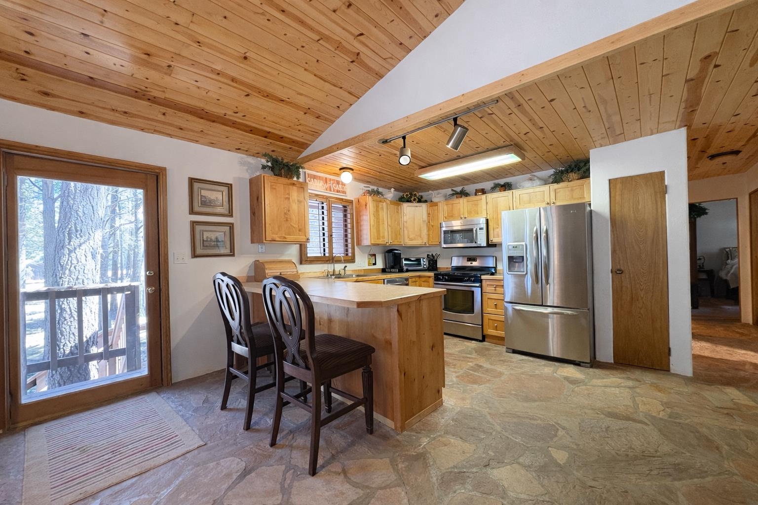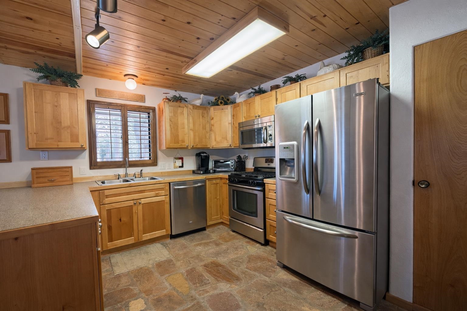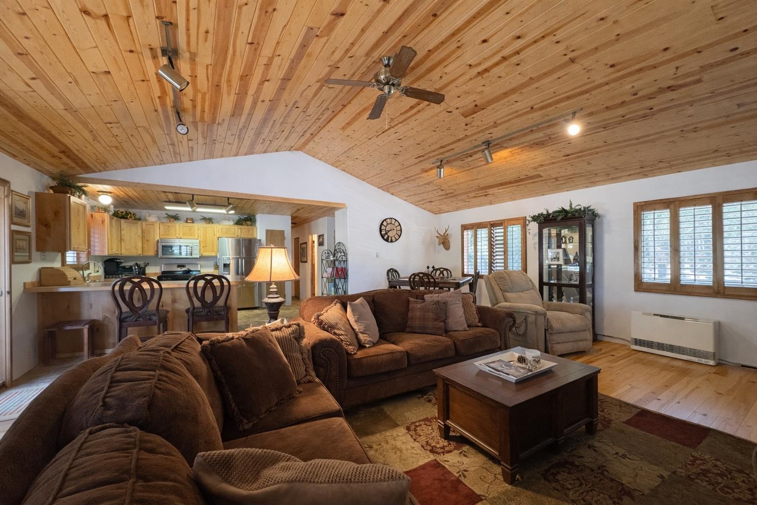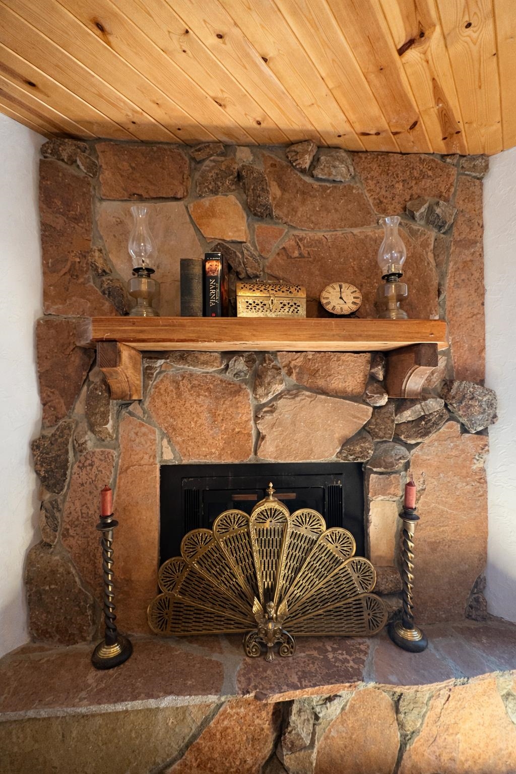 1 block from Monte Verde Lake! This adorable cabin is conveniently located, has 2 fireplaces, stone flooring, tongue & groove celings and great outdoor space! When you first walk in you are greeted by a great mud room area that leads into an open room where you'll find the kitchen, dining room and living room. The large stone fireplace is the highlight of this space! When you step outside onto the patio is a great covered porch and a sunny BBQ area. Further into the house, you follow the stone floor into a master bedroom with another stone fireplace! The property is a part of the Angel Fire Resort Membership, where you can enjoy a PGA golf course, down hill mountain biking park, ski resort, hiking trails, fishing and so much more!