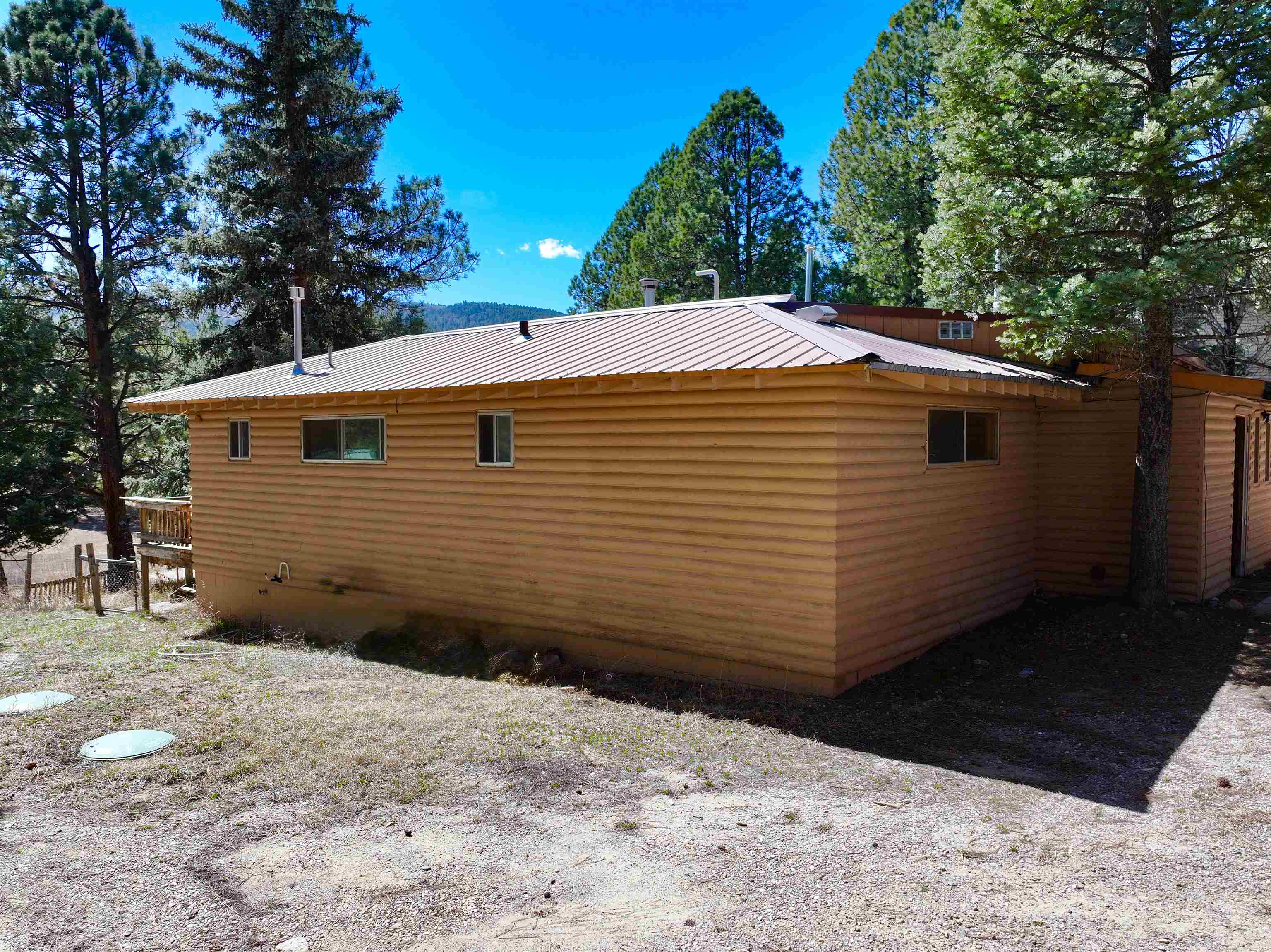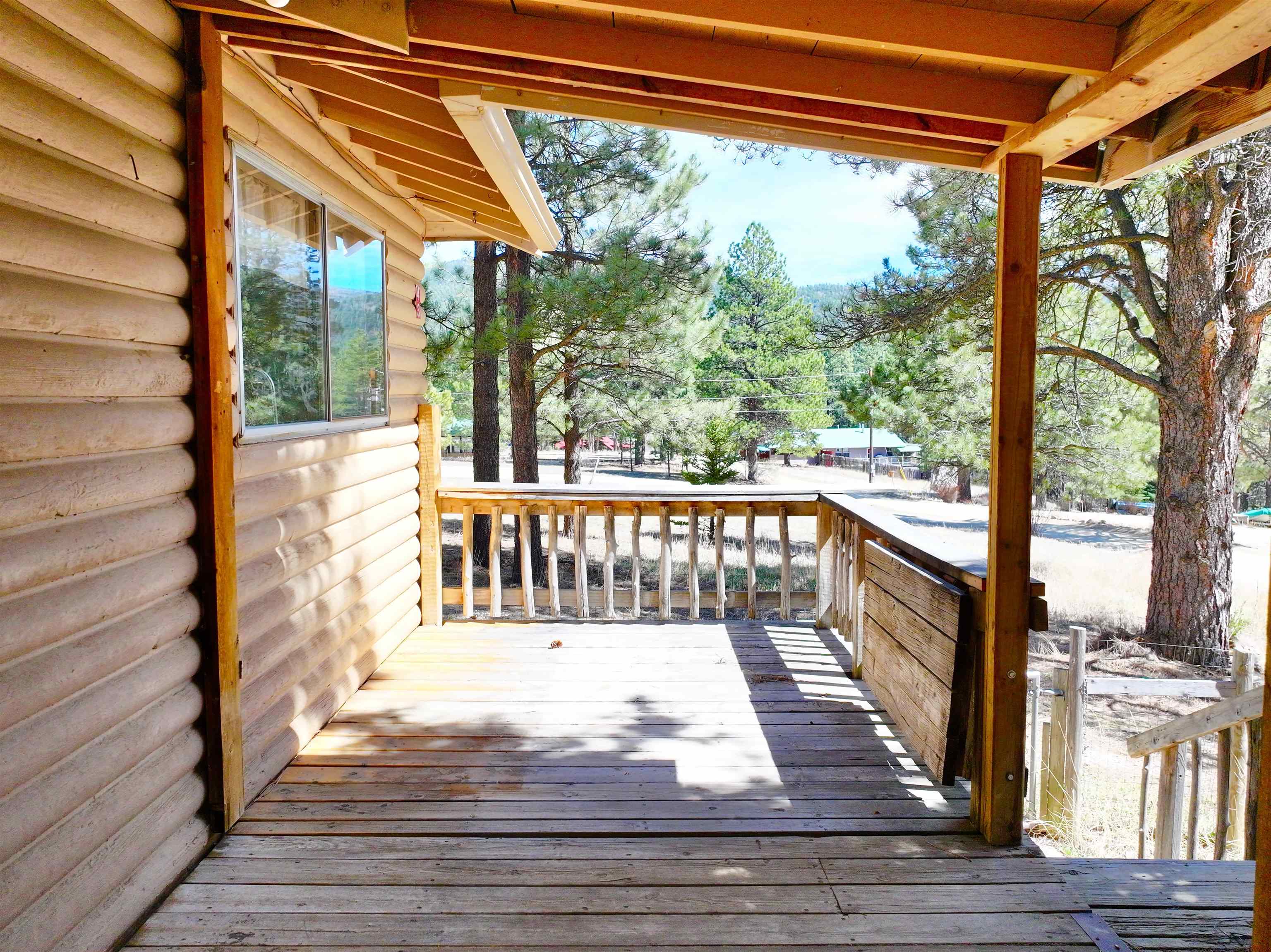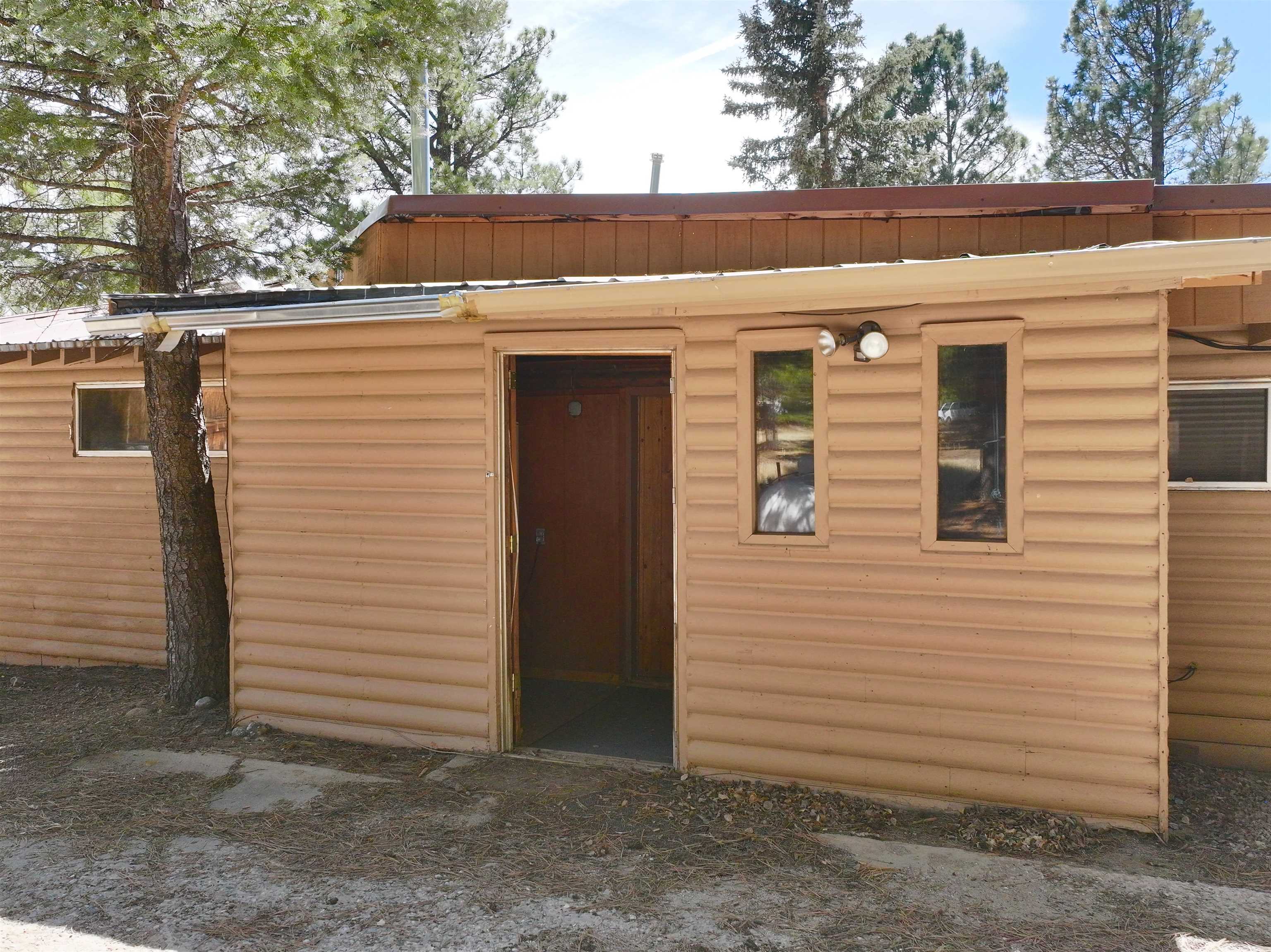 You have discovered your ideal retreat in the Valle Escondido Valley, a tranquil cabin nestled amidst the woods. This exceptional property offers a plethora of amenities, conveniently located near the Valle Escondido Golf Resort. Engage in activities such as fishing, hunting, hiking, sightseeing, mountain biking, ATV riding, and off-roading just to name a few. The home is about 25-30 minutes from Taos, about 20 minutes from Angel Fire and about 45 minutes from Red River. Perched on a gentle hillside, the property features two entry points. Upon entering, you have the option to park outside under the trees, inside a garage or in one of two carports. Upon entering the cabin from the north side, you are greeted by a foyer leading to a spacious living room with beautifully crafted pergo style wood flooring and wood finishes throughout, including a charming wood-burning stove. To your left, you will find a laundry room and a full bathroom equipped with double sinks. Continuing your exploration, you will discover another large living room adjacent to the kitchen, featuring a substantial rock/brick fireplace and another wood burning style gas stove. This area provides ample space for food preparation and entertaining. On the east side of the cabin, two bedrooms and a full bathroom are situated, offering cozy sleeping spaces that evoke the warmth and charm of a cabin setting. The cabin is heated by electric wall heaters, a fireplace, and a wood-burning style gas stove. The front of the cabin boasts a wooden deck that descends to the driveway. The garage also includes an additional heated space that can serve as extra sleeping quarters, a workshop, or storage area. Schedule an appointment today for a personalized tour of this exceptional property to determine if it aligns with your mountain retreat requirements. For more information for the Valle Escondido Homeowners Association, visit https://www.valleescondido.org.