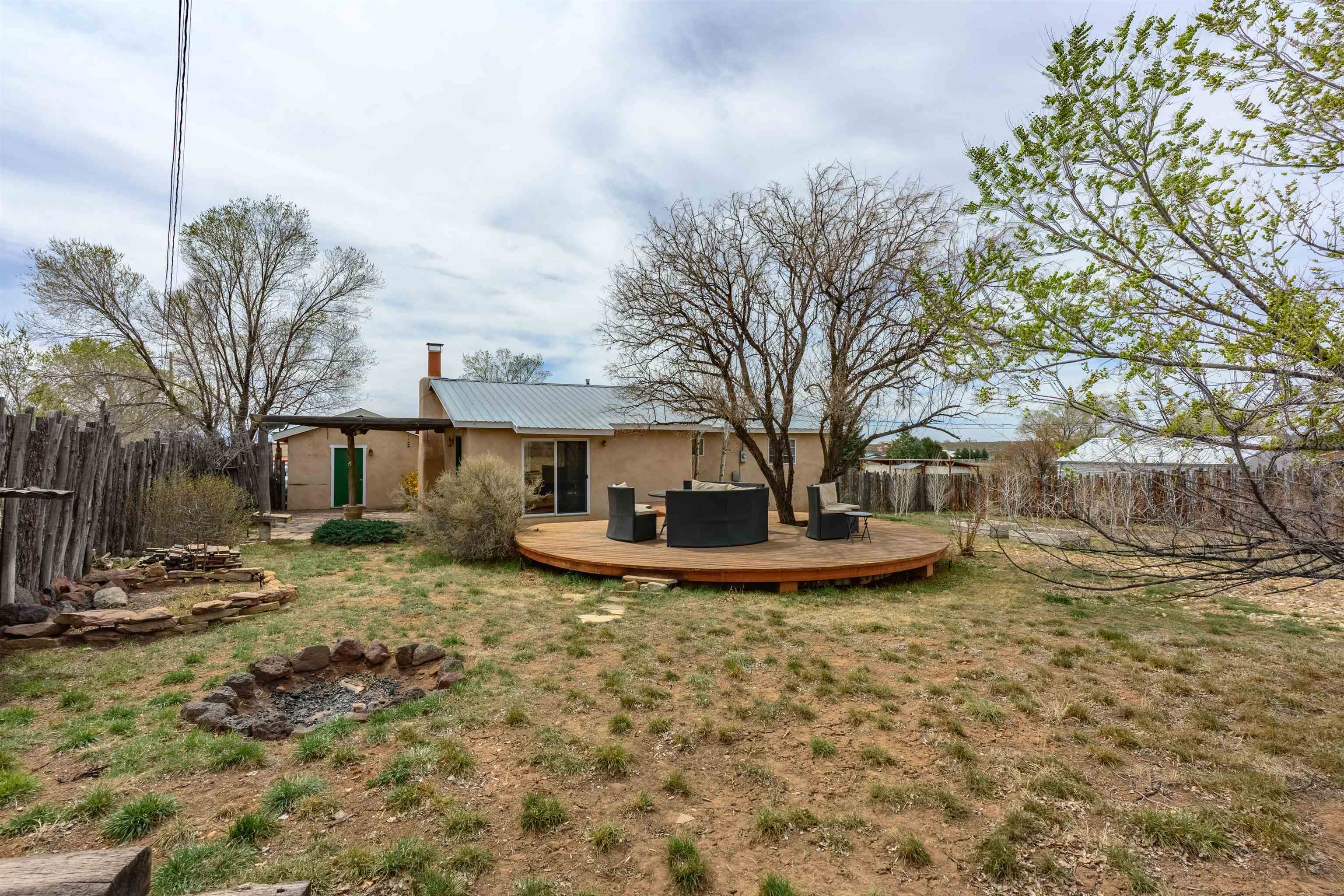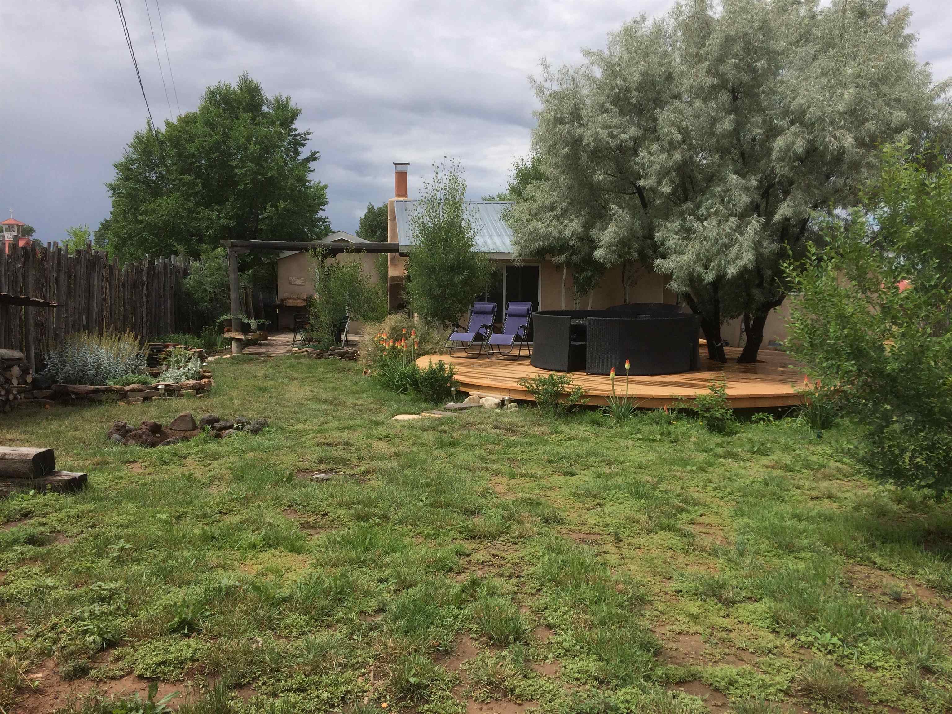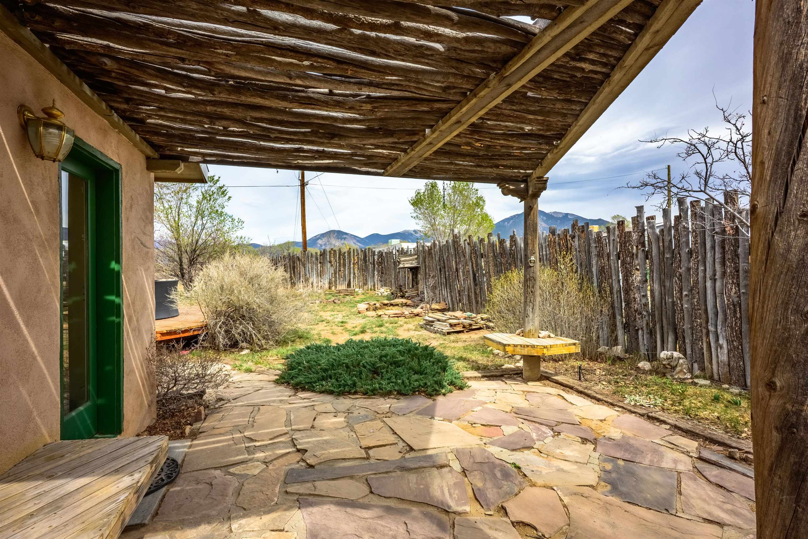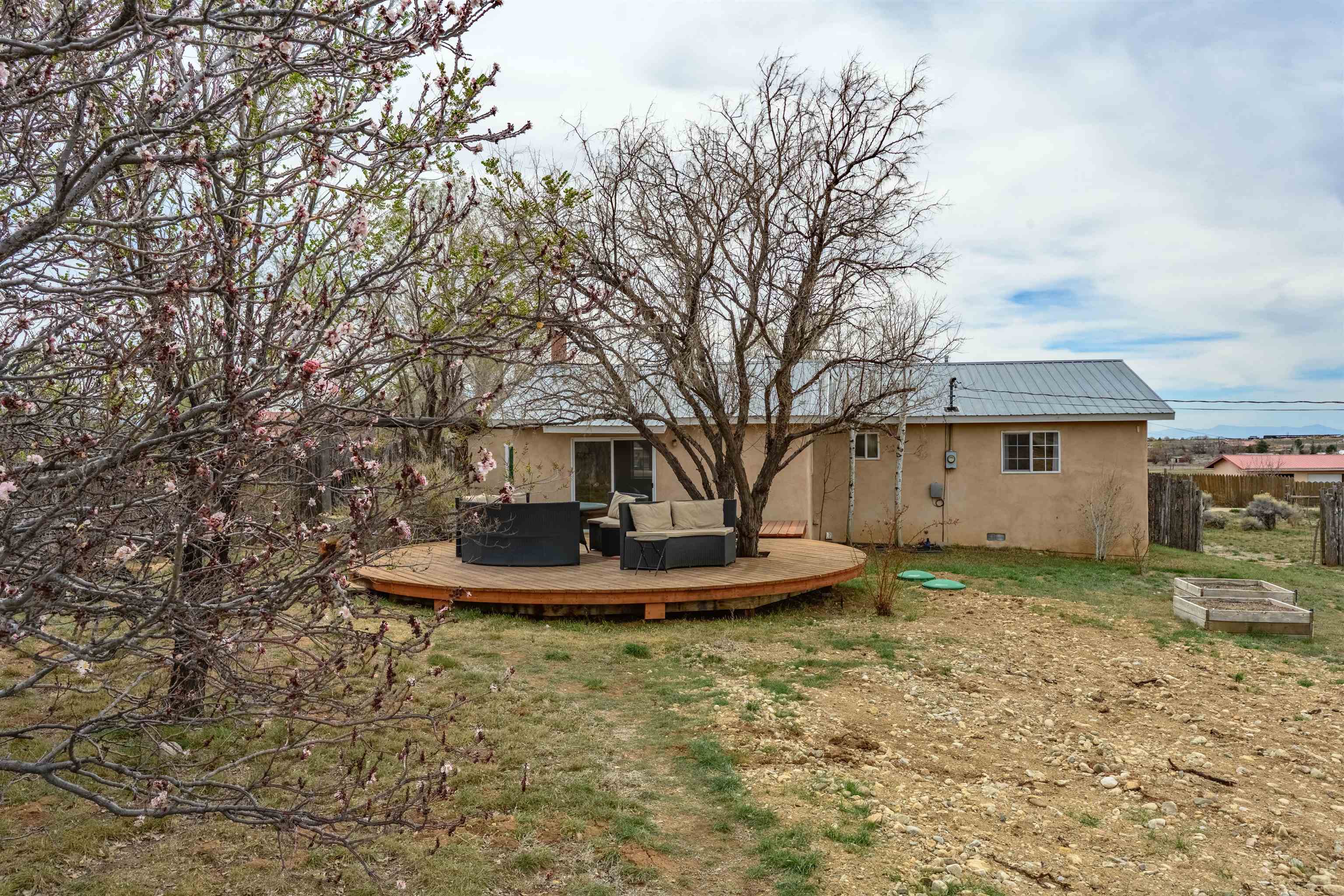 Near the end of a quiet road, across from "Little Santo Nino Church," is a special dwelling on 0.88 acres with young aspens and flowering bushes. The property has a front courtyard concealed behind a curved wall with large slate stepping stones that lead to a covered portal. Inside is an open living/dining area and a very festive cute kitchen. A large picture window and sliding glass doors provide lots of light, perfect for plants, and the stone fireplace will create warmth and ambiance for the humans. The home has two full bathrooms, one large bedroom, and two smaller rooms which can be used as an office, study, or spare bedroom. The driveway leads to a carport with an attached storage shed. Wooden fencing encloses the back yard creating a private sanctuary. At the center is a nature inspired elevated circular deck with a beautiful, sweetly scented olive tree umbrellaing over your party. This deck adds 500 sq ft of usable outdoor space. Entertain with the eight-seater Kontiki while enjoying those tasty fire-roasted meals, then kick back to observe the stars and feel the Great Cosmos. The yard has a tilled garden area, raised beds, and numerous fruit trees-apple, peach, plum, cherry, and produced over a thousand juicy apricots. Taos is known for its spectacular sunsets drawing artists from all over, as well as a deep history of spiritual groups, that congregate for the mystical experiences. Adventure enthusiasts come to ski, bike, and kayak, succumbing to the allure of Taos Mountain and the Gorge. Conveniently located; 15 minutes to the heart of Taos and 25 minutes to Taos Ski Valley or the Rio Grande. A brand-new septic system adds peace of mind and value. With its peaceful setting and inviting outdoor spaces, this property is a wonderful opportunity to enjoy the best of Taos living--schedule your showing today.