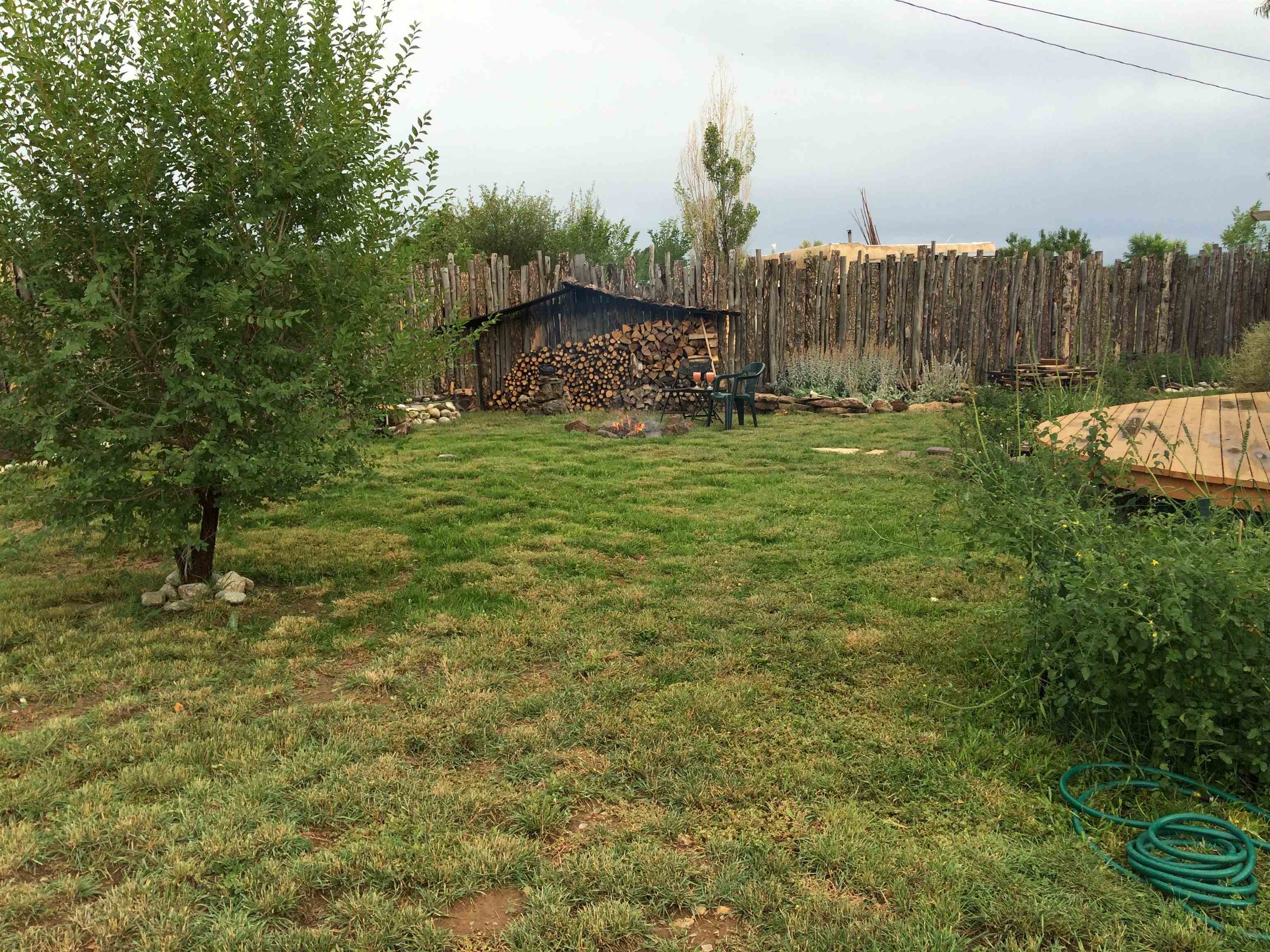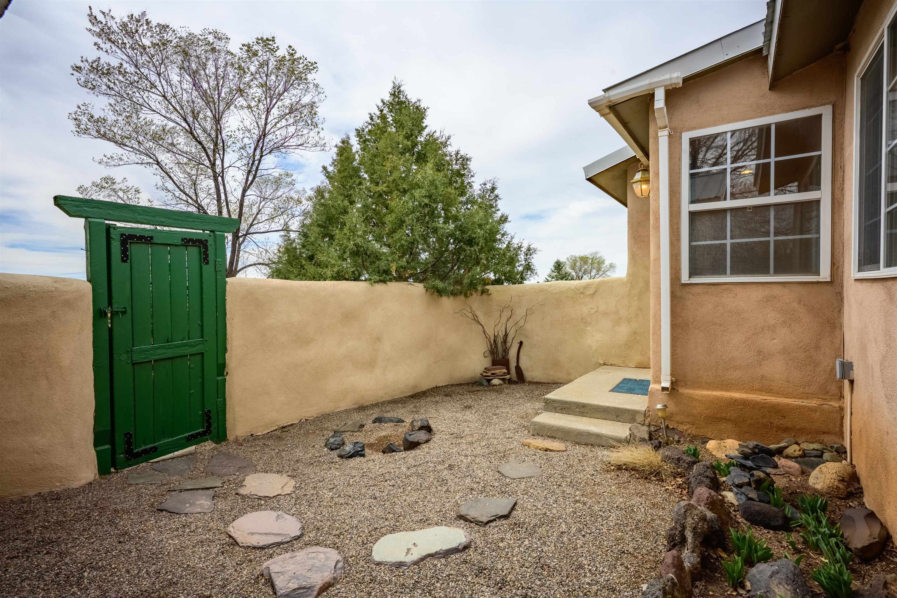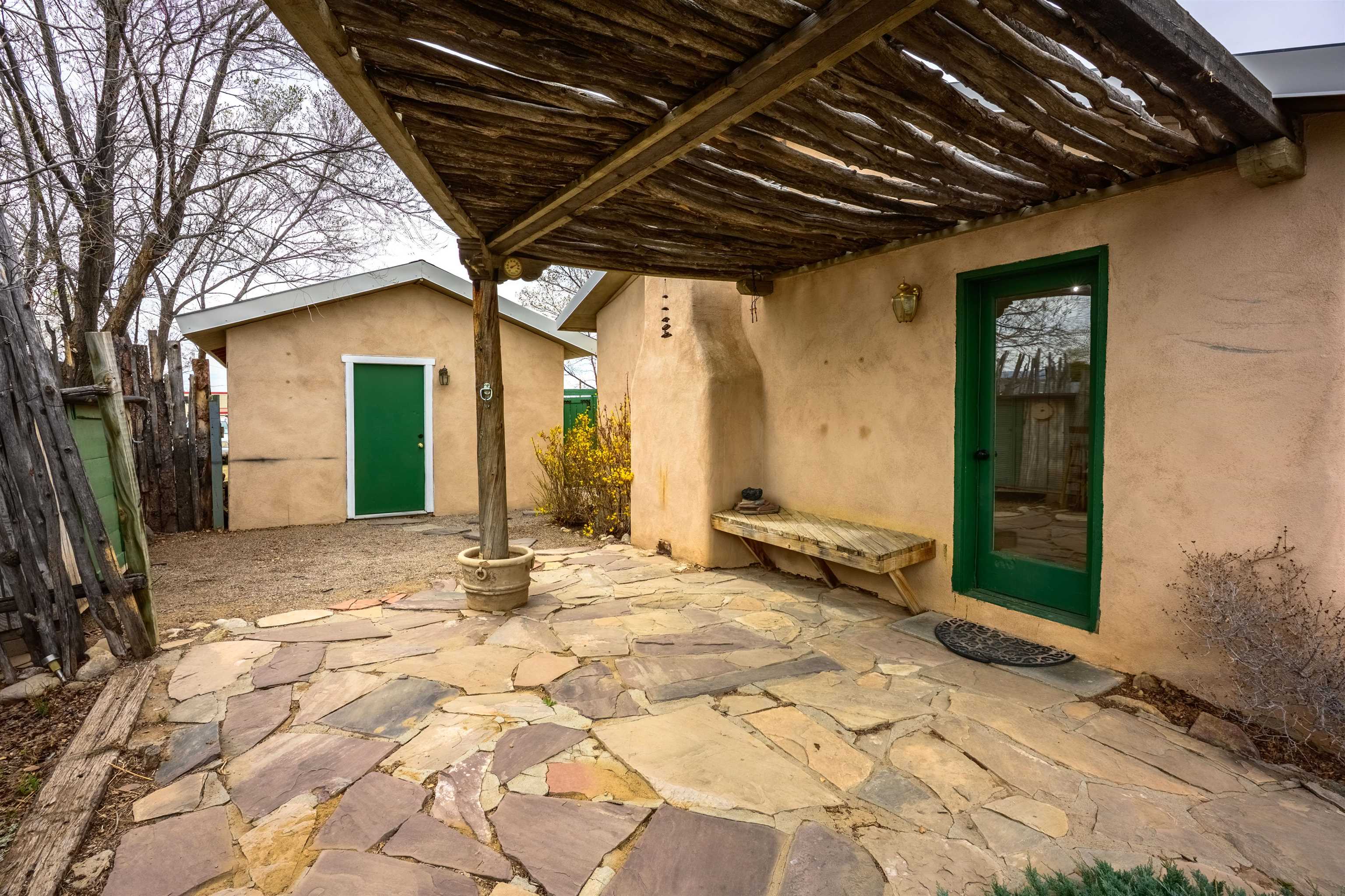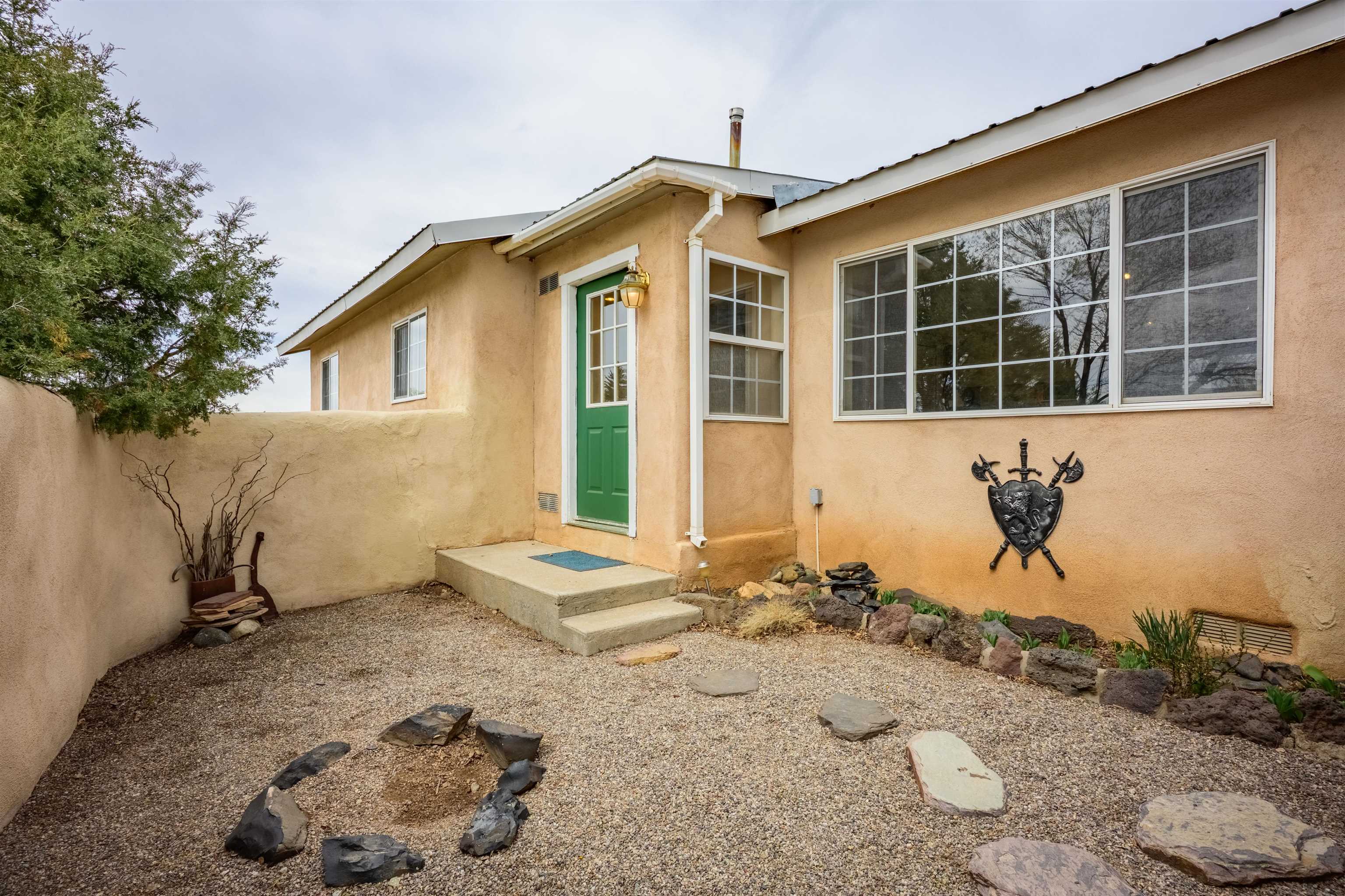 Near the end of a quiet road, across from "Little Santo Nino Church," is a special dwelling on 0.88 acres with young aspens and flowering bushes. The property has a front courtyard concealed behind a curved wall with large slate stepping stones that lead to a covered portal. Inside is an open living/dining area and a very festive cute kitchen. A large picture window and sliding glass doors provide lots of light, perfect for plants, and the stone fireplace will create warmth and ambiance for the humans. The home has two full bathrooms, one large bedroom, and two smaller rooms which can be used as an office, study, or spare bedroom. The driveway leads to a carport with an attached storage shed. Wooden fencing encloses the back yard creating a private sanctuary. At the center is a nature inspired elevated circular deck with a beautiful, sweetly scented olive tree umbrellaing over your party. This deck adds 500 sq ft of usable outdoor space. Entertain with the eight-seater Kontiki while enjoying those tasty fire-roasted meals, then kick back to observe the stars and feel the Great Cosmos. The yard has a tilled garden area, raised beds, and numerous fruit trees-apple, peach, plum, cherry, and produced over a thousand juicy apricots. Taos is known for its spectacular sunsets drawing artists from all over, as well as a deep history of spiritual groups, that congregate for the mystical experiences. Adventure enthusiasts come to ski, bike, and kayak, succumbing to the allure of Taos Mountain and the Gorge. Conveniently located; 15 minutes to the heart of Taos and 25 minutes to Taos Ski Valley or the Rio Grande. A brand-new septic system adds peace of mind and value. With its peaceful setting and inviting outdoor spaces, this property is a wonderful opportunity to enjoy the best of Taos living--schedule your showing today.