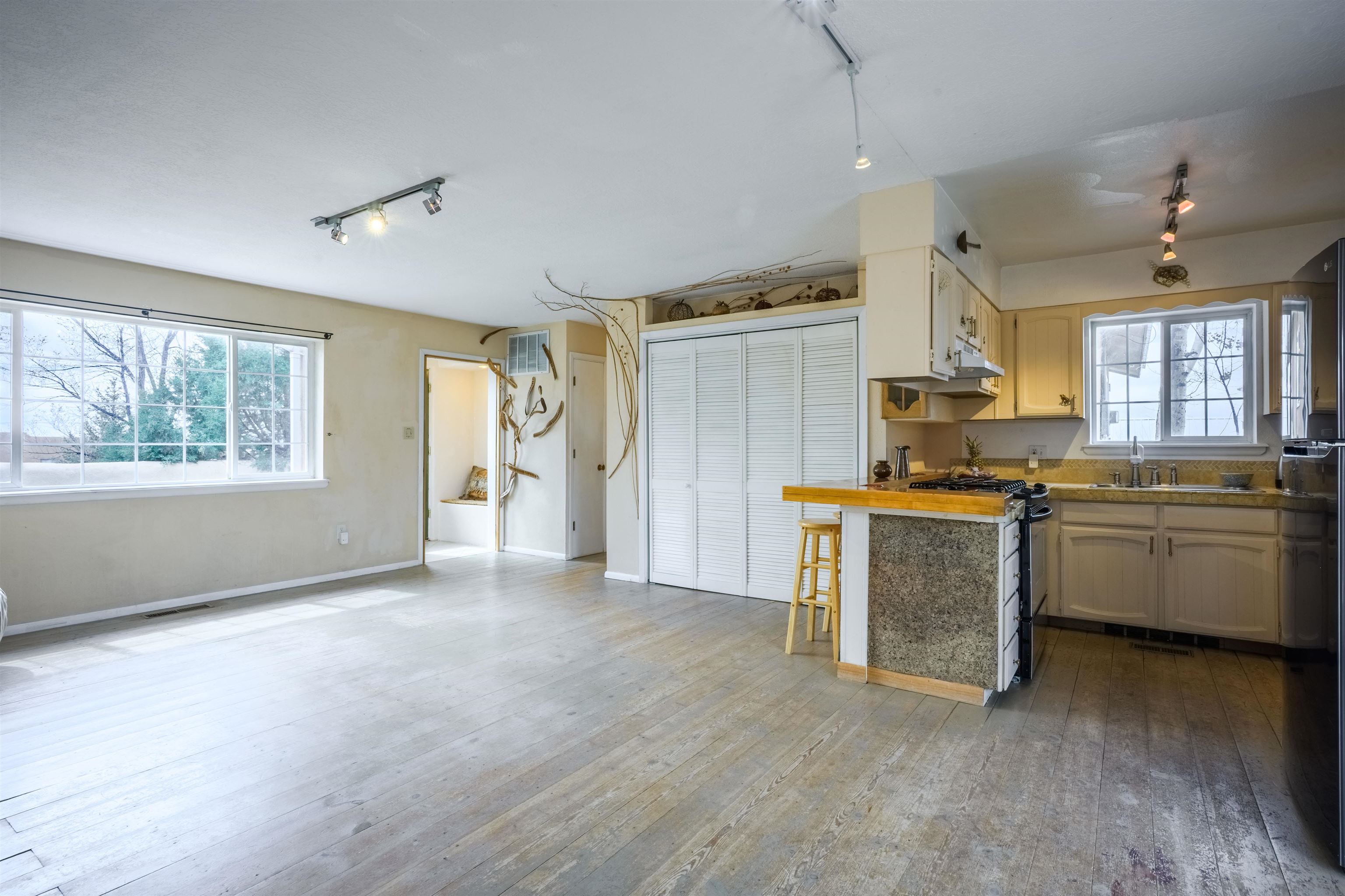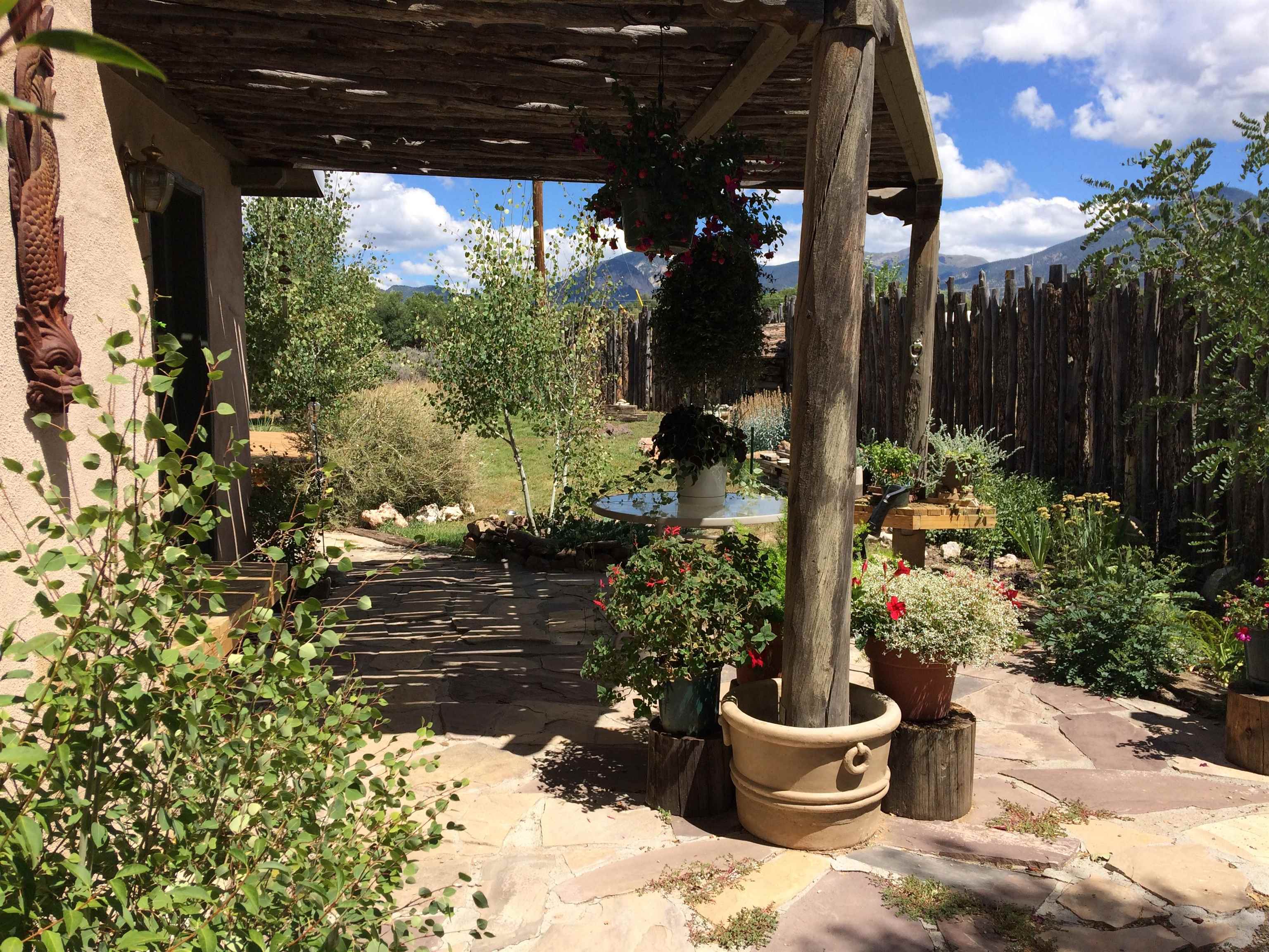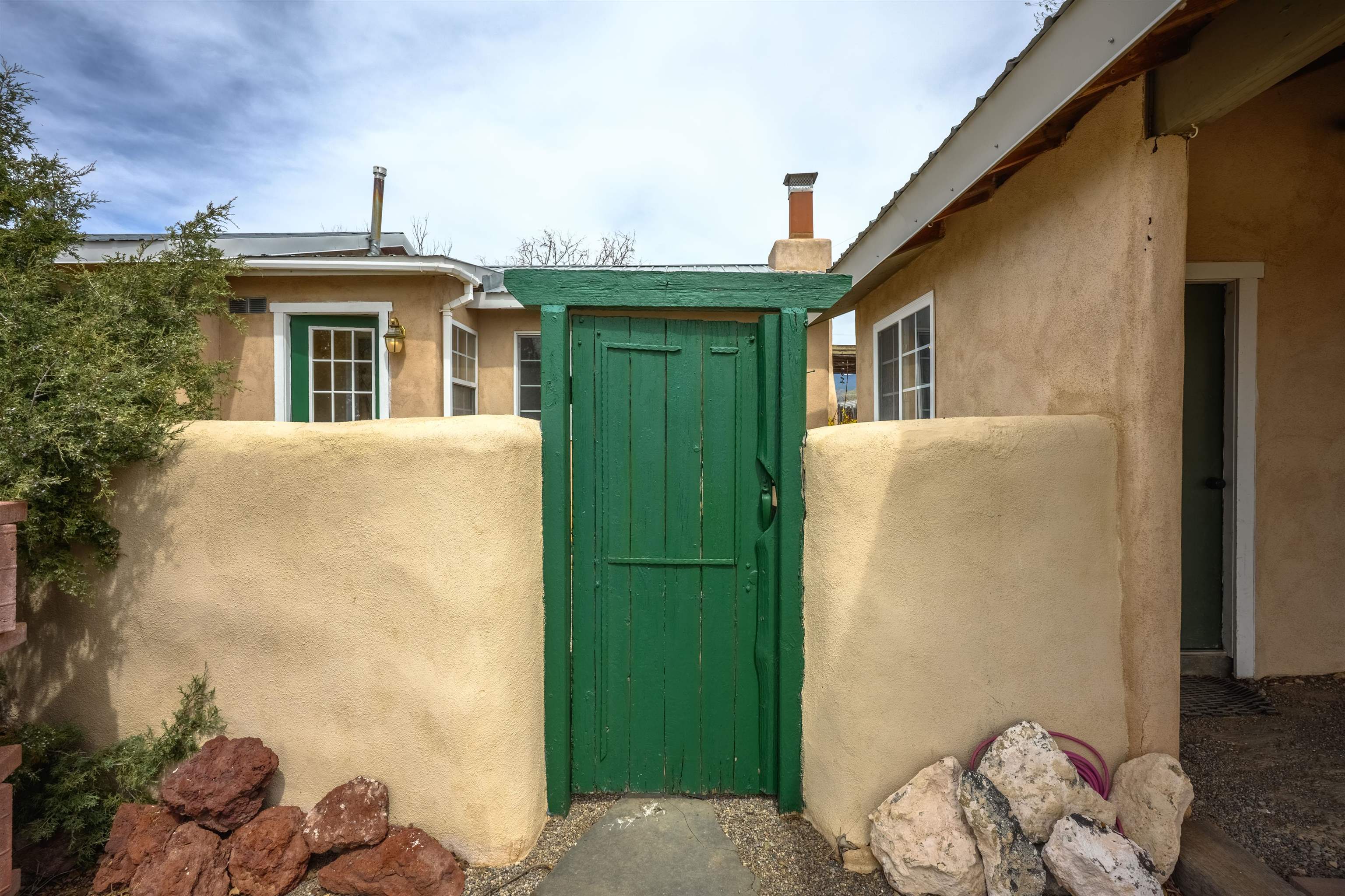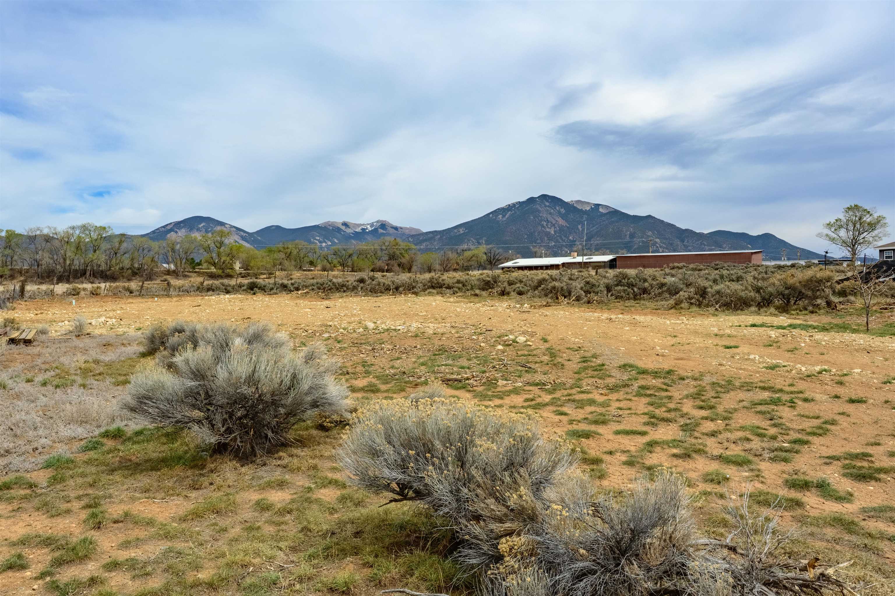 Near the end of a quiet road, across from "Little Santo Nino Church," is a special dwelling on 0.88 acres with young aspens and flowering bushes. The property has a front courtyard concealed behind a curved wall with large slate stepping stones that lead to a covered portal. Inside is an open living/dining area and a very festive cute kitchen. A large picture window and sliding glass doors provide lots of light, perfect for plants, and the stone fireplace will create warmth and ambiance for the humans. The home has two full bathrooms, one large bedroom, and two smaller rooms which can be used as an office, study, or spare bedroom. The driveway leads to a carport with an attached storage shed. Wooden fencing encloses the back yard creating a private sanctuary. At the center is a nature inspired elevated circular deck with a beautiful, sweetly scented olive tree umbrellaing over your party. This deck adds 500 sq ft of usable outdoor space. Entertain with the eight-seater Kontiki while enjoying those tasty fire-roasted meals, then kick back to observe the stars and feel the Great Cosmos. The yard has a tilled garden area, raised beds, and numerous fruit trees-apple, peach, plum, cherry, and produced over a thousand juicy apricots. Taos is known for its spectacular sunsets drawing artists from all over, as well as a deep history of spiritual groups, that congregate for the mystical experiences. Adventure enthusiasts come to ski, bike, and kayak, succumbing to the allure of Taos Mountain and the Gorge. Conveniently located; 15 minutes to the heart of Taos and 25 minutes to Taos Ski Valley or the Rio Grande. A brand-new septic system adds peace of mind and value. With its peaceful setting and inviting outdoor spaces, this property is a wonderful opportunity to enjoy the best of Taos living--schedule your showing today.