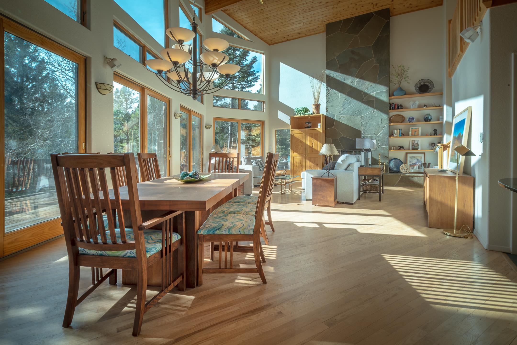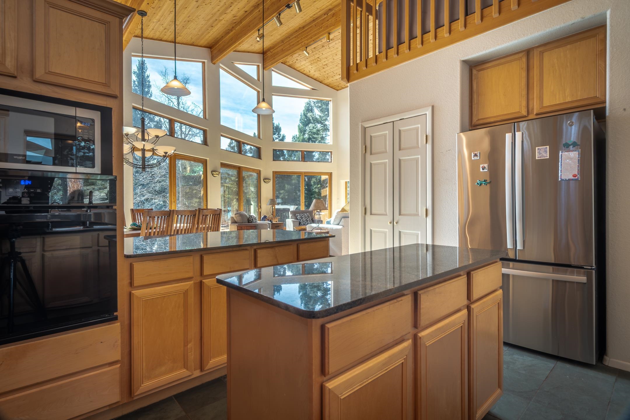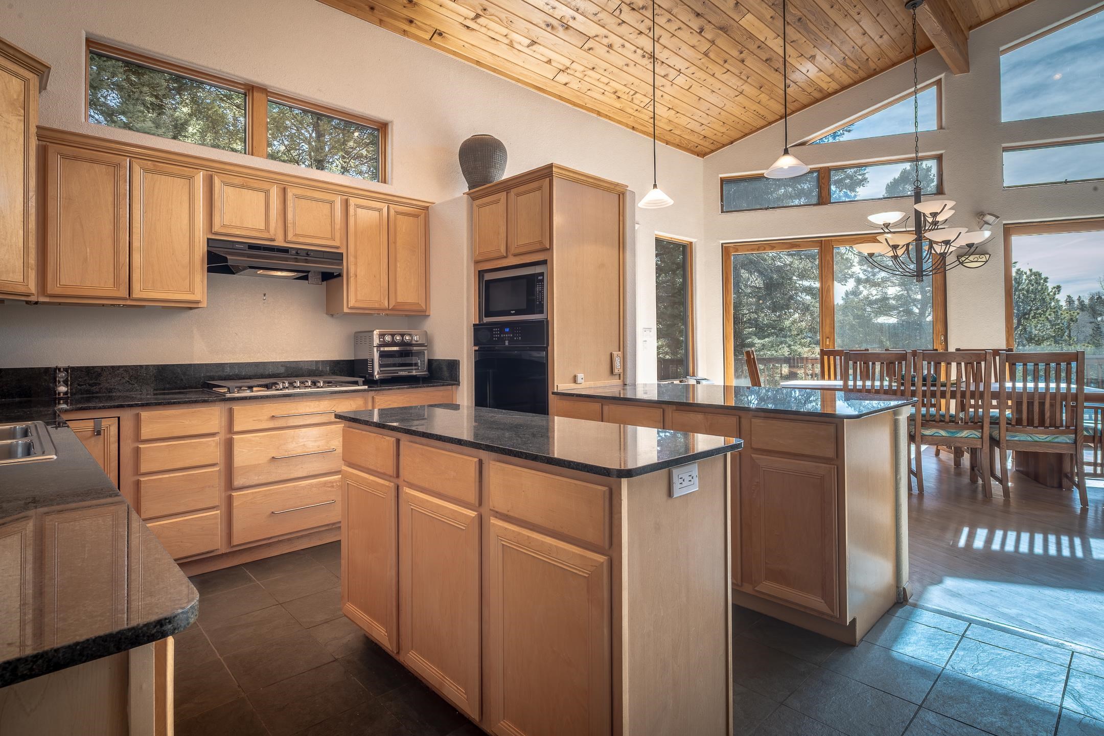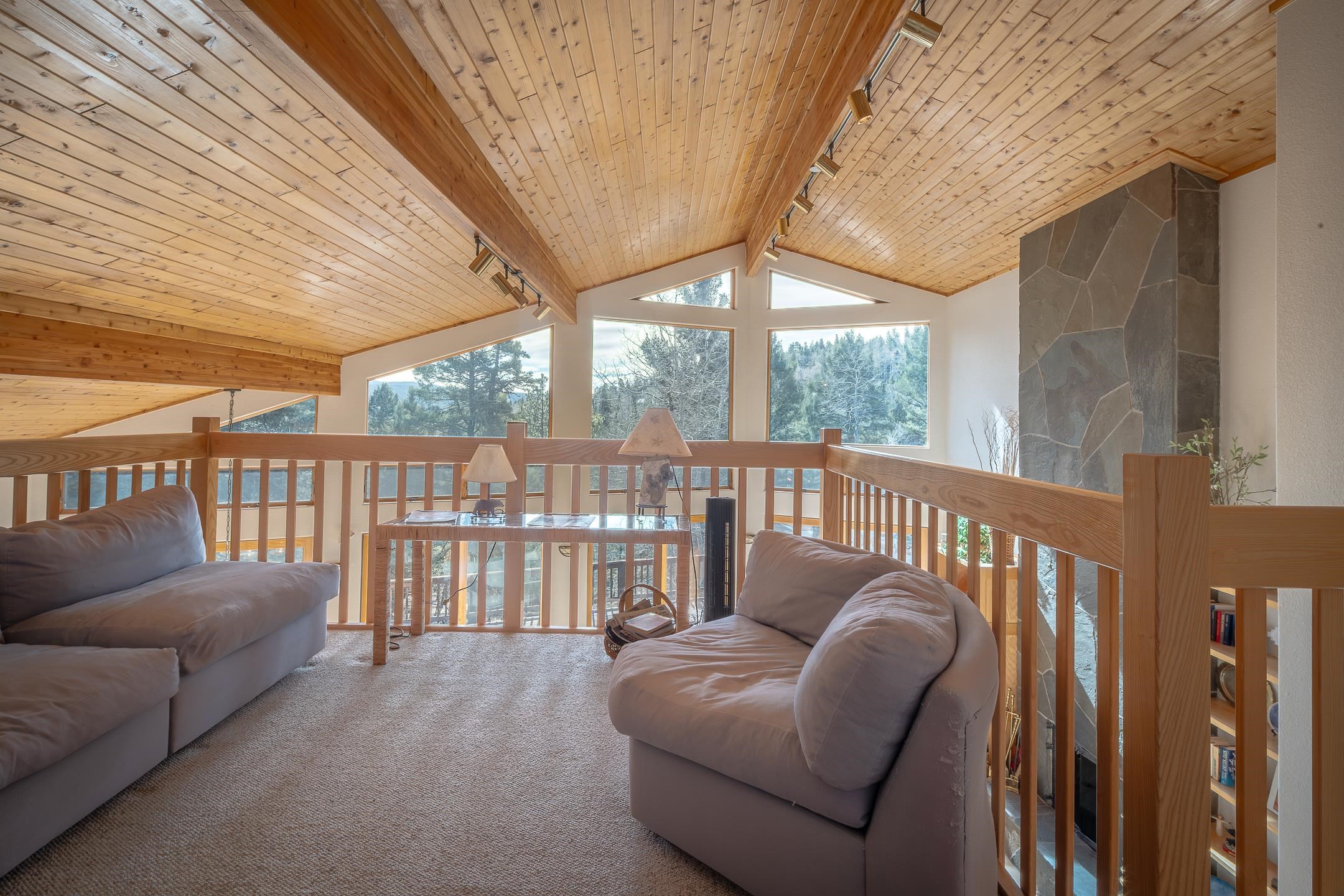 Custom built home with mountain views. The open living, dining, and kitchen area features soaring tongue-and-groove ceilings with large beams, hardwood floors, and a dramatic floor-to-ceiling slate wood-burning fireplace. Spacious living room features a wall of glass with sliding and French doors opening to a large outdoor living area. The kitchen includes maple cabinets, a center island, and black granite countertops. This home offers primary suites on both the main and upper levels, including a main-level suite with a two-story wood-burning fireplace and wall of windows overlooking the aspens. Plus, there is a private office space with high-speed internet to make working from home simple & convenient. There is a bonus suite in garage with its own bathroom. Additional features include an oversized two-car garage with work tables and shelves, a large jacuzzi room and an extra storage room.