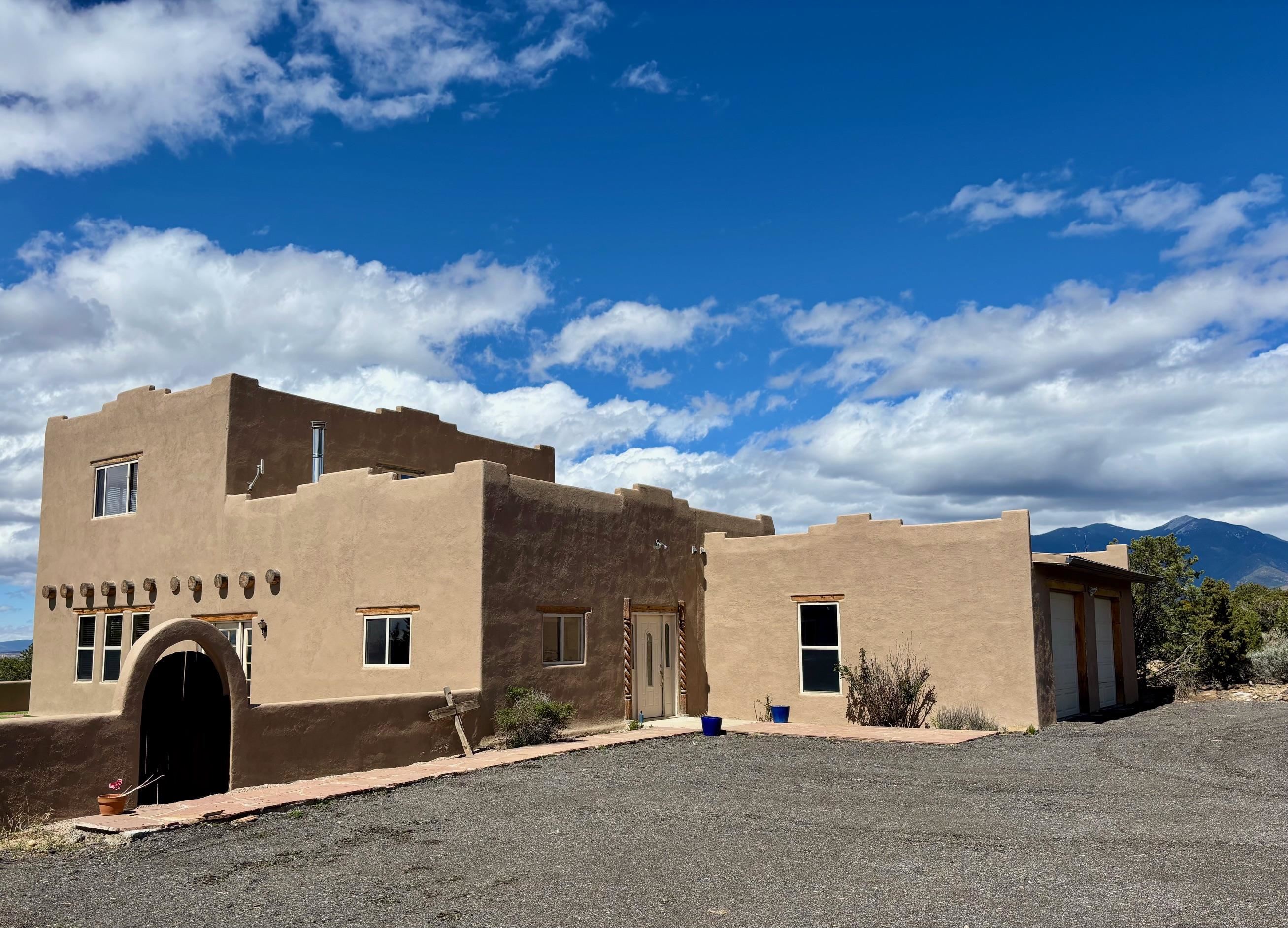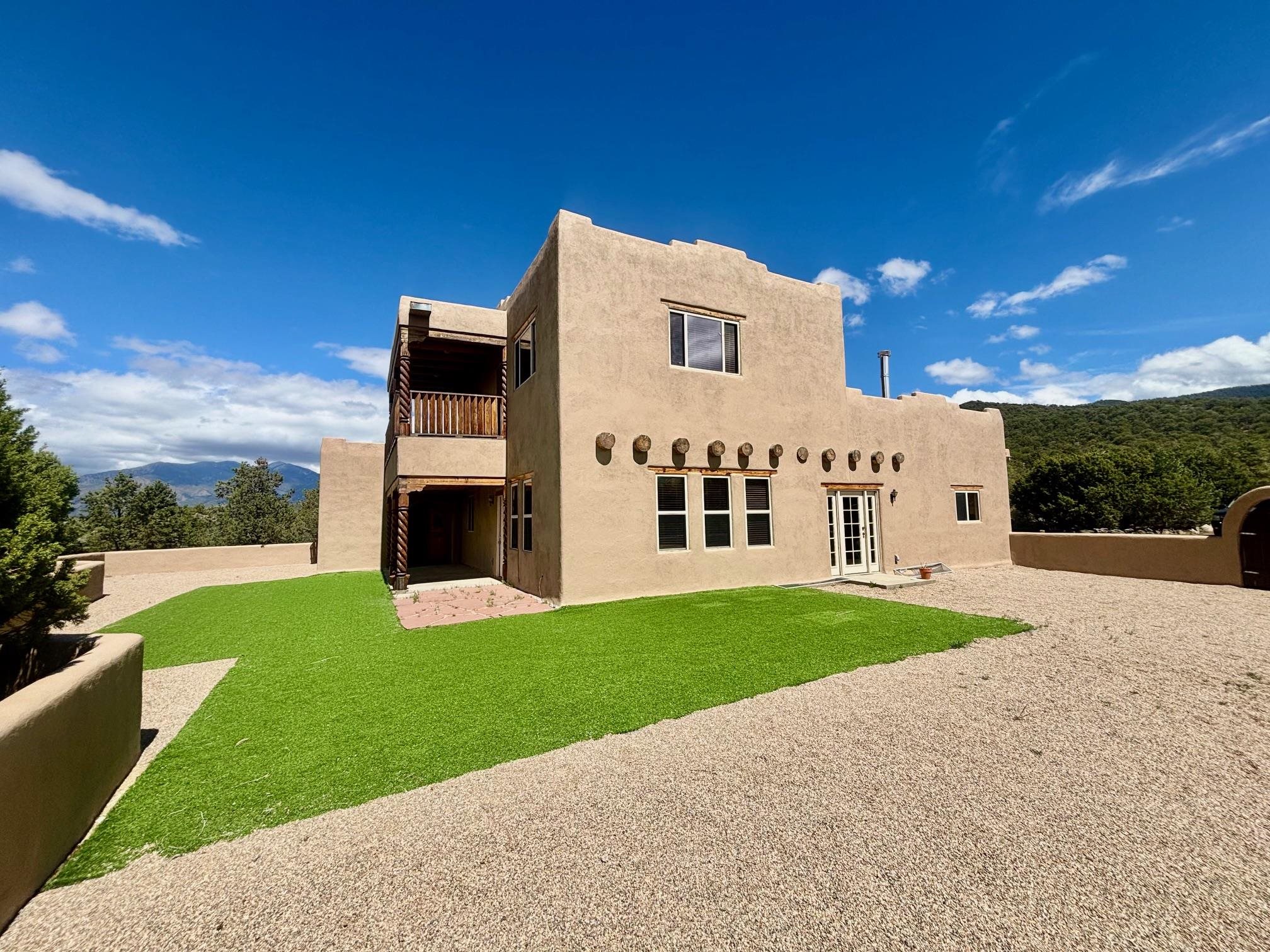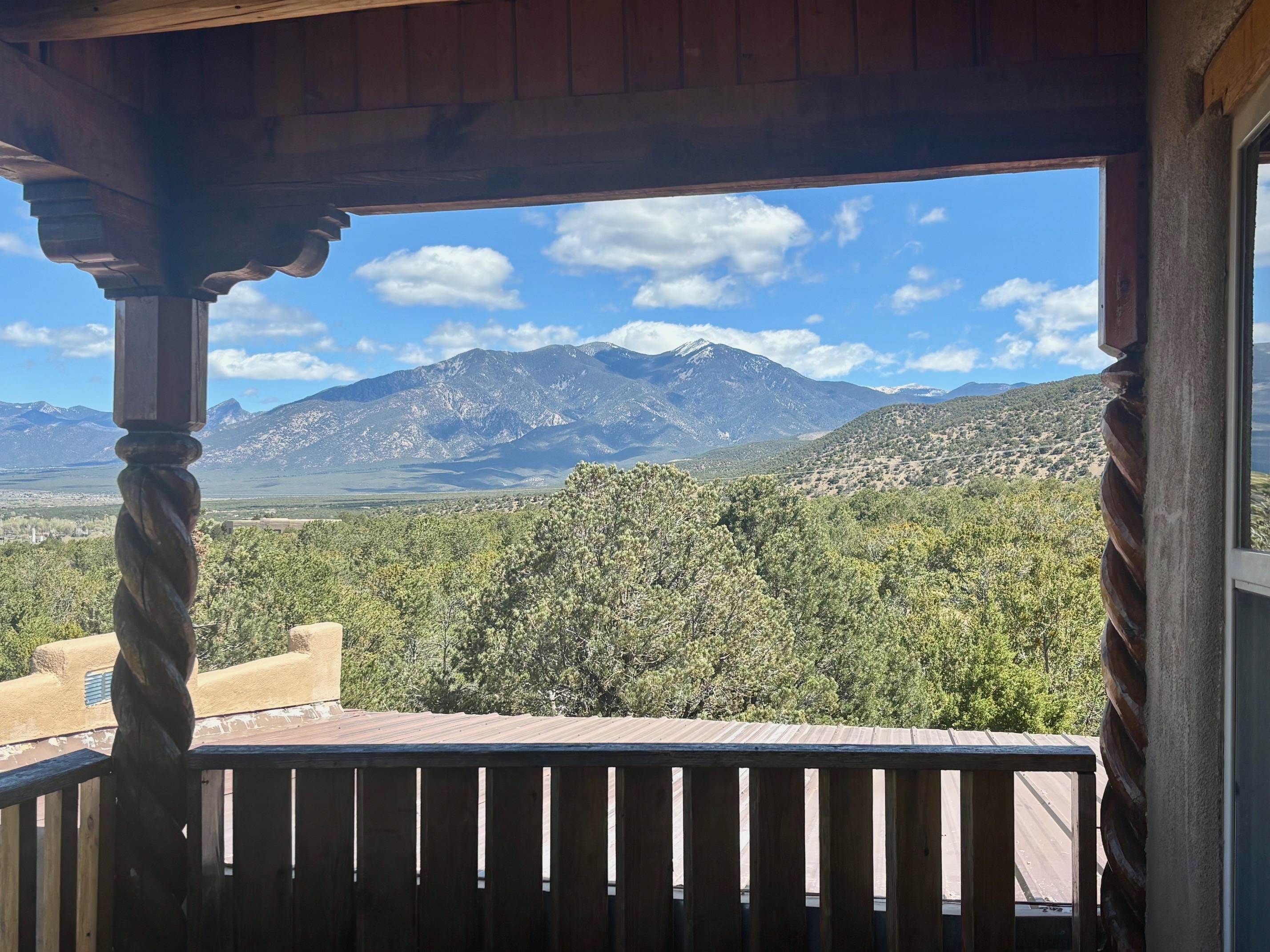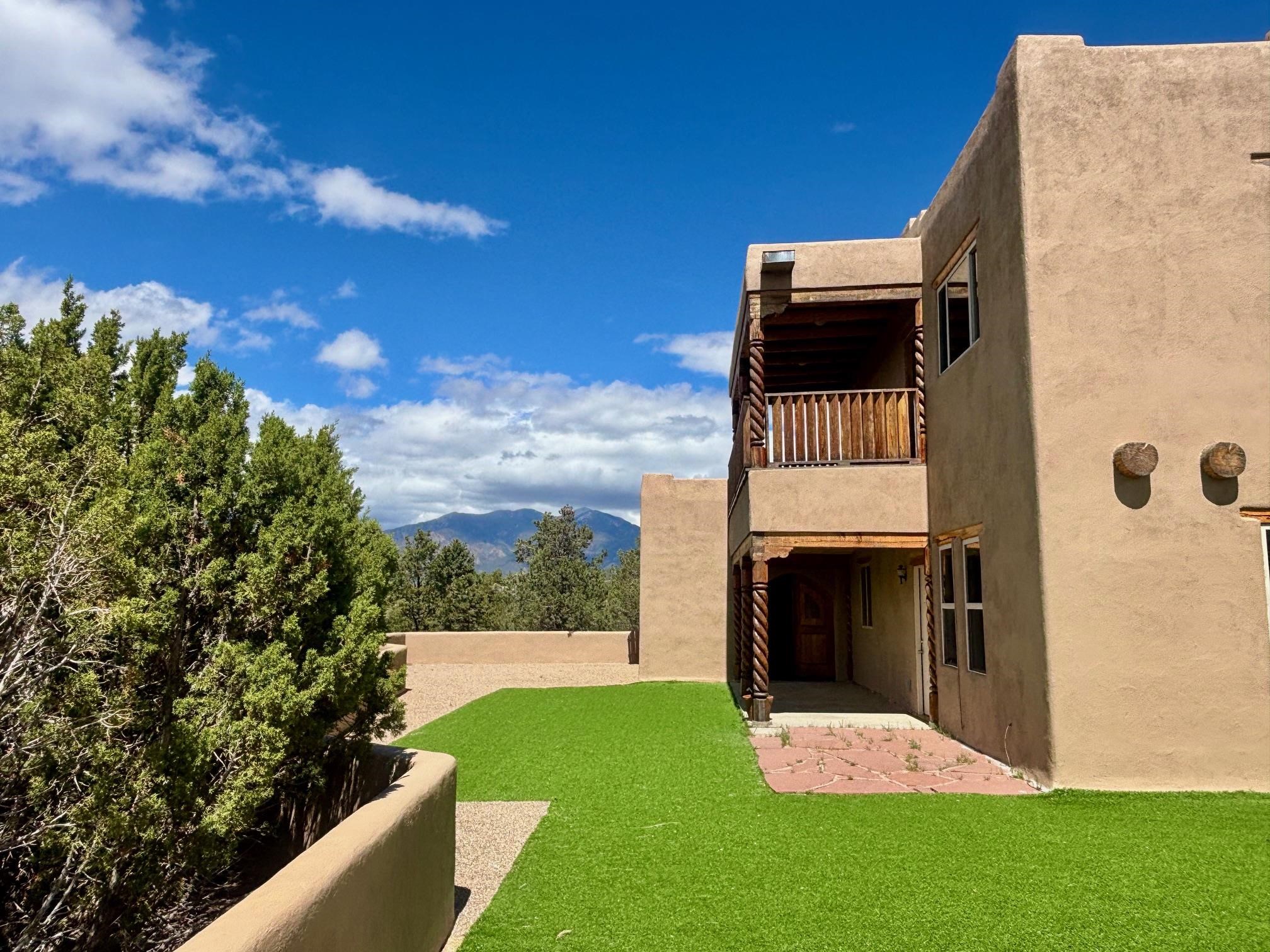 Featuring a 3-bedroom, 3-bathroom house nestled at the base of the Weimer foothills. Has ample living space with 3,026 square feet. The living room is comfortable and relaxed. The dining room is spacious. The kitchen is semi-private. The house has stainless steel appliances. The ceilings have vigas and tongue and groove wood. Some rooms have just tongue and grove. The house has diamond finish plaster. Attached to the house is an oversized two-car garage. The landscaping is amazing featuring several court yards and many trees. The back/side yard have artificial turf. Weimer is a highly desirable neighborhood for many reasons, among which are the sublime panoramic views. This house is located close the hospital and medical plaza and all the amenities the Town of Taos has to offer, including shopping, dining, galleries, and museums. This house enjoys the most amazing views of Taos Mountain along with superb views of the majestic Taos sunsets from the upper deck. All this on 2.99 acres of forested land. This house is very private and secluded. The private road to the house has pavement millings ensuring no dust. The last five pictures were taken from the primary bedroom upstairs deck. Amazing views, amazing views, amazing views.!!!