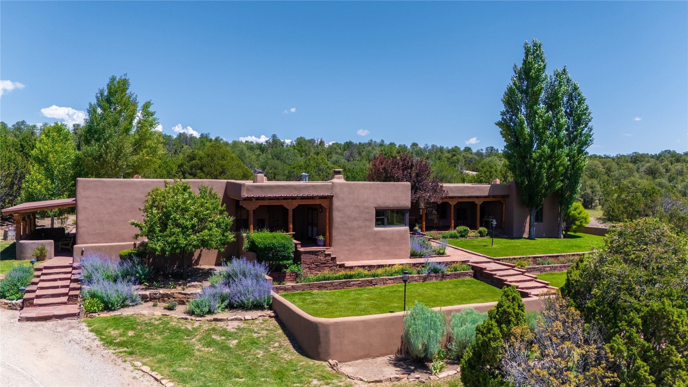 BREATHTAKING SANTA FE STYLE WITH SUNSET VIEWS. Perched on 2.5 acres with unobstructed views of the Western Jemez Mountains, this home was designed with PATTERN LANGUAGE principles in mind including multiple arches that visually repeat throughout the home. This 4-bedroom, 4-bathroom residence (including detached guest house built in 2016) offers the best of Southwestern living with intentional design. Prull Custom Builders built this residence in 2009 for the current owners and the home is sited perfectly to capture glorious sunsets and the dramatic New Mexico landscape, all while blending seamlessly into its natural surroundings. The floor plan ensures excellent separation between the primary suite and guest room, with soaring ceilings, vigas & beams, plastered walls, and abundant natural light throughout. The spacious living room flows to a large sunny gourmet kitchen with multiple granite countertops, a huge island, generous cabinetry, and vistas of the mountains beyond. Radiant in-floor heating and mini-splits provide year-round comfort, while a fully paid Positive Energy solar system keeps electricity costs minimal! The main garage is equipped with EV charging support. Outdoor living is equally inviting with covered portals, brick paver patios, a fireplace, and flagstone paths leading to the guest house - complete with its own garage for added privacy. The landscaped grounds include a fenced backyard for pets and a charming side garden, offering a balance of beauty and function. Free from HOA restrictions, with a newer paved road, privacy and coveted location, this property is an exceptional blend of style, sustainability, and Santa Fe charm.